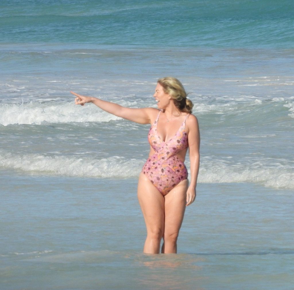 A estrela de reality Frankie Essex é vista na praia enquanto aproveita uma pausa ensolarada em Lanzarote, 19/02/2020. Frankie exibe suas curvas em um maiô azul com flores enquanto se diverte em um balanço na praia. The Only Way Is Essex está em negociações para trazer de volta ex-membros do elenco para uma nova série chamada TOWIE OG’s.