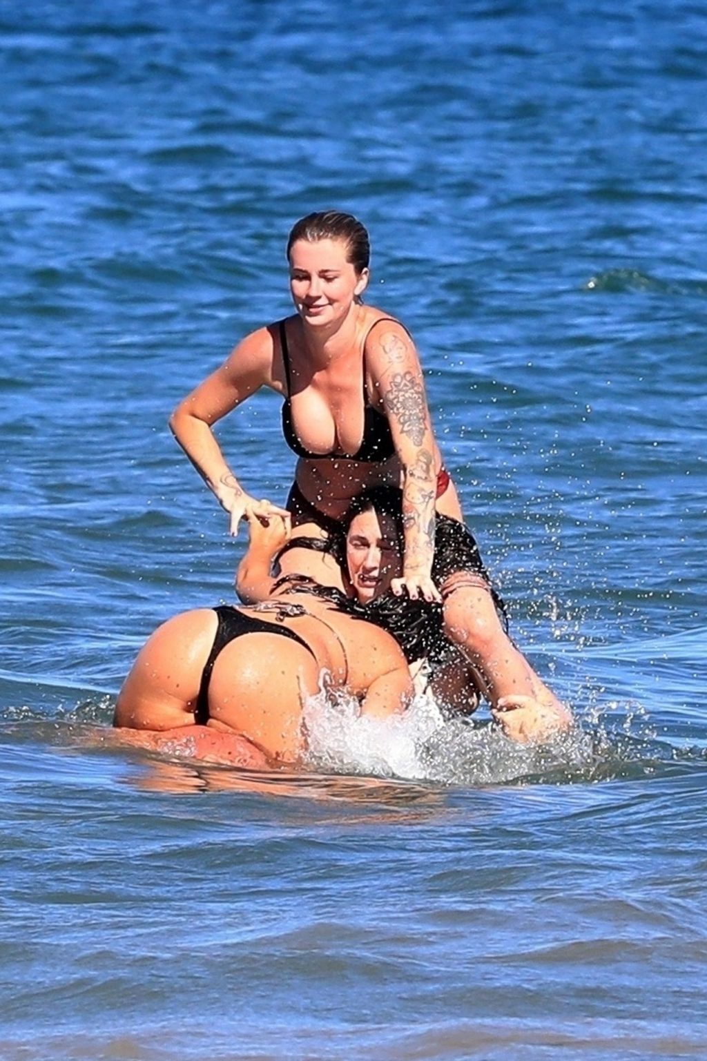 Ireland Baldwin exibe suas curvas enquanto passa um dia divertido na praia com seus amigos, bebendo, jogando vôlei e surfando – Malibu, 19/07/2020. A modelo não correu riscos e cuidadosamente aplicou protetor solar nos seios antes de sair para se divertir.