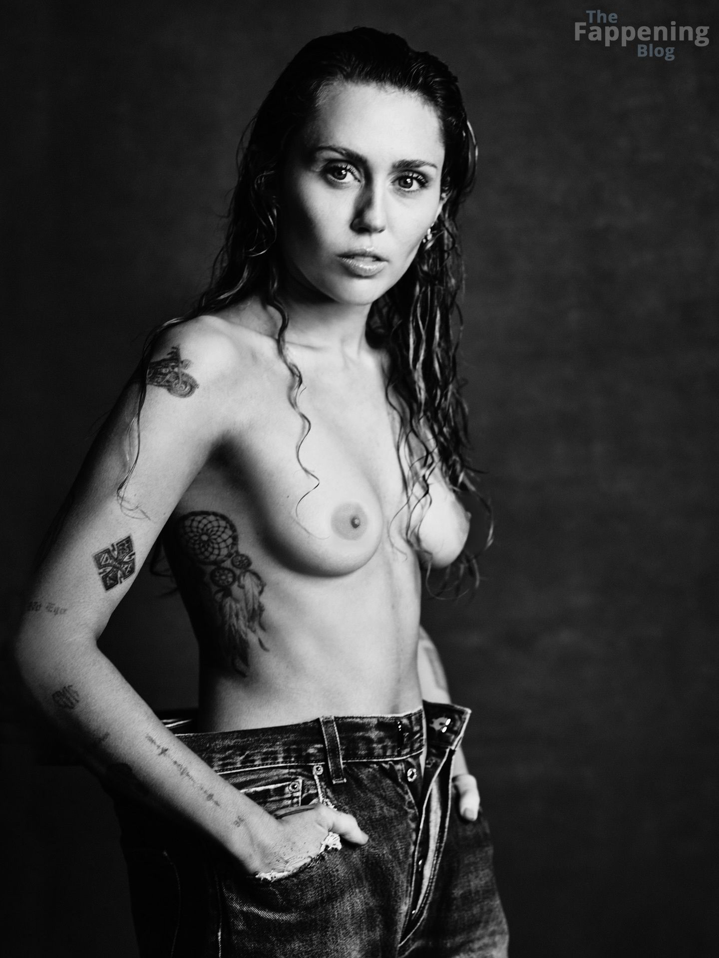 A estrela do Fappening Miley Cyrus mostra seus seios nus na foto vazada colorida abaixo.