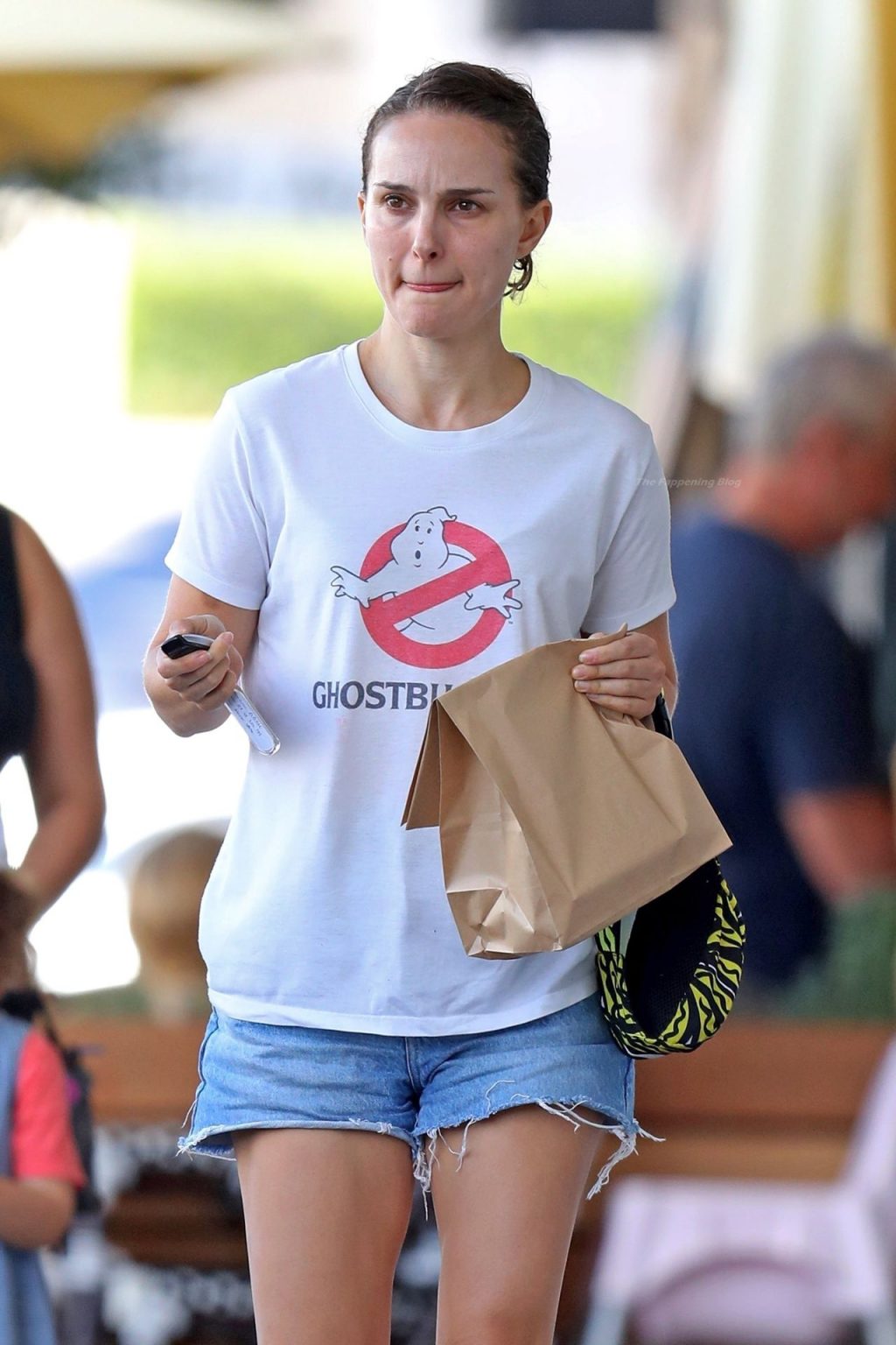 Quem você vai chamar! A atriz Natalie Portman parece casual e na moda enquanto é fotografada fazendo algumas tarefas em Sydney, vestindo uma camiseta legal dos Caça-Fantasmas com shorts jeans e uma pochete amarela e preta estampada!