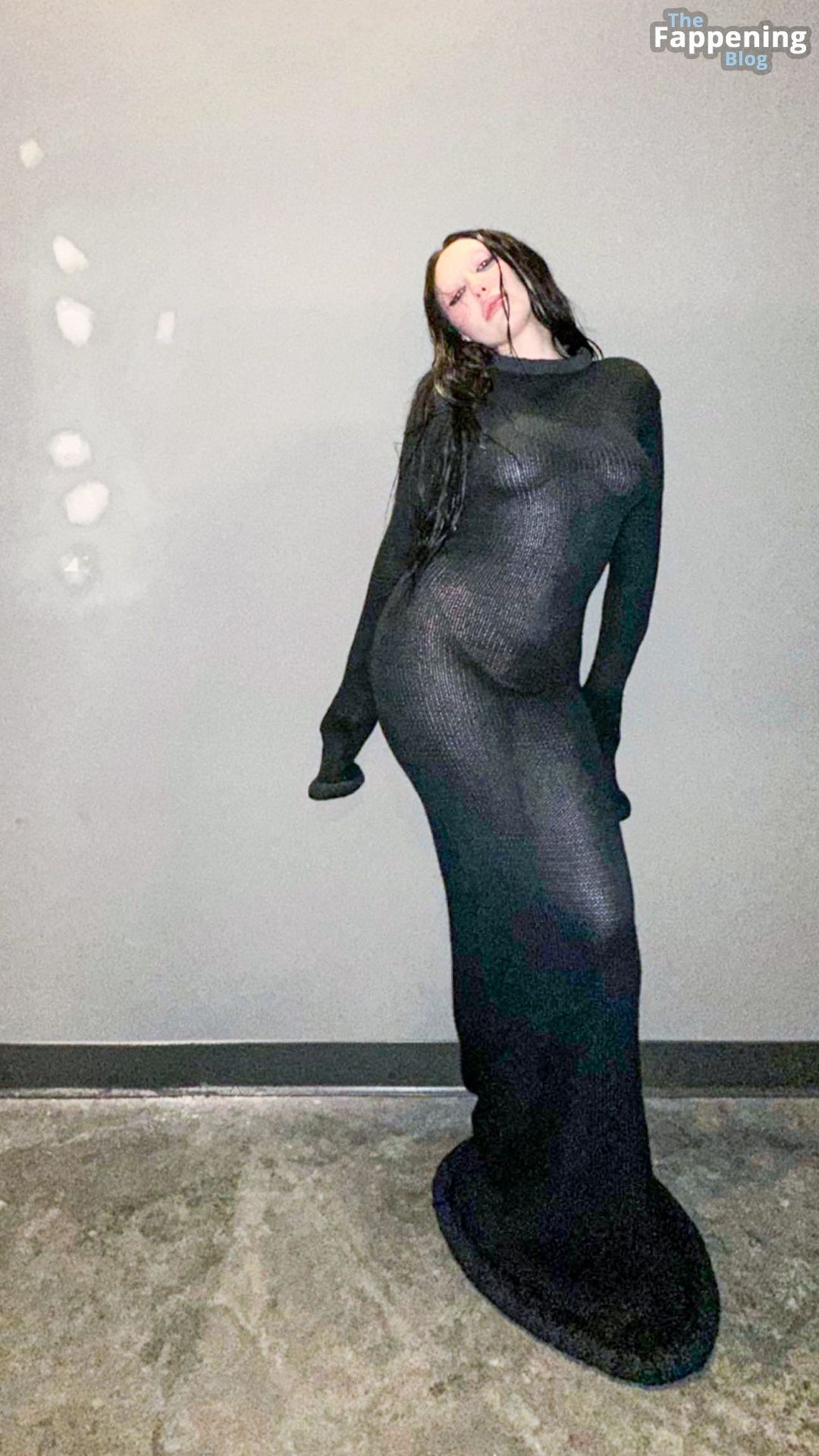 Noah Cyrus está arrasando, usando um vestido preto ousado e transparente sem sutiã, exibindo seus atributos generosos e um bumbum incrível enquanto posa contra uma parede.