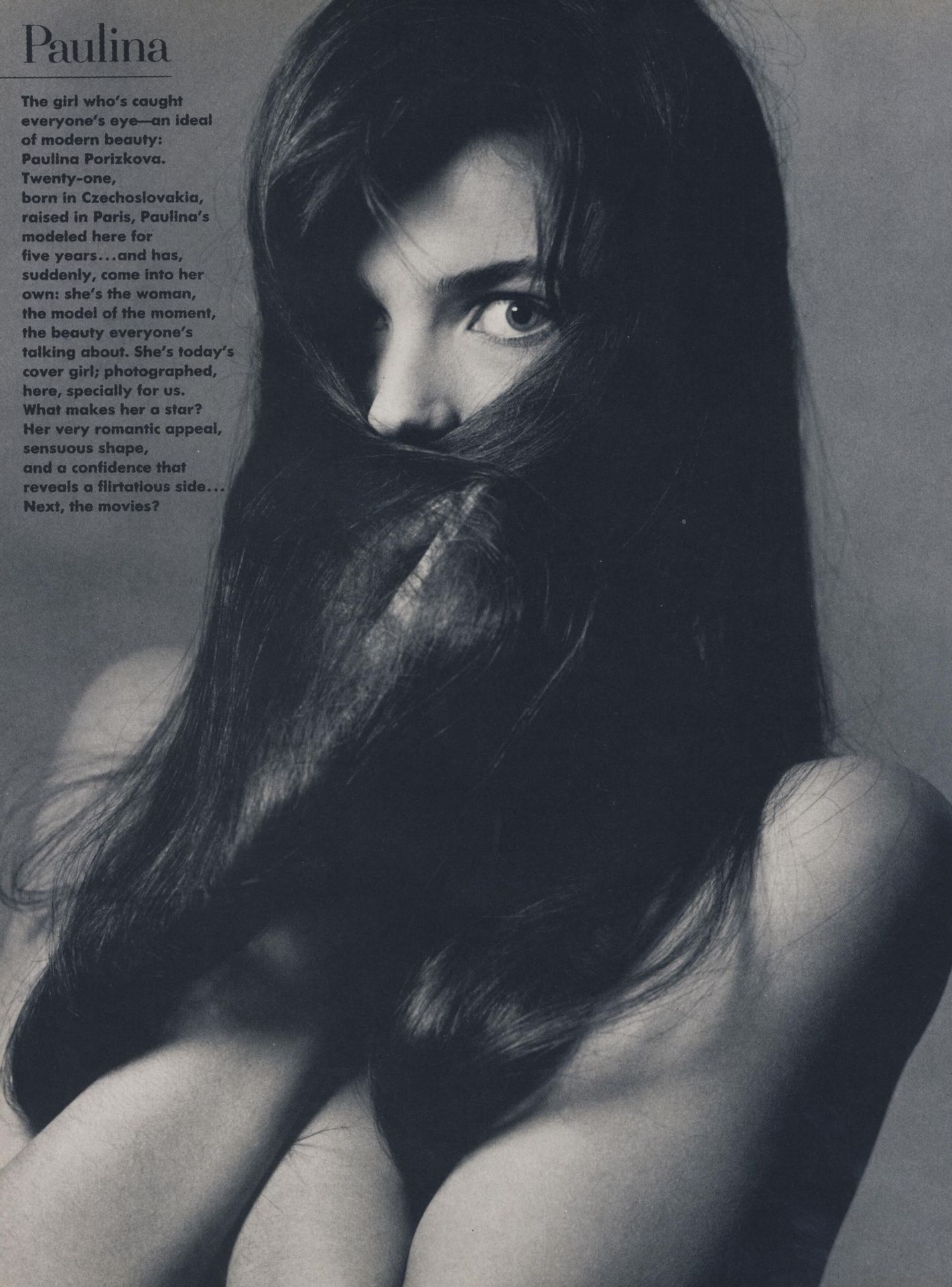Aqui estão as fotos de Paulina Porizkova da revista Vogue, edição de 1986, por Irving Penn. A veterana modelo mostra seus seios levemente nus, cobrindo-os com as mãos.