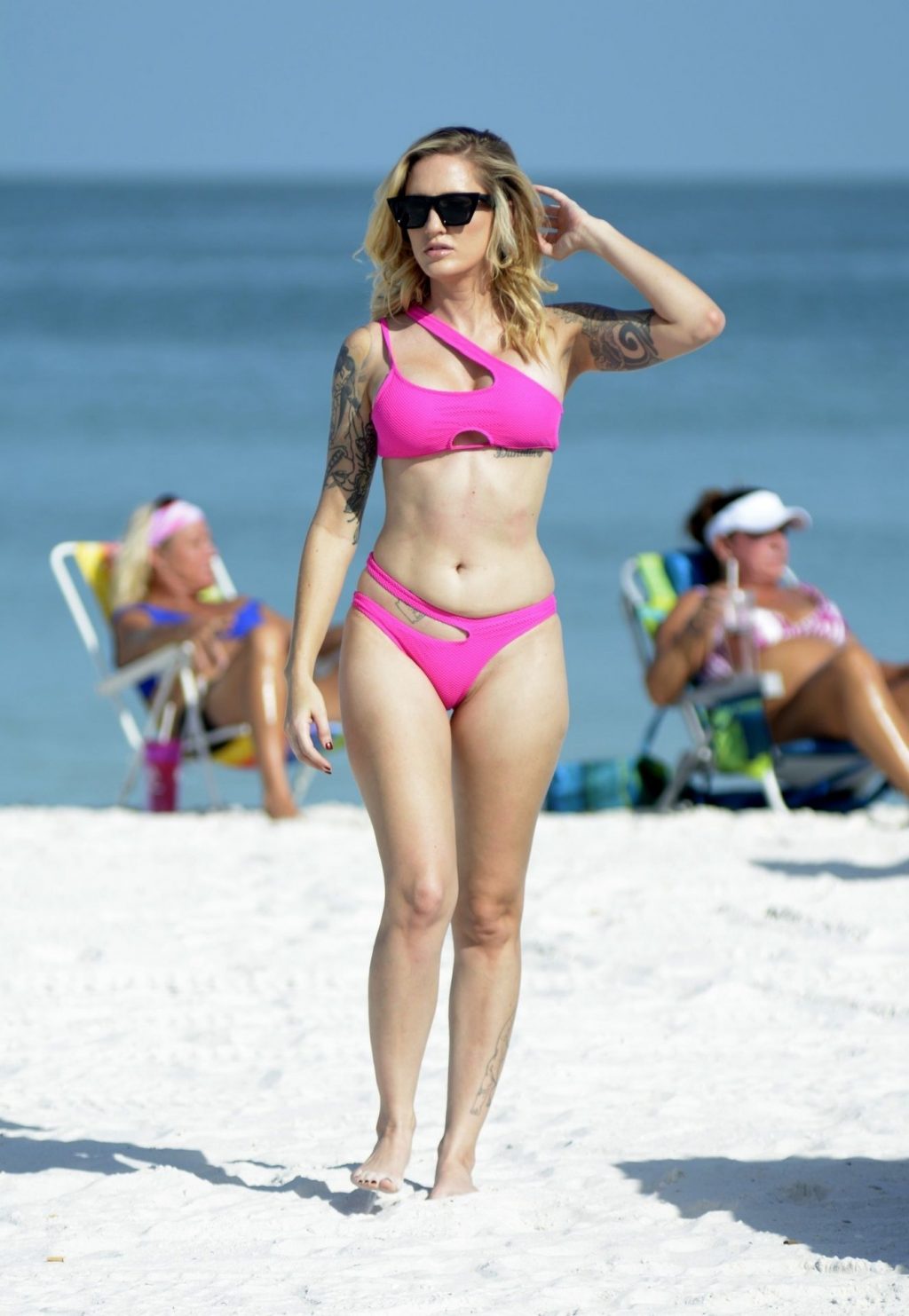 Model Reagan Lush vai à praia com um biquíni rosa de duas peças, 11/09/2020. A loira tonificada chamou a atenção enquanto mantinha distância e usava máscara ao chegar à praia.