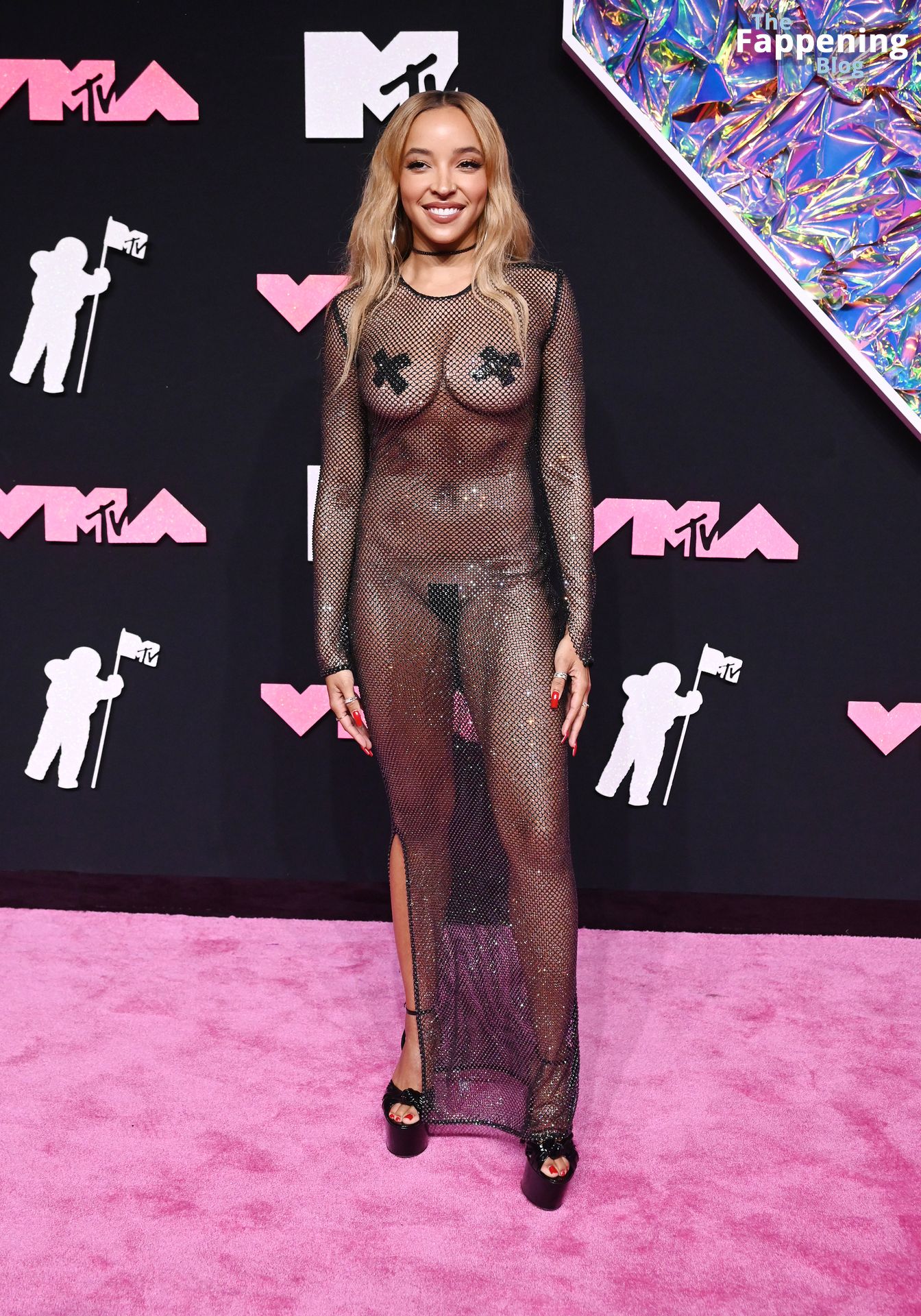 Tinashe não deixa muita coisa para a imaginação enquanto posa no tapete vermelho do MTV Video Music Awards 2023. A deslumbrante cantora usa um vestido transparente, sendo criativa com fita adesiva para cobrir suas partes íntimas.
