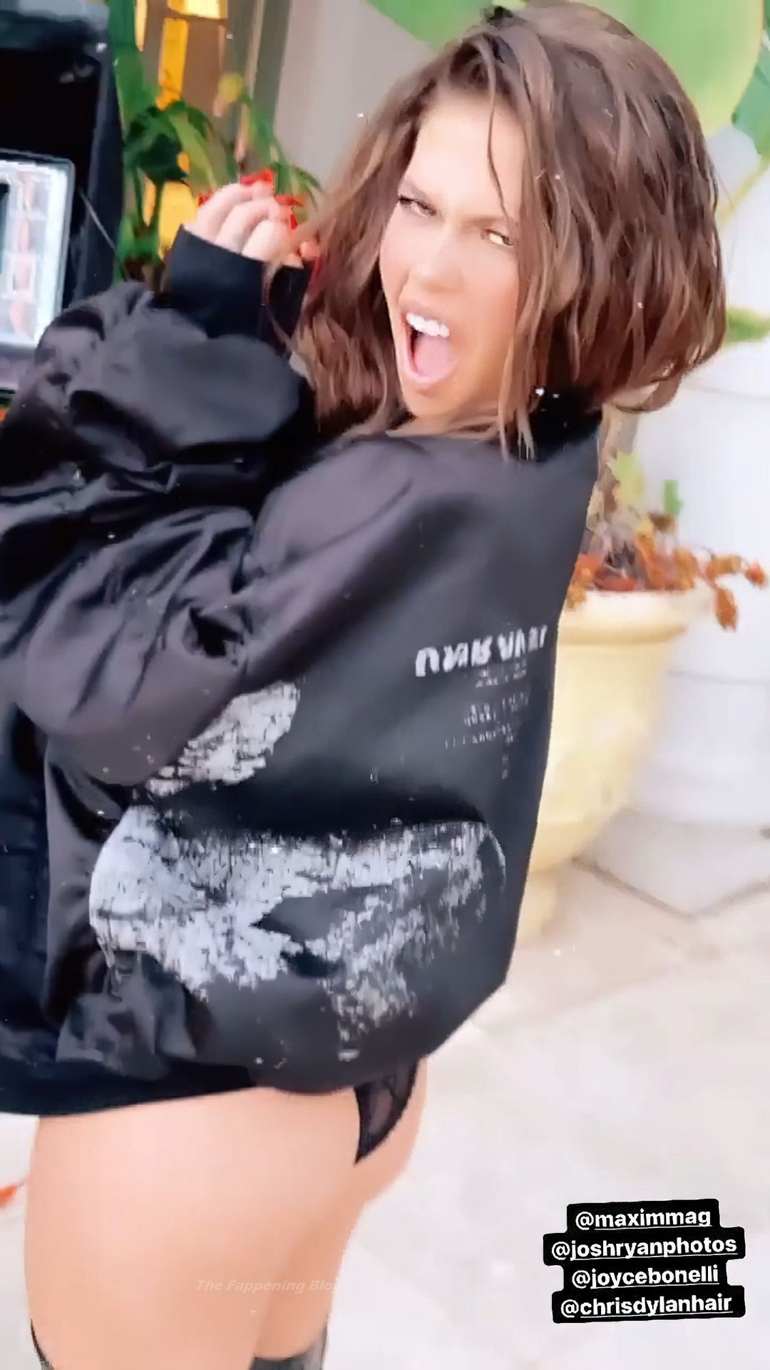 A rapper Chanel West Coast revela seu peito nu enquanto posa topless, de lingerie e botas no set da revista Maxim (2021).