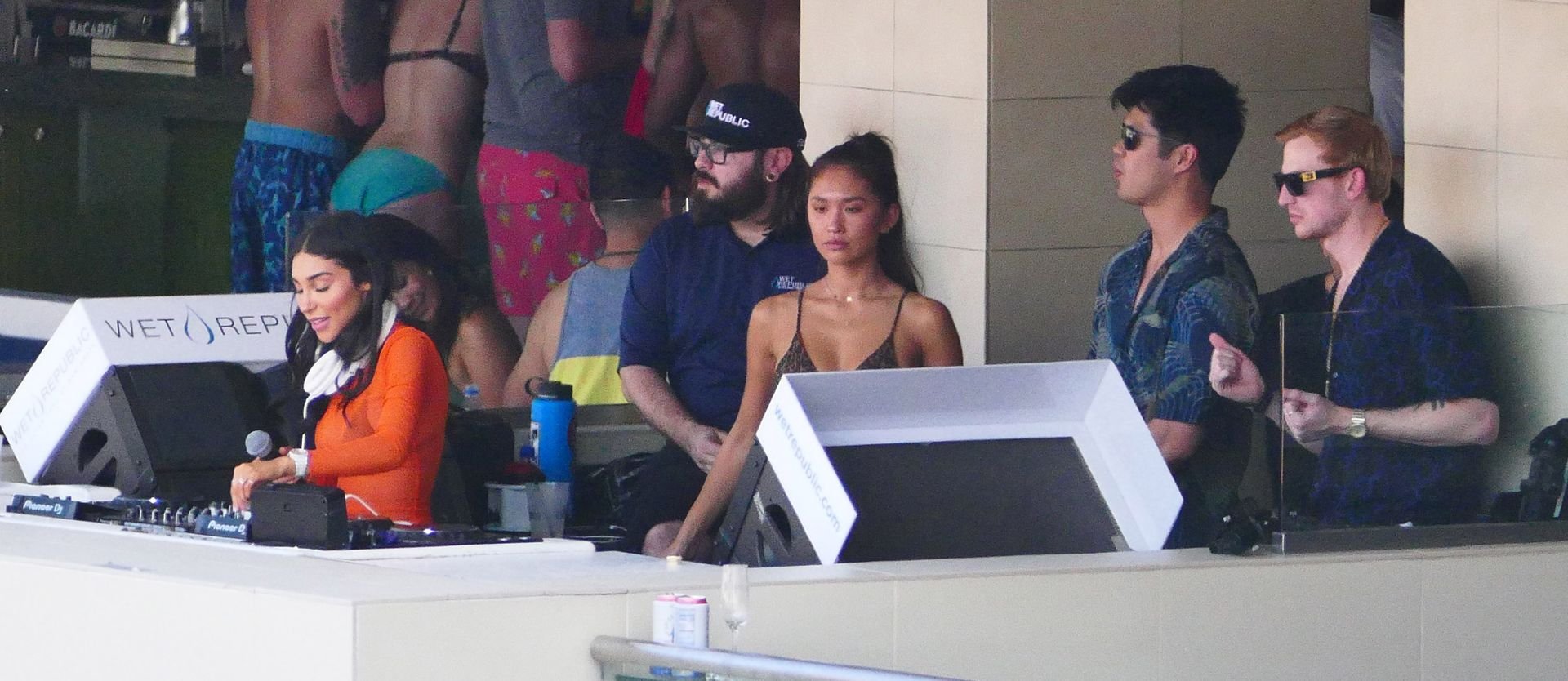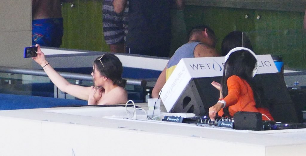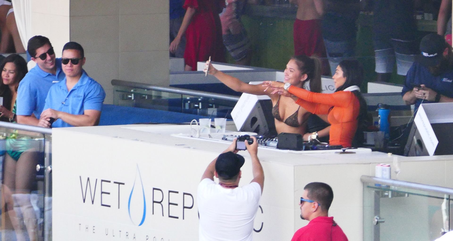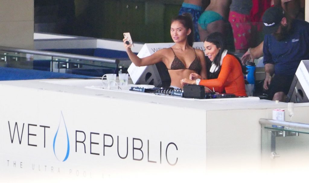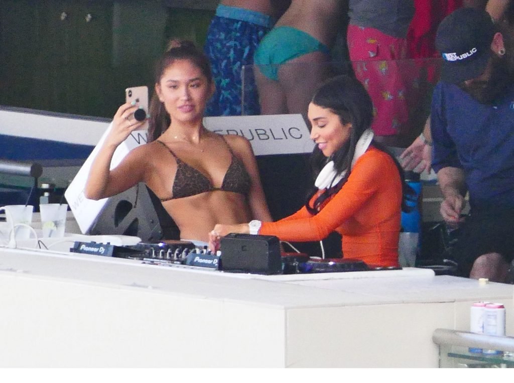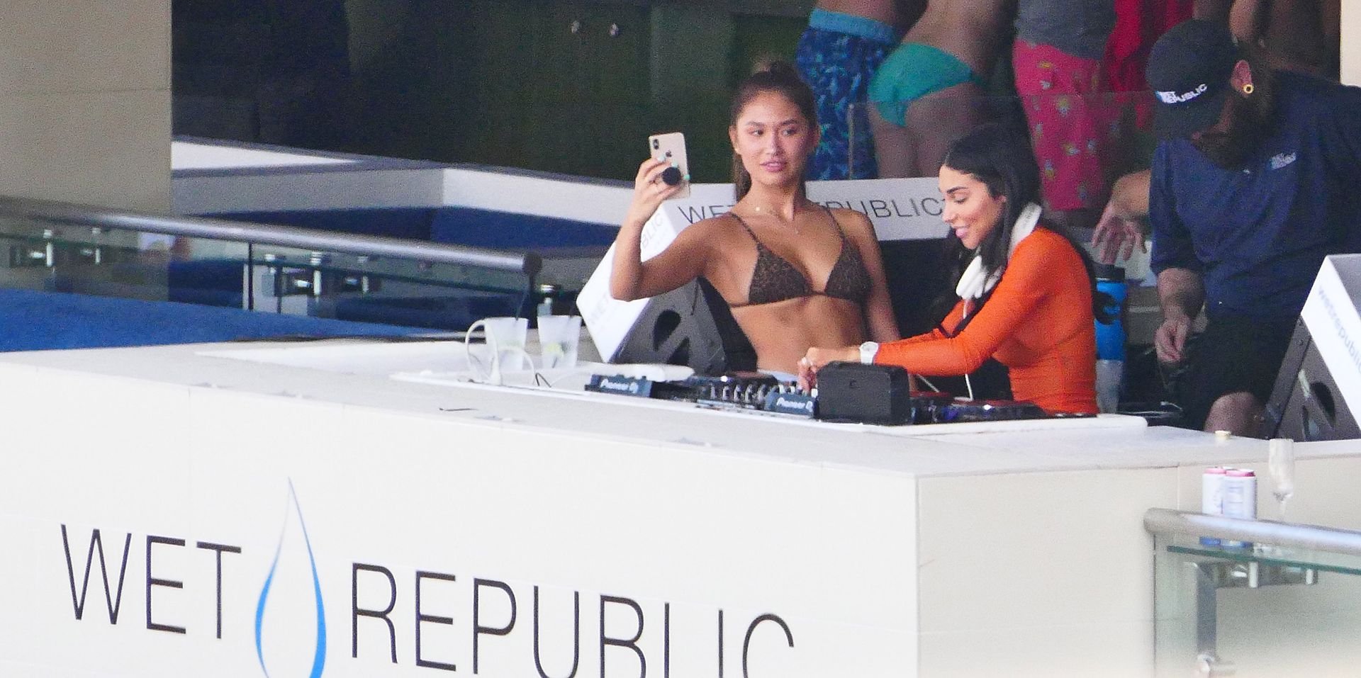 Chantel Jefferies está usando uma capa de biquíni laranja brilhante enquanto tem a fã definitiva Jocelyn Chew tirando selfies dela enquanto mostra seus músculos abdominais de biquíni, enquanto a estrela de Shazam!, Ross Butler, exibe seus músculos abdominais na cabine de DJ dela no Wet Republic em Las Vegas, 04/05/2019.