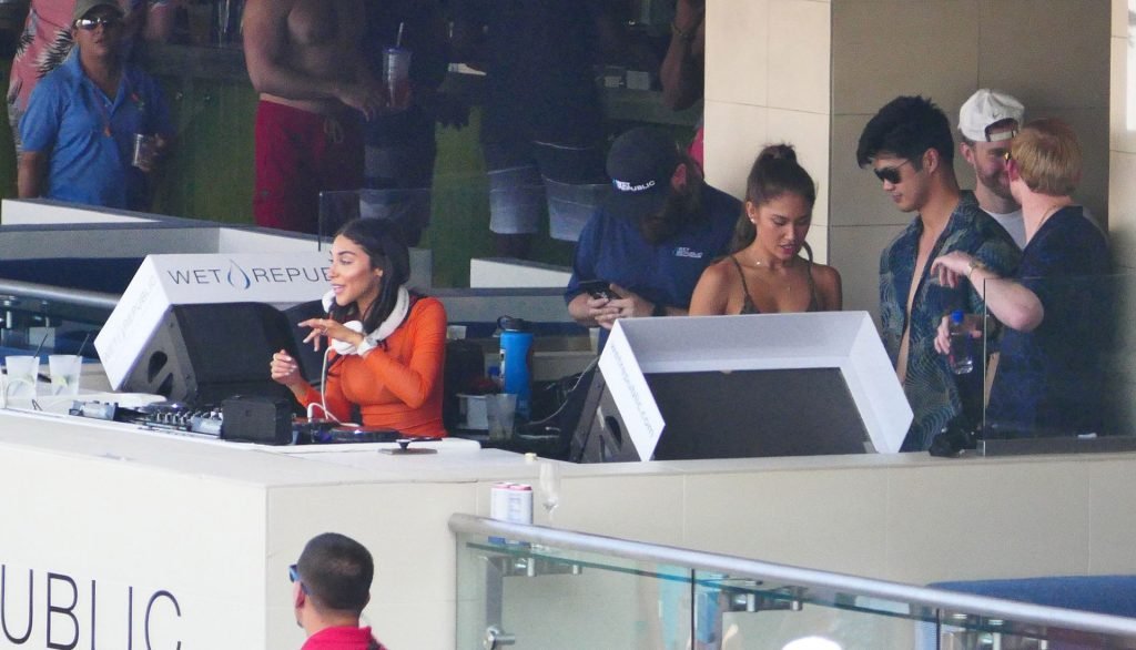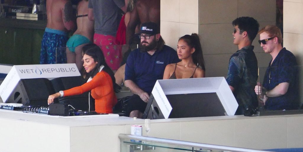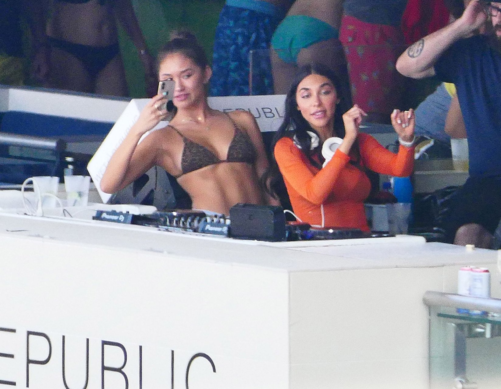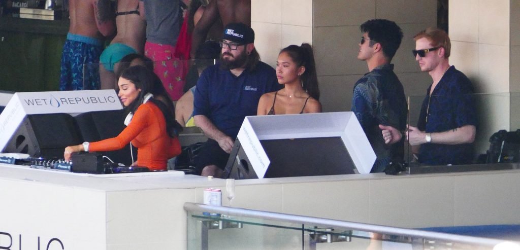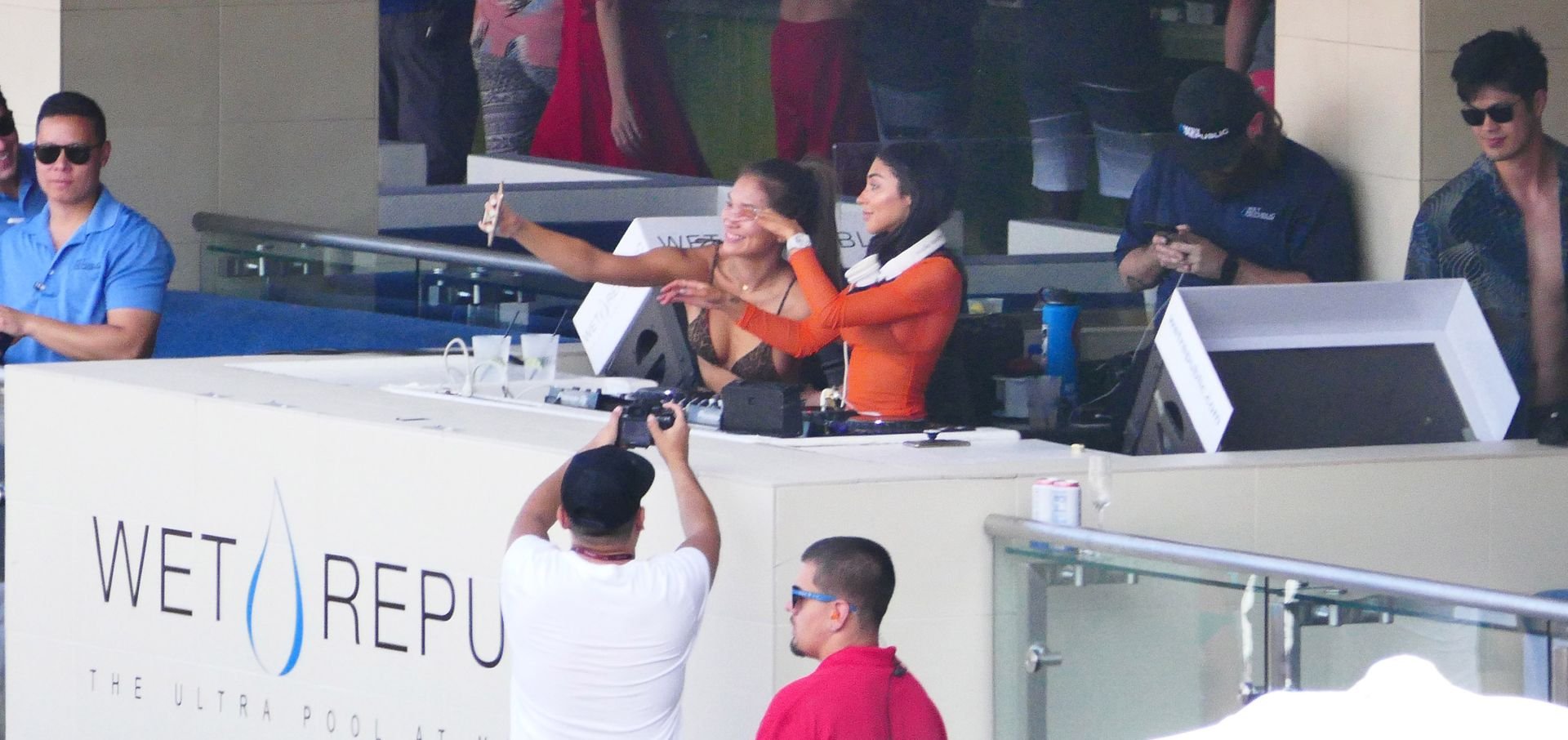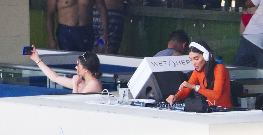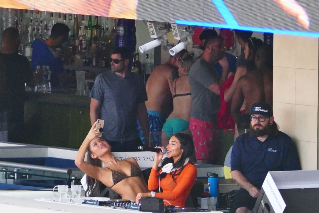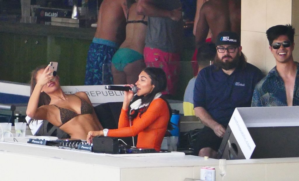 Chantel Jefferies está usando uma capa de biquíni laranja brilhante enquanto tem a fã definitiva Jocelyn Chew tirando selfies dela enquanto mostra seus músculos abdominais de biquíni, enquanto a estrela de Shazam!, Ross Butler, exibe seus músculos abdominais na cabine de DJ dela no Wet Republic em Las Vegas, 04/05/2019.
