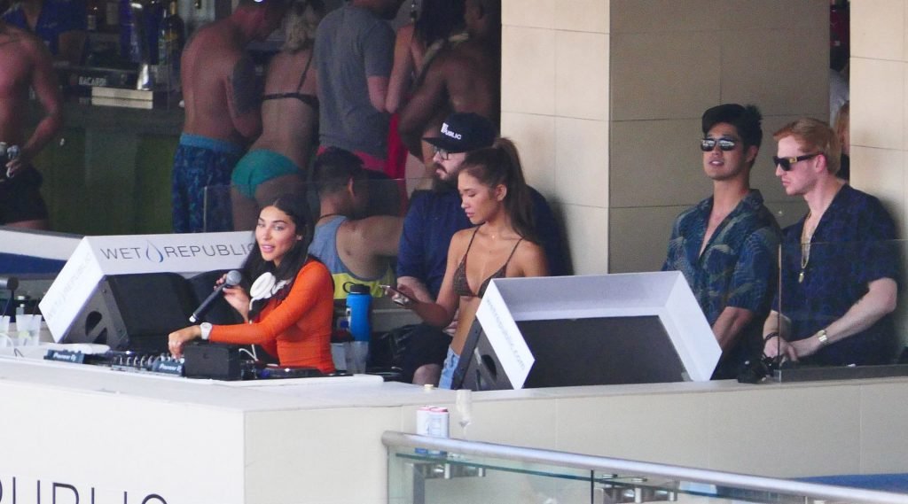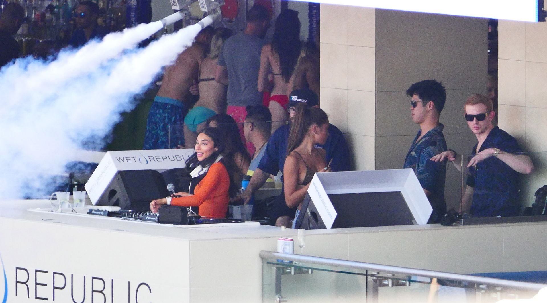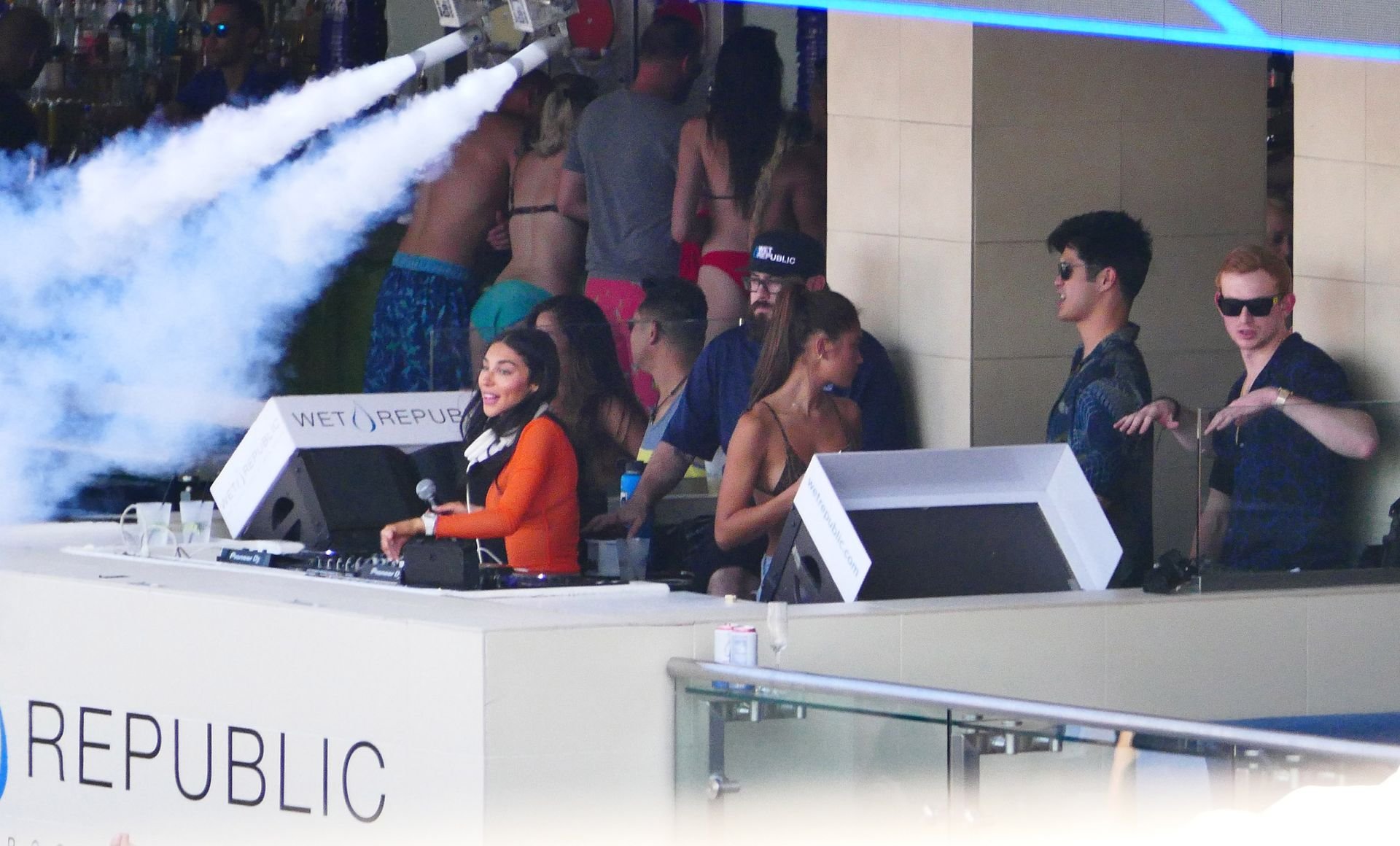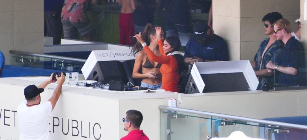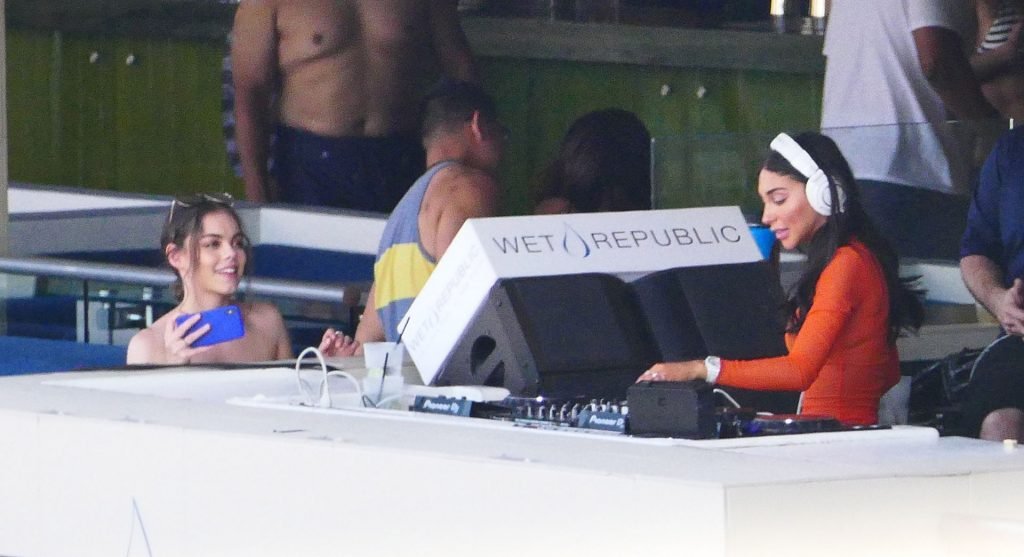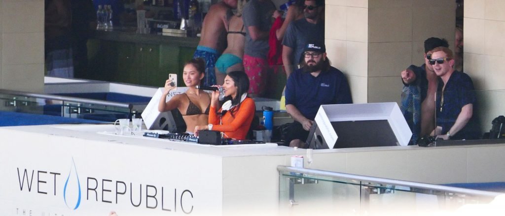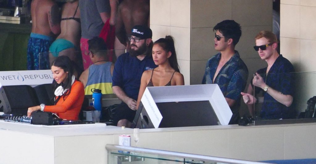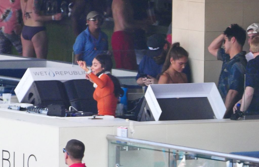 Chantel Jefferies está usando uma capa de biquíni laranja brilhante enquanto tem a fã definitiva Jocelyn Chew tirando selfies dela enquanto mostra seus músculos abdominais de biquíni, enquanto a estrela de Shazam!, Ross Butler, exibe seus músculos abdominais na cabine de DJ dela no Wet Republic em Las Vegas, 04/05/2019.