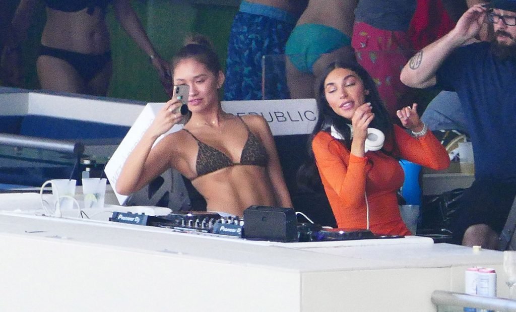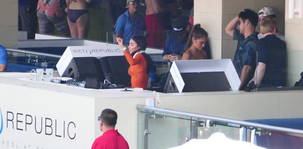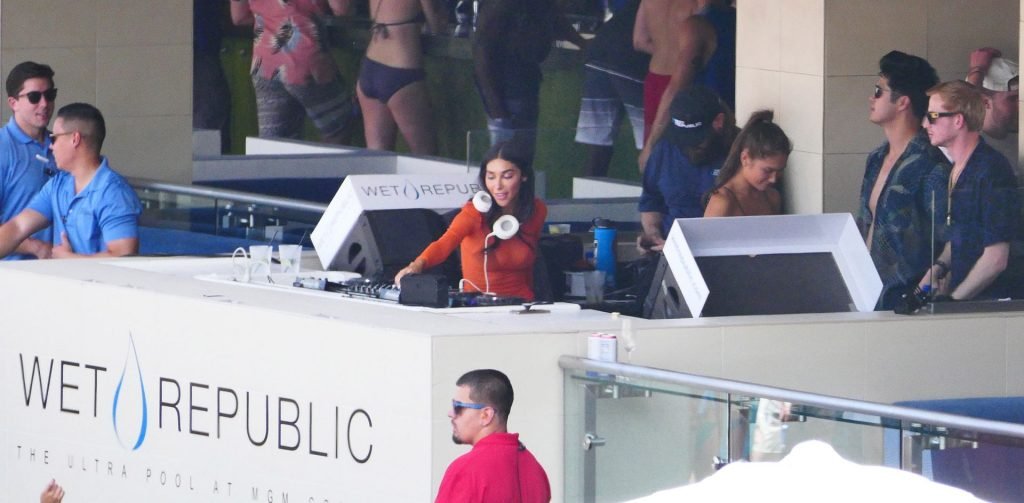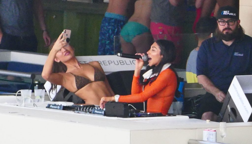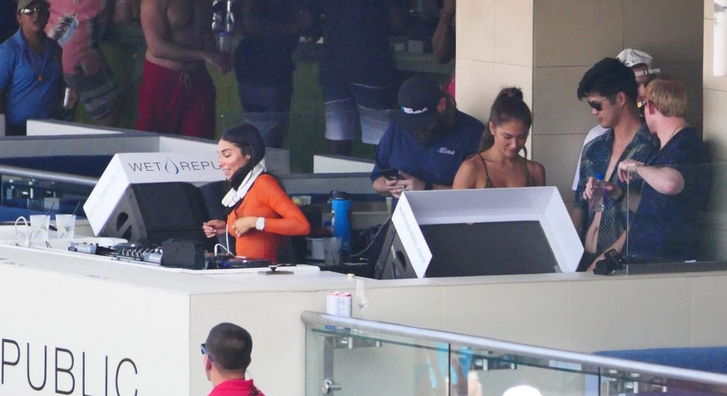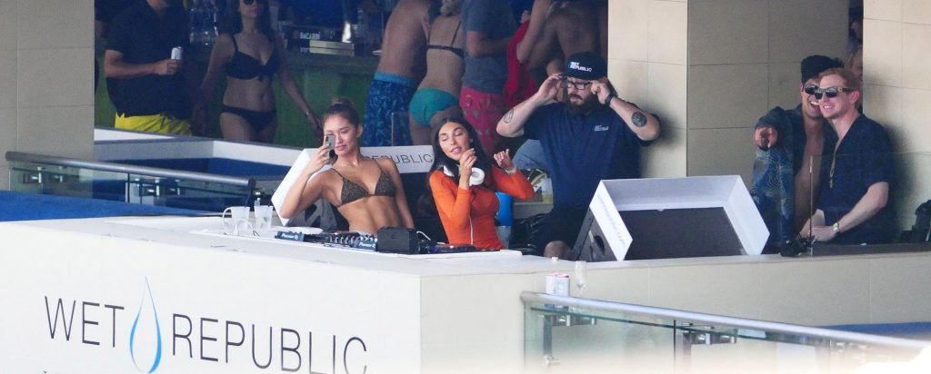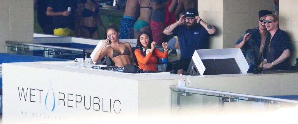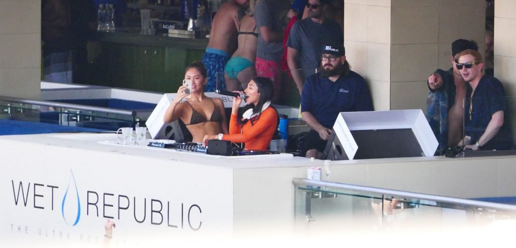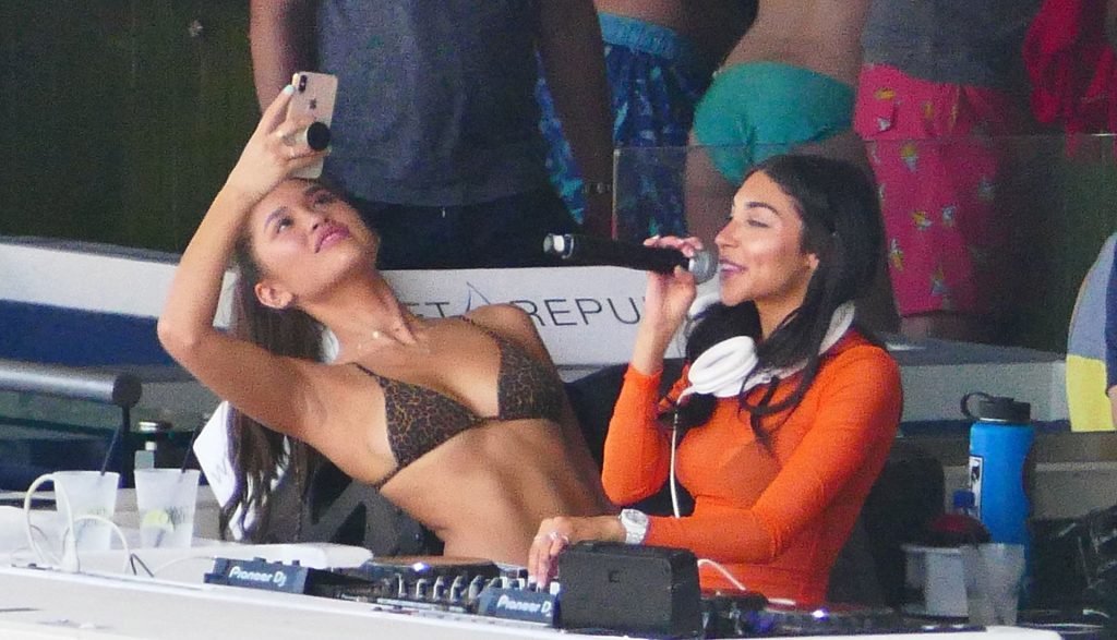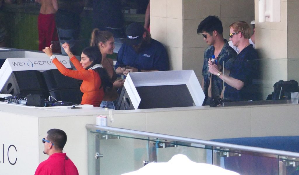 Chantel Jefferies está usando uma capa de biquíni laranja brilhante enquanto tem a fã definitiva Jocelyn Chew tirando selfies dela enquanto mostra seus músculos abdominais de biquíni, enquanto a estrela de Shazam!, Ross Butler, exibe seus músculos abdominais na cabine de DJ dela no Wet Republic em Las Vegas, 04/05/2019.