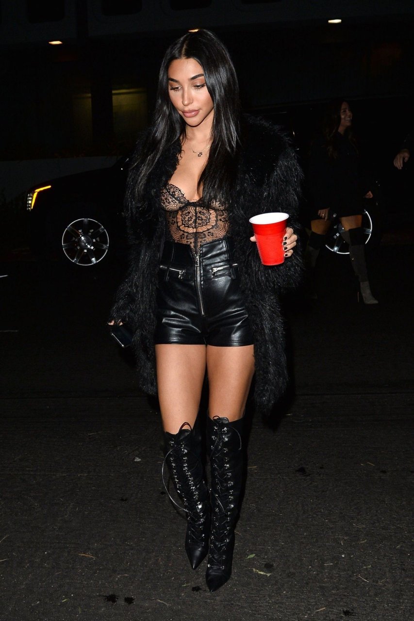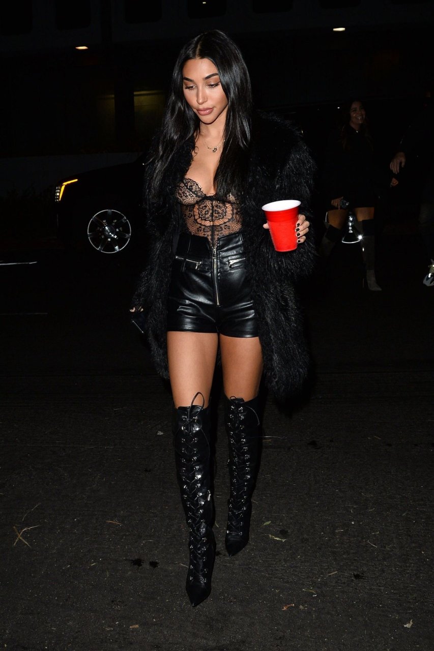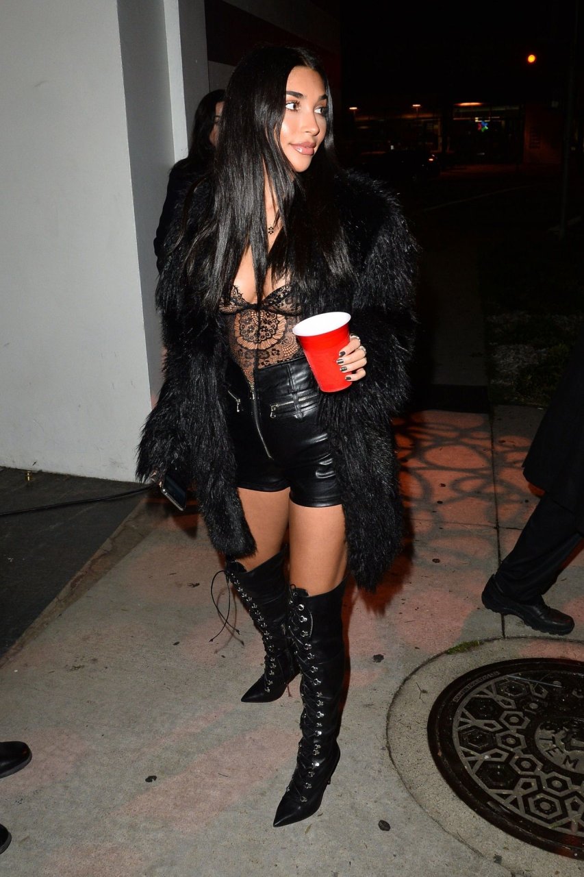Chantel Jeffries arrasa toda de preto na festa de 22 anos de Nikita Dragun em West Hollywood, 31/01/2019. A DJ e modelo de 26 anos usa um corpete de renda combinado com um shortinho de couro enquanto corre para a festa da estrela das redes sociais.