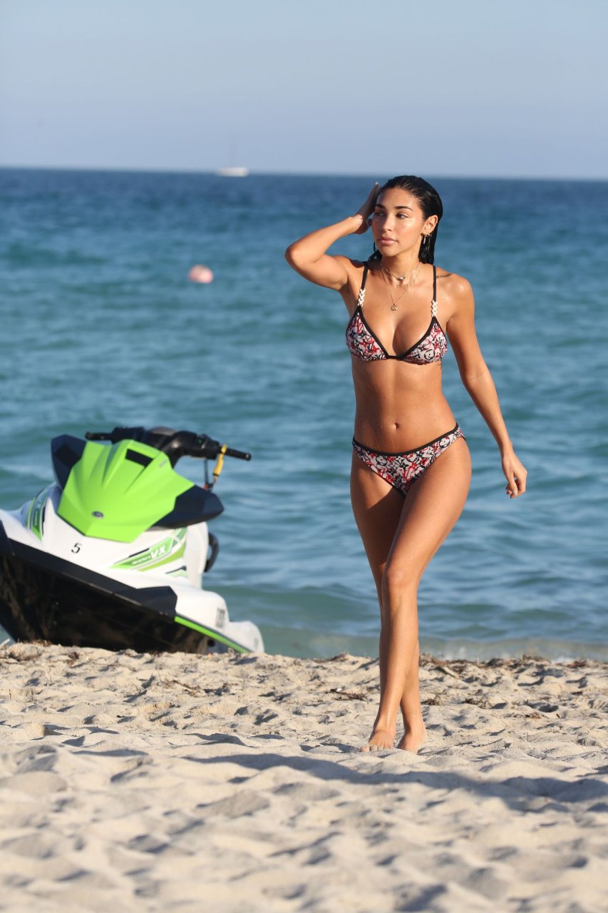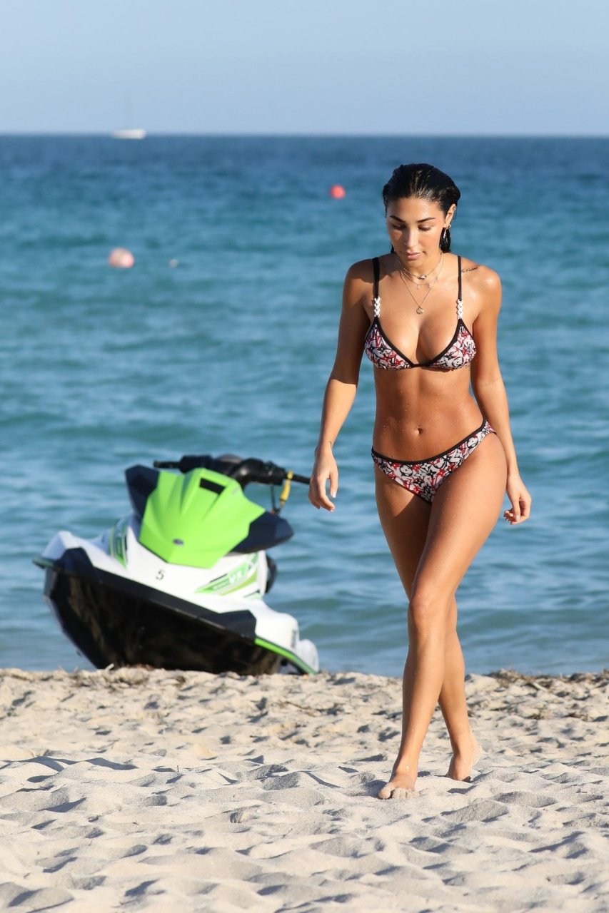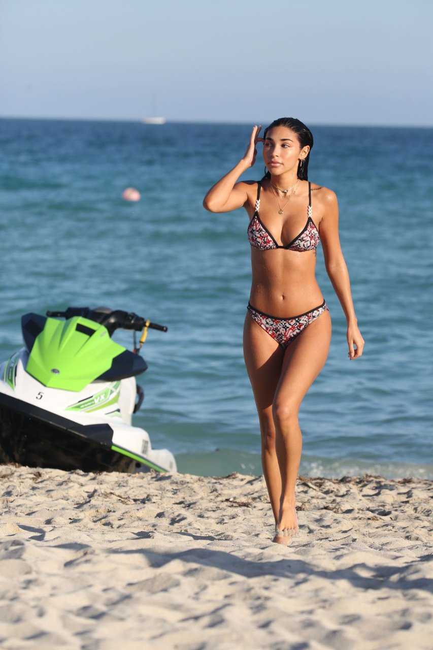 Chantel Jeffries exibe seu corpo tonificado de biquíni enquanto aproveita um dia de praia com amigos em Miami, 12/05/2018. Chantel está ótima em um biquíni minúsculo da Louis Vuitton enquanto aproveita o sol e o mar.