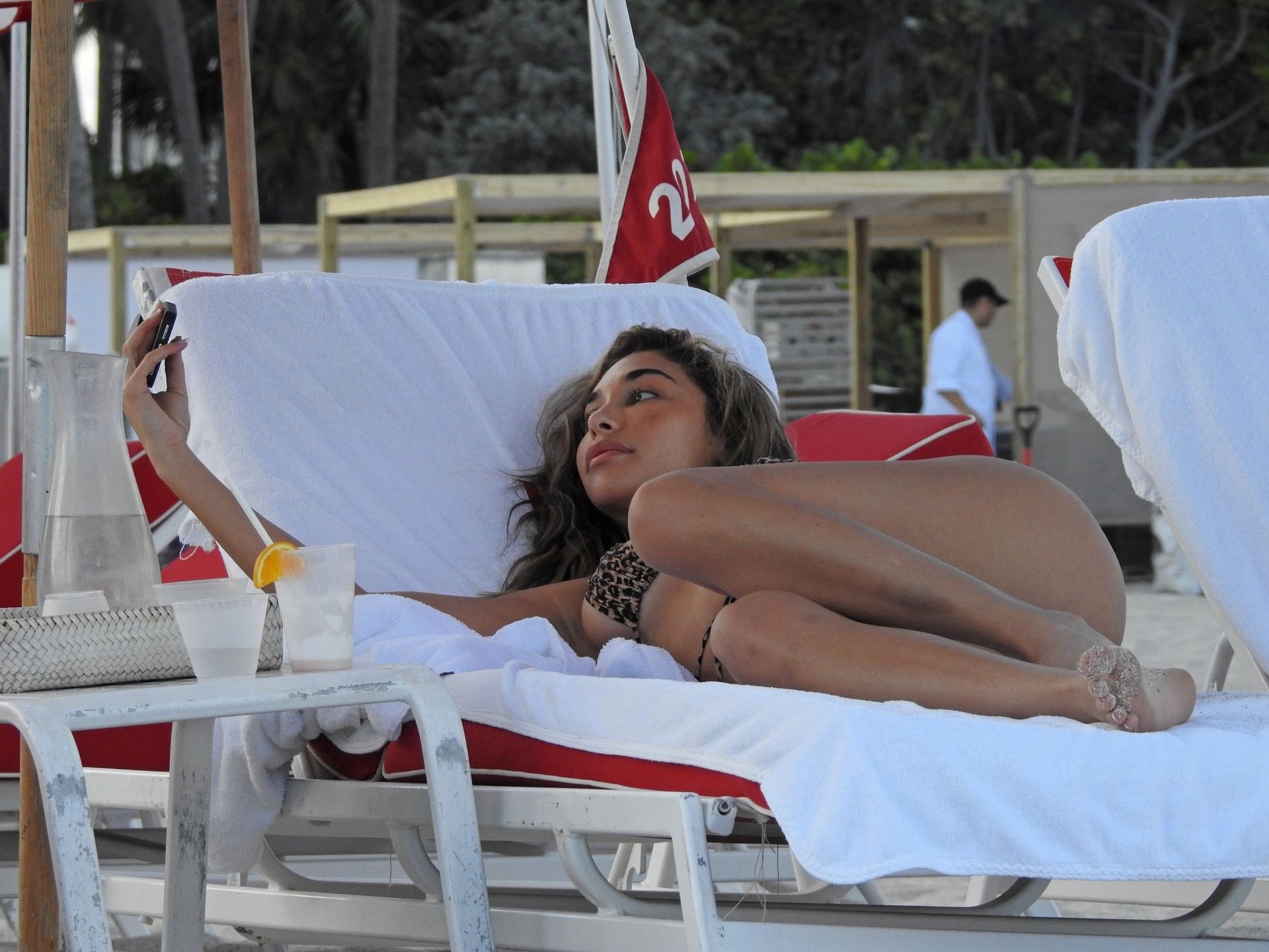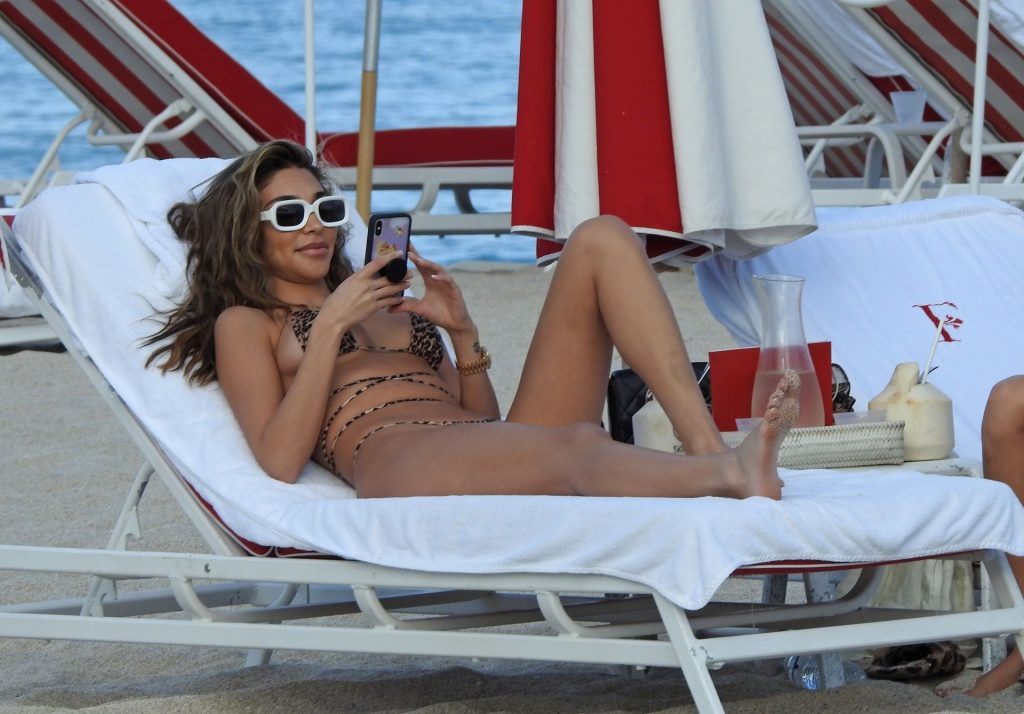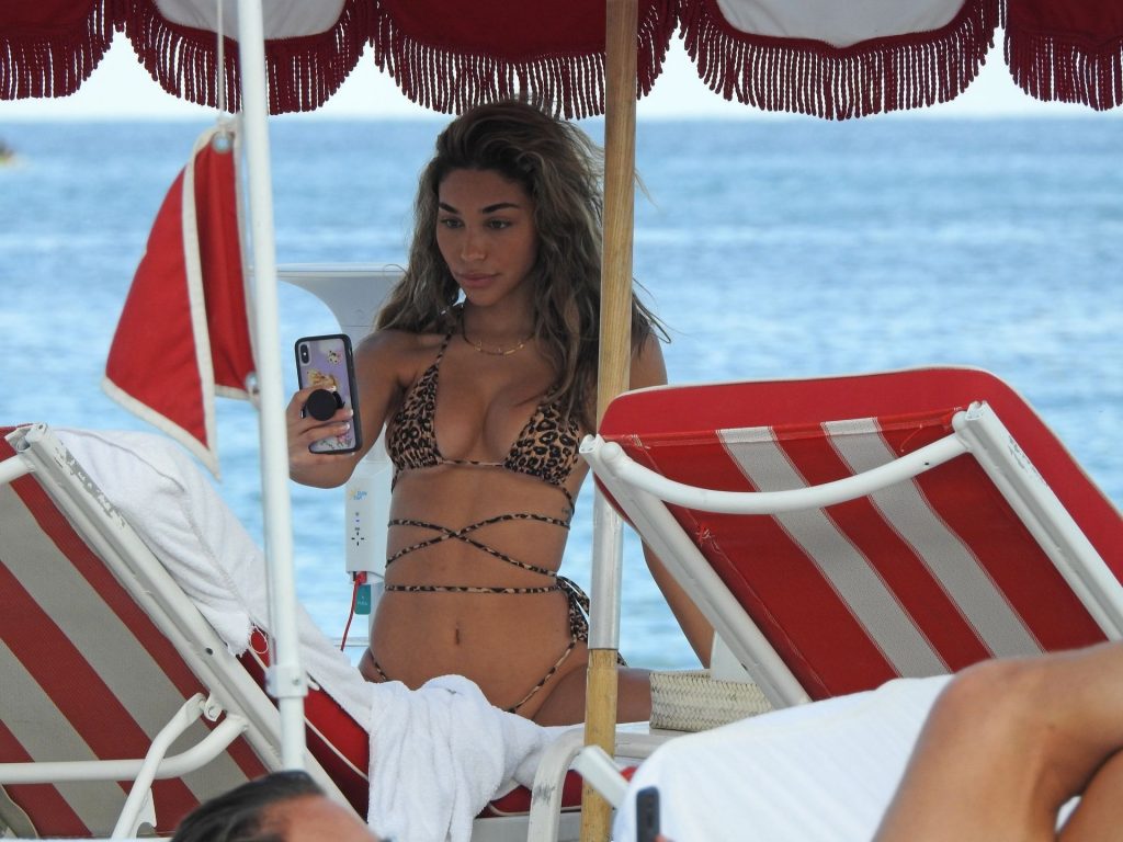 DJ americana, modelo, atriz e estrela de The Fappening Chantel Jeffries foi fotografada parecendo incrível e sexy em um biquíni fio dental estampado de animal enquanto relaxava em uma espreguiçadeira VIP em Miami Beach com amigos, 12/04/2019.