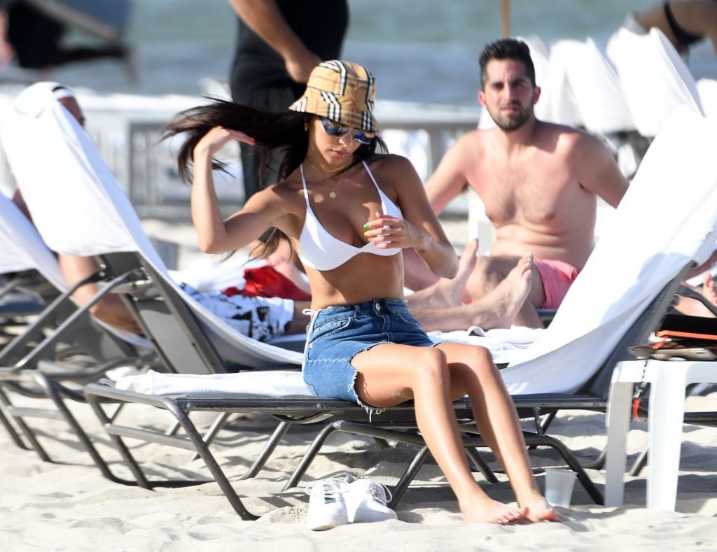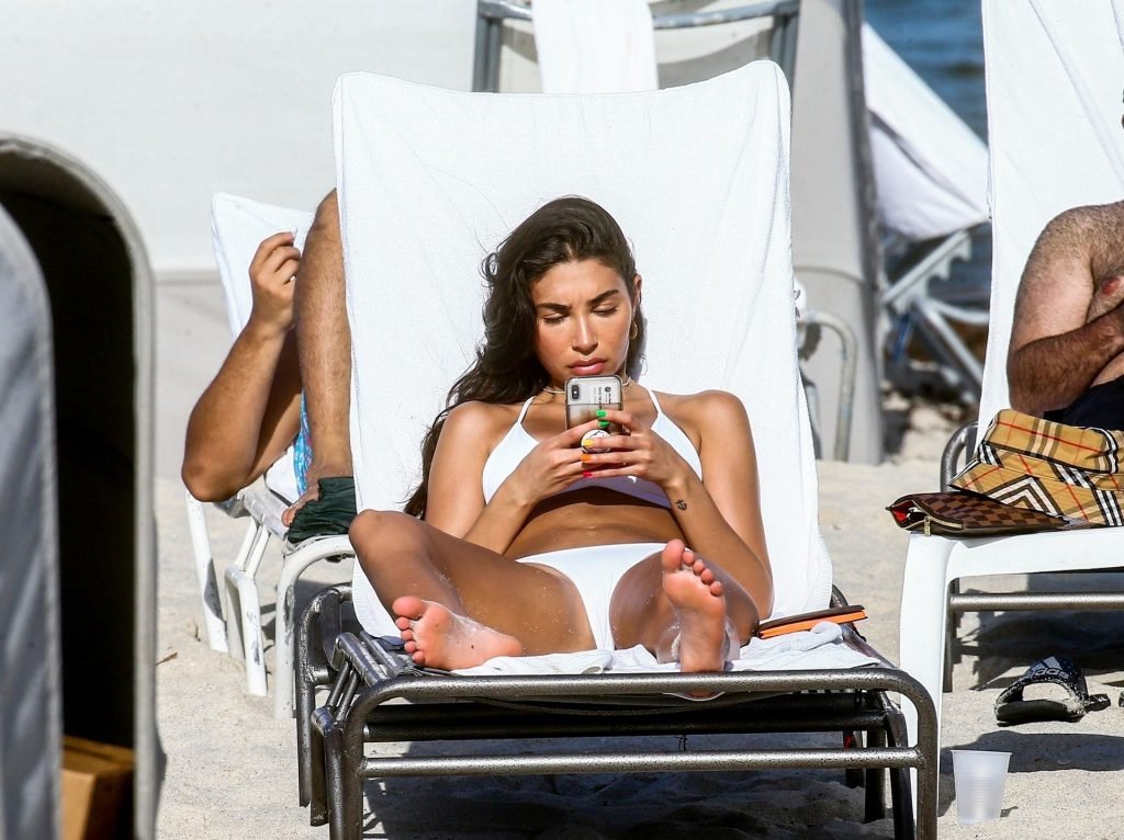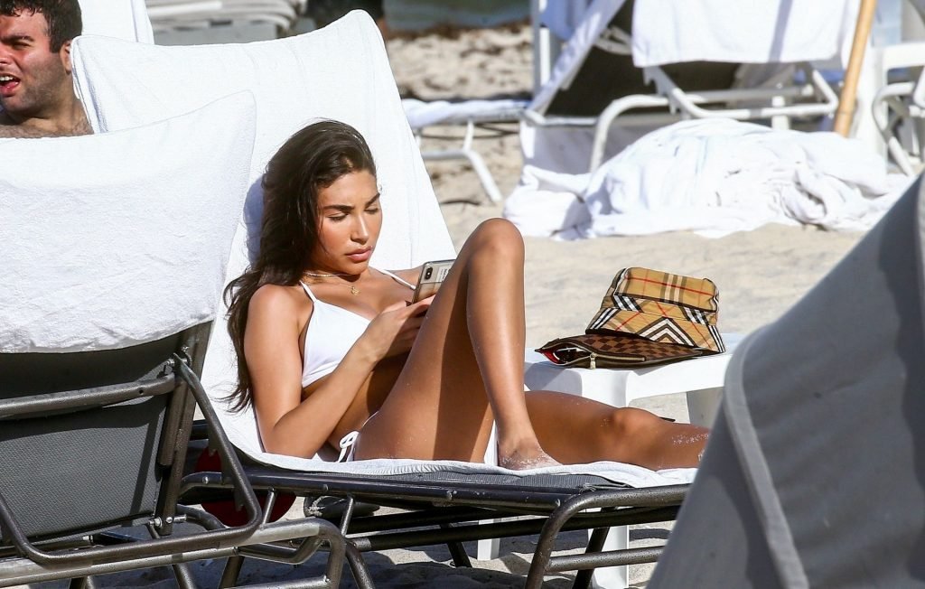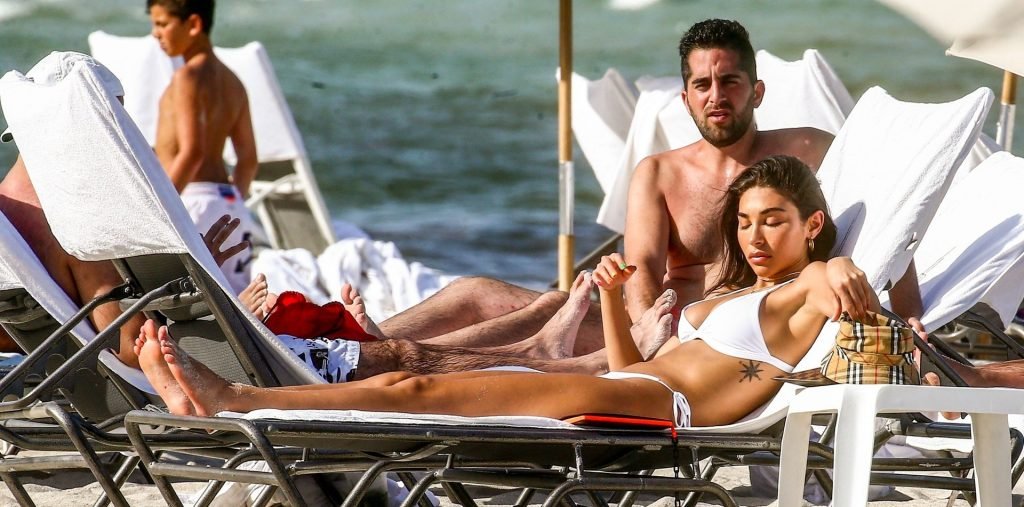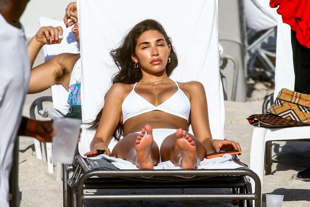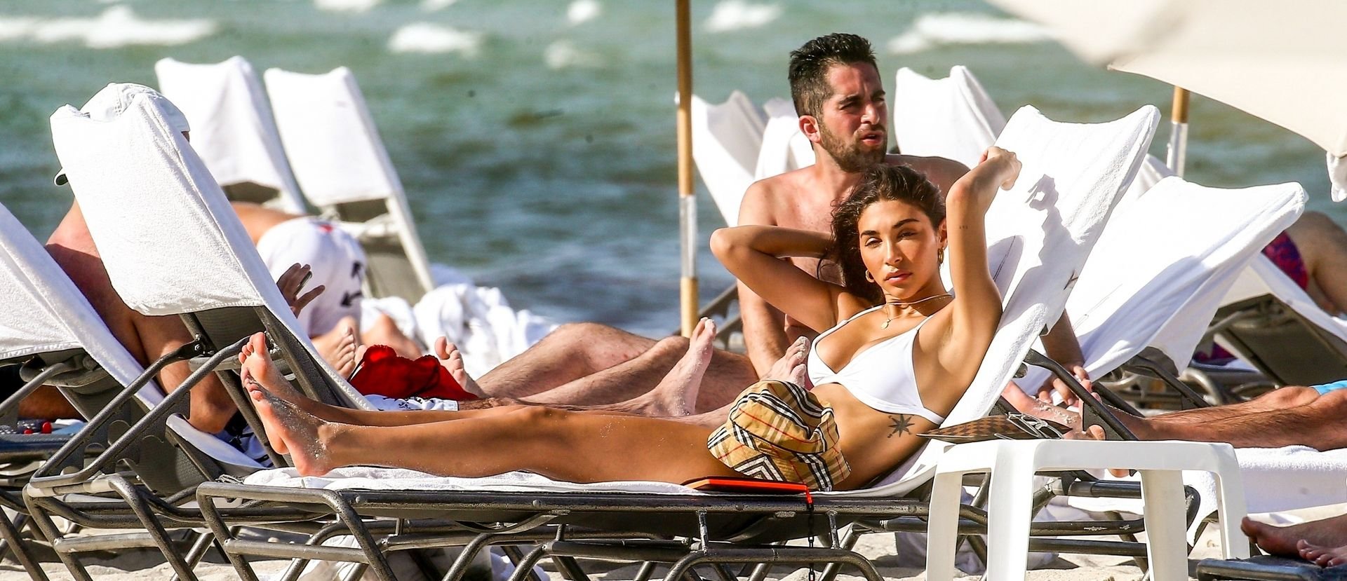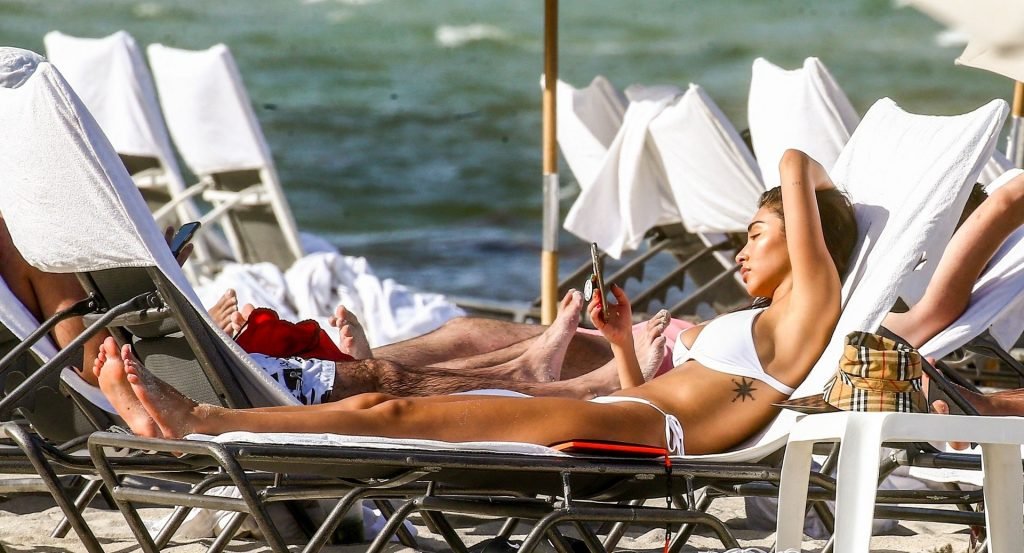 Chantel Jeffries está em Miami Beach aproveitando o sol e exibindo seu físico tonificado e bronzeado dourado, 20/06/2019. A modelo/DJ americana está deitada em uma cadeira de praia antes de se levantar e vestir seus shorts jeans.