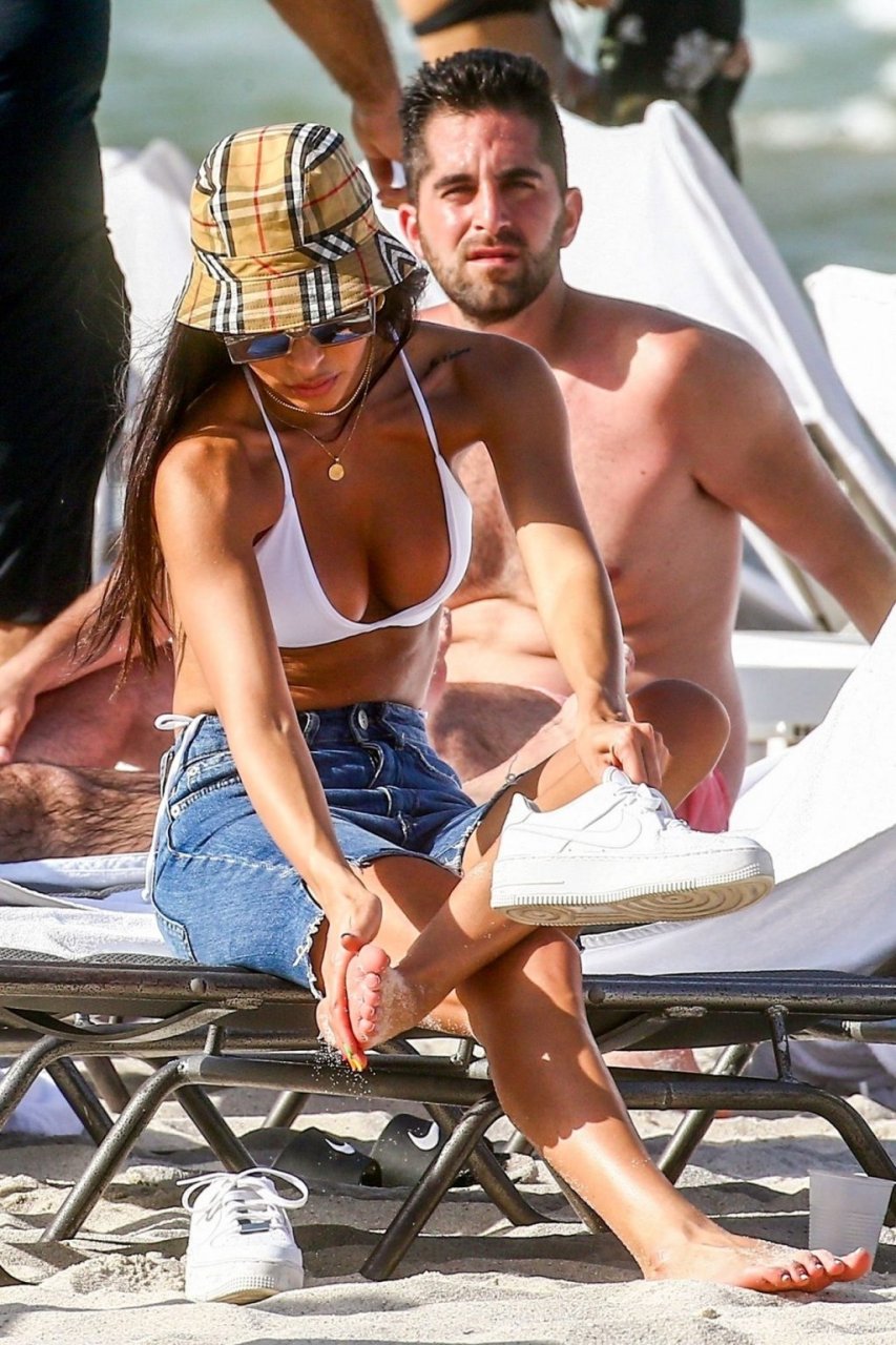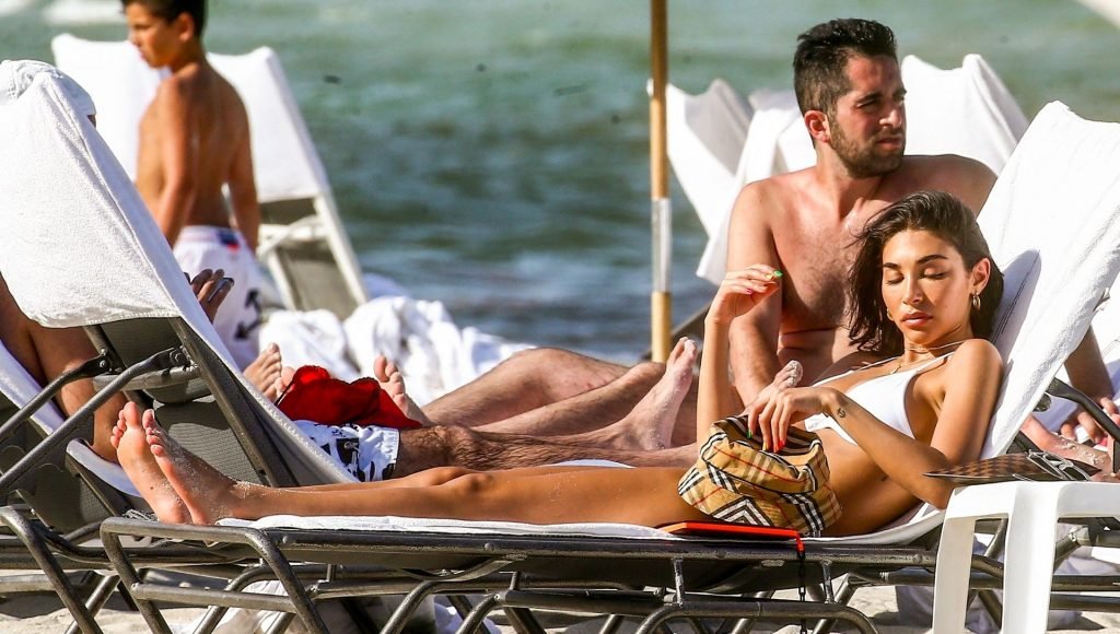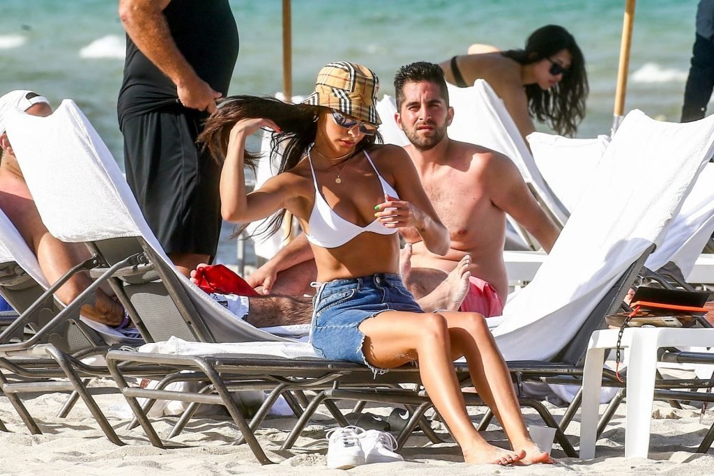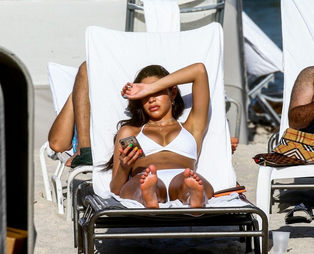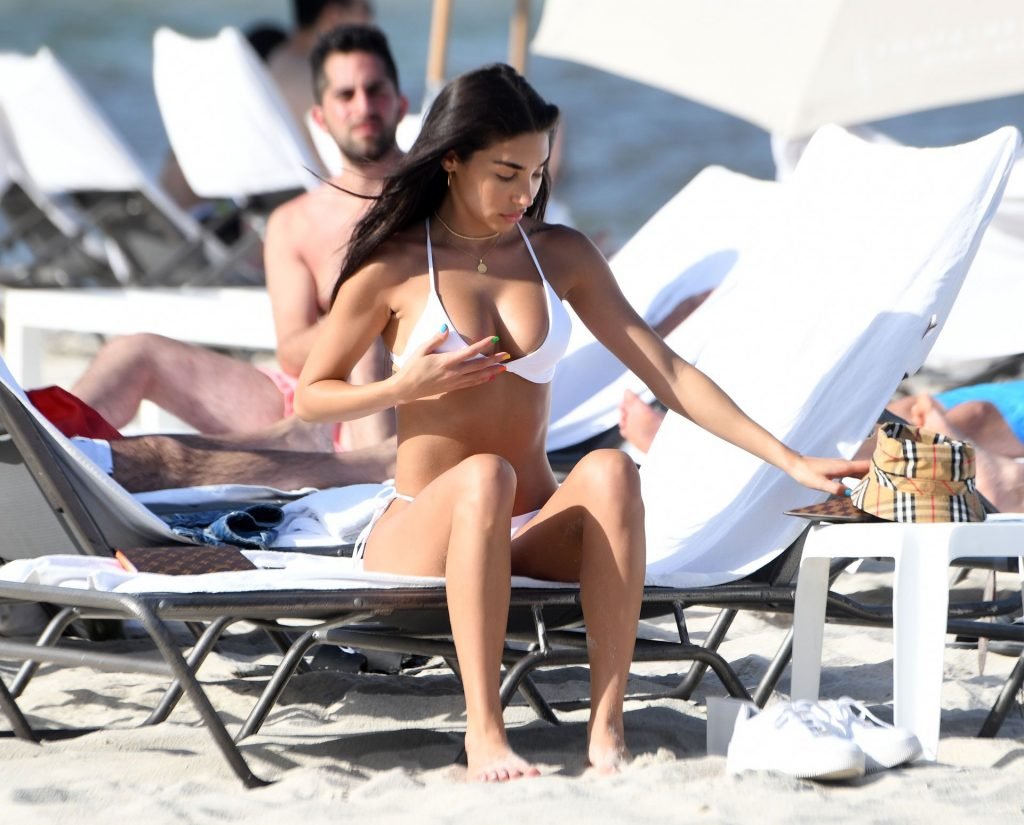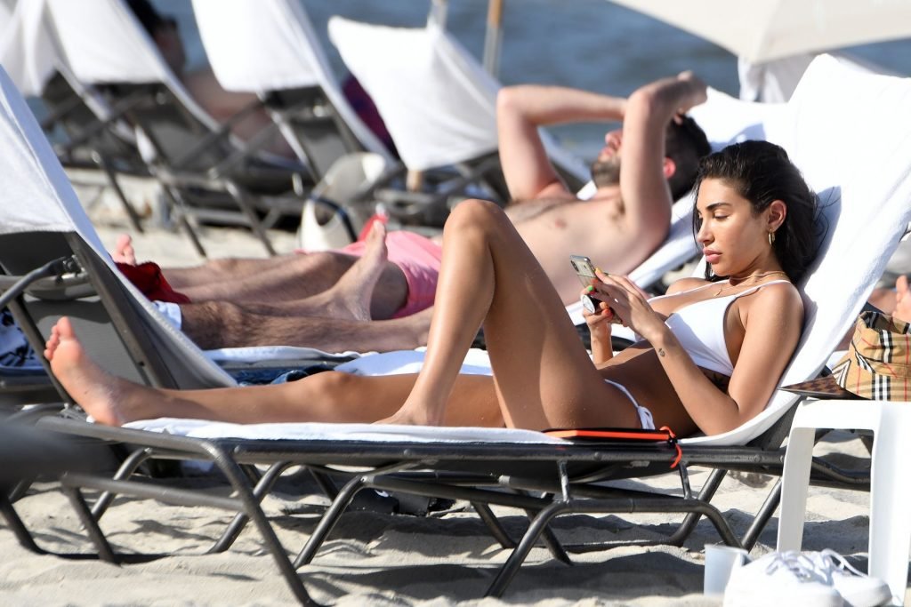 Chantel Jeffries está em Miami Beach aproveitando o sol e exibindo seu físico tonificado e bronzeado dourado, 20/06/2019. A modelo/DJ americana está deitada em uma cadeira de praia antes de se levantar e vestir seus shorts jeans.