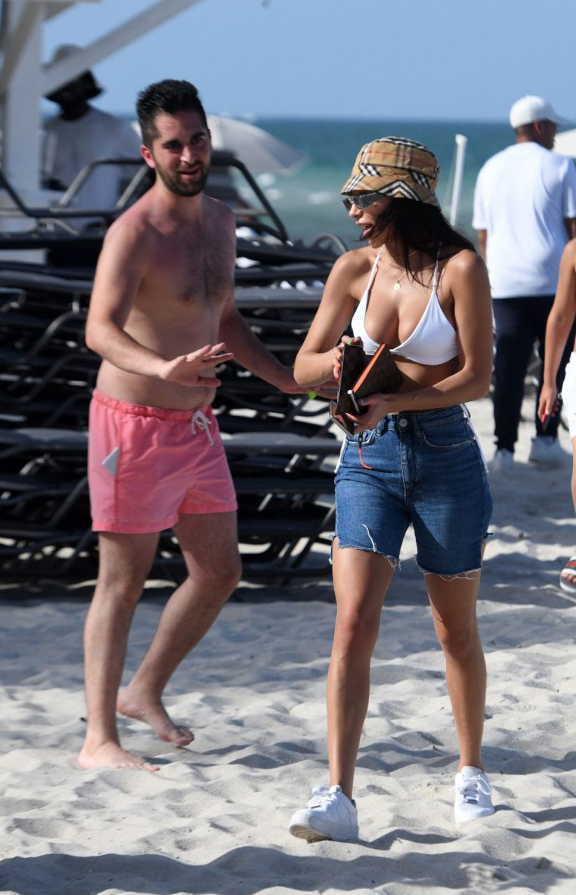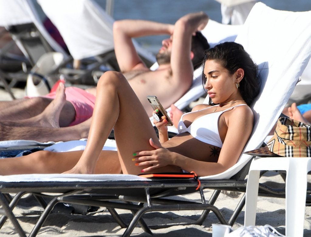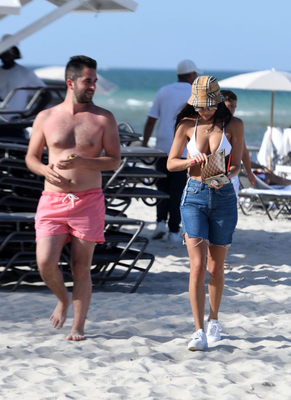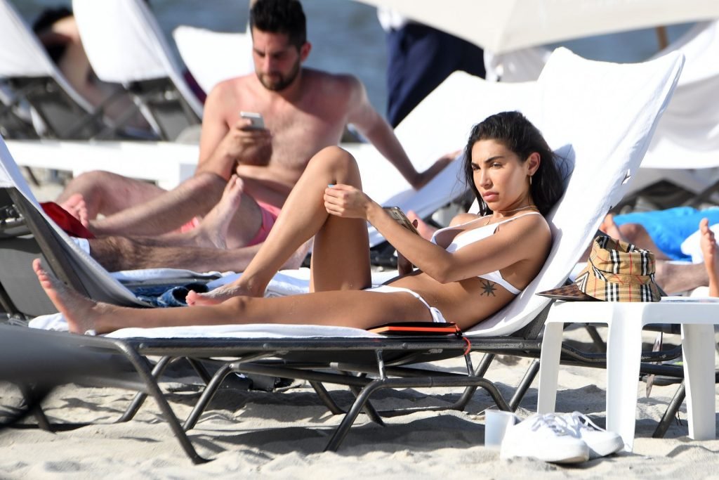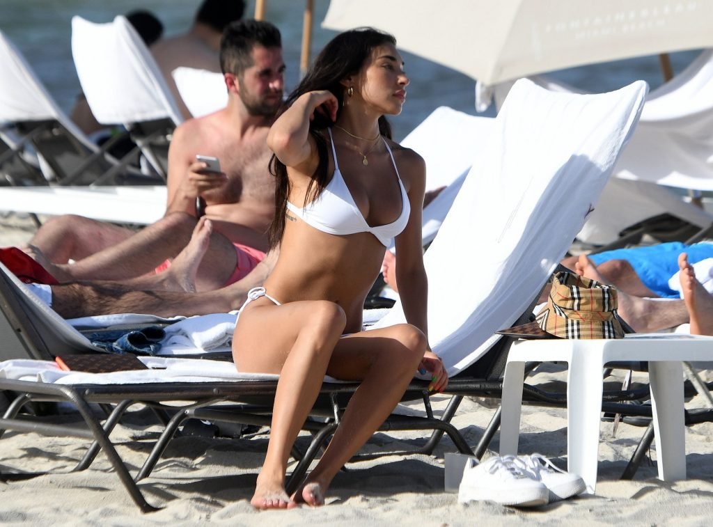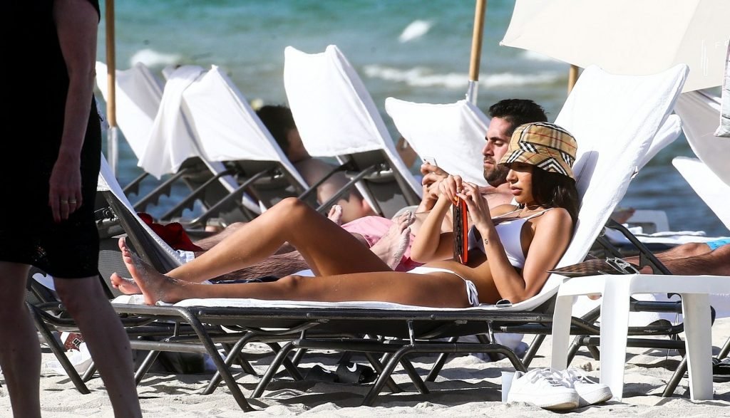 Chantel Jeffries está em Miami Beach aproveitando o sol e exibindo seu físico tonificado e bronzeado dourado, 20/06/2019. A modelo/DJ americana está deitada em uma cadeira de praia antes de se levantar e vestir seus shorts jeans.
