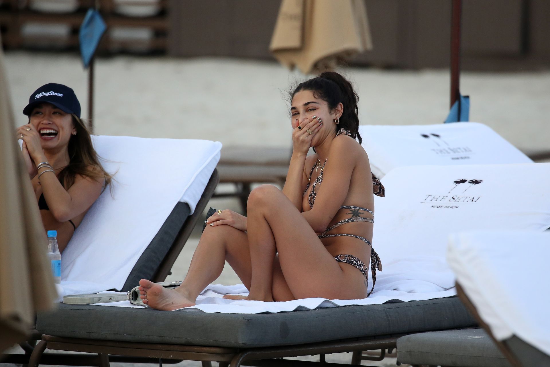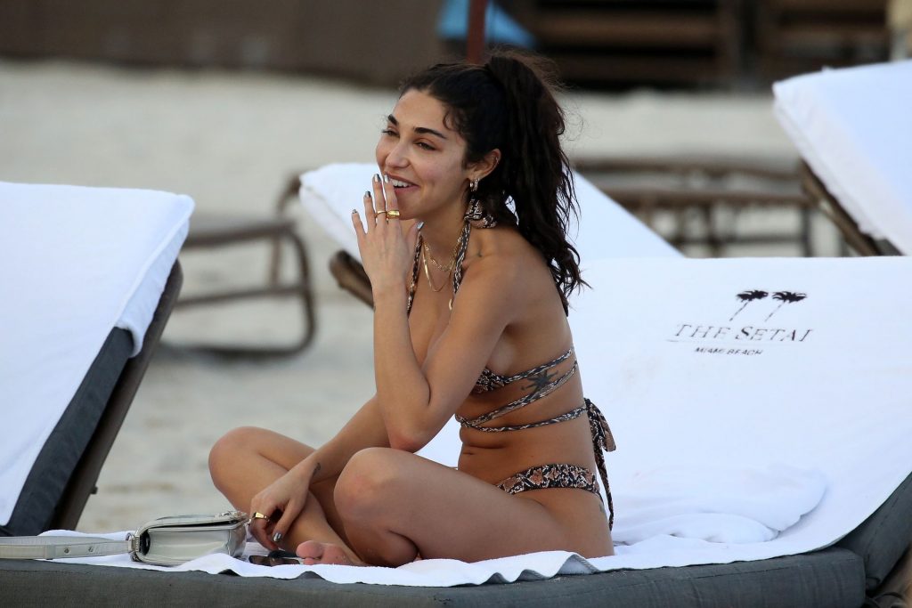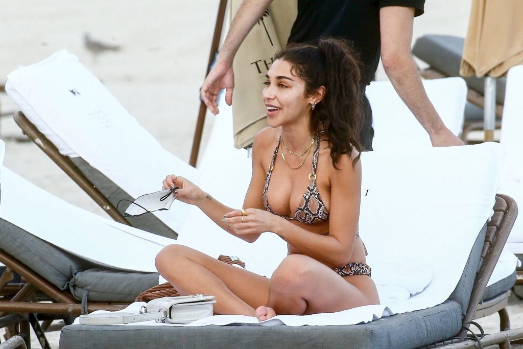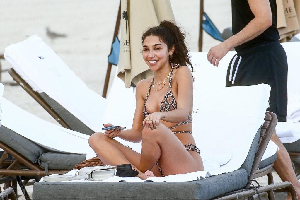 A estrela do Fappening Chantel Jeffries exibe sua figura em um biquíni com estampa de pele de cobra enquanto aproveita um dia na praia com suas amigas em Miami, 12/07/2020.