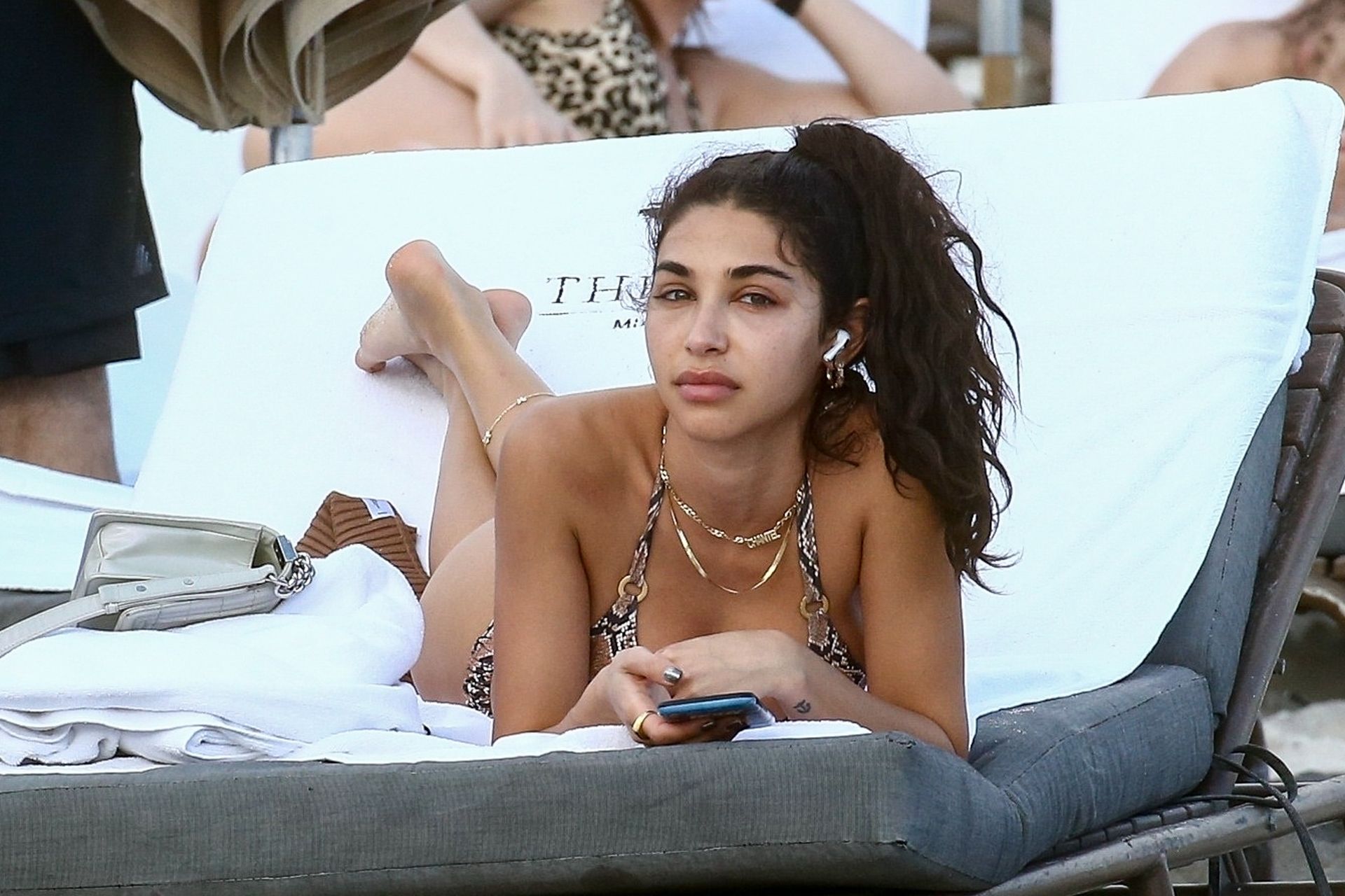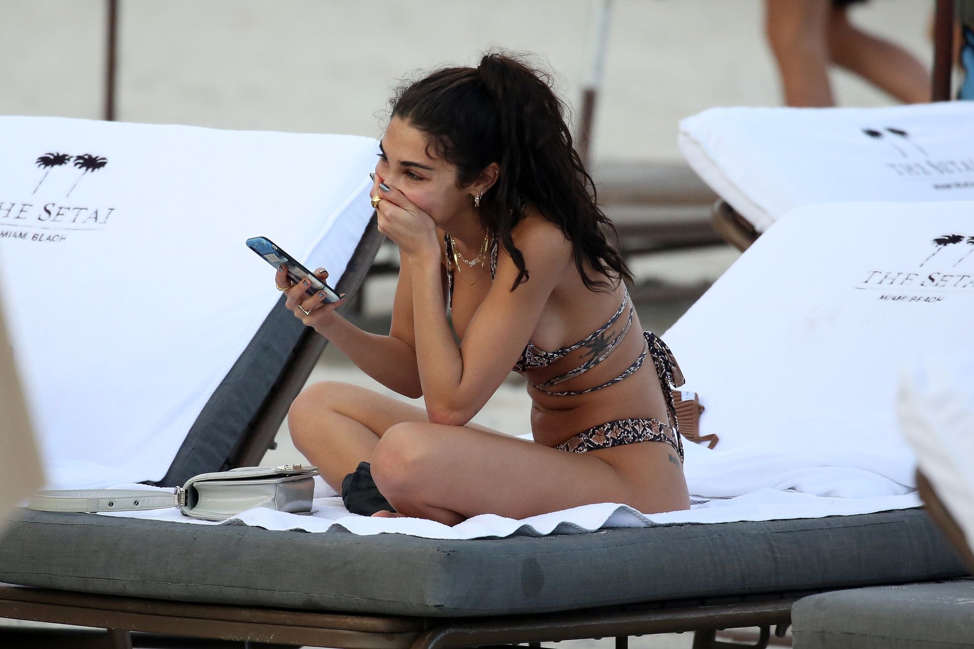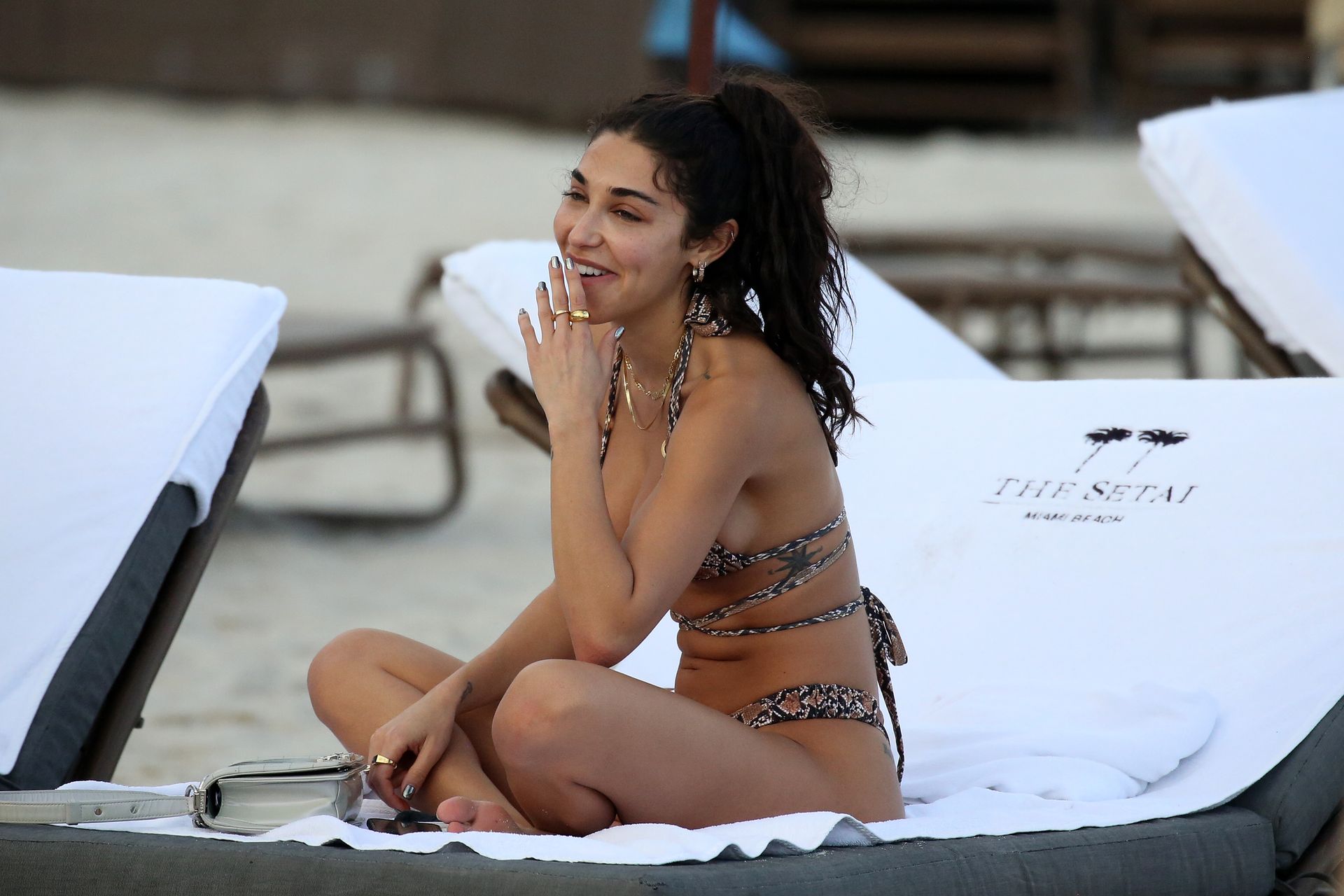 A estrela do Fappening Chantel Jeffries exibe sua figura em um biquíni com estampa de pele de cobra enquanto aproveita um dia na praia com suas amigas em Miami, 12/07/2020.