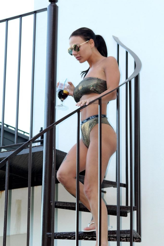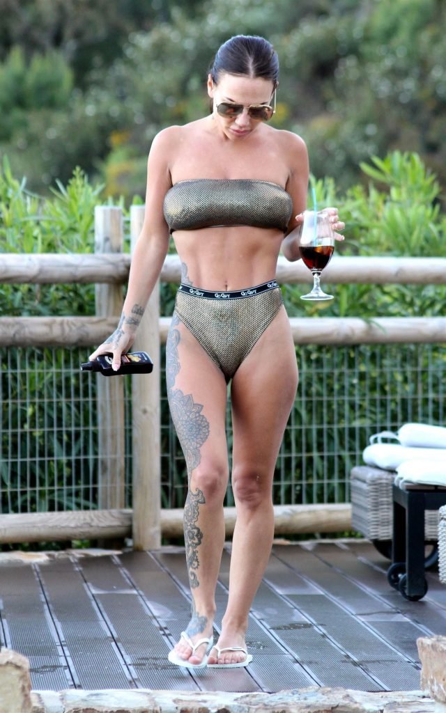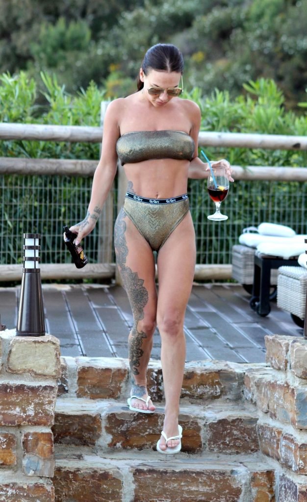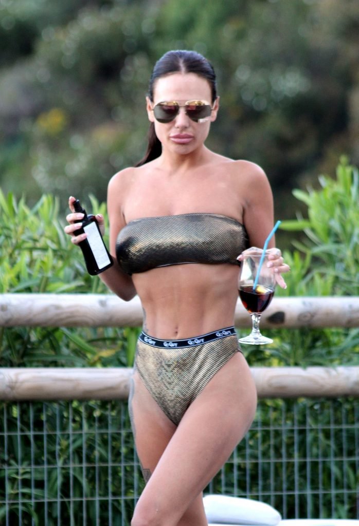 A ex-personalidade do Geordie Shore, Chantelle Connelly, 28, desfruta de um copo de Sangria enquanto exibe seu corpo sexy tatuado à beira da piscina durante férias em Marbella, Espanha, 05/05/2018.
