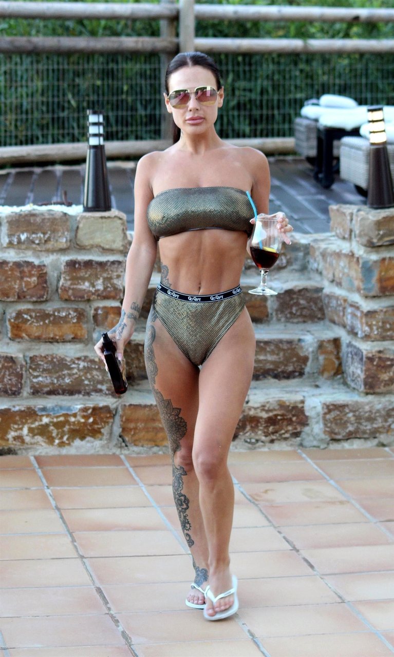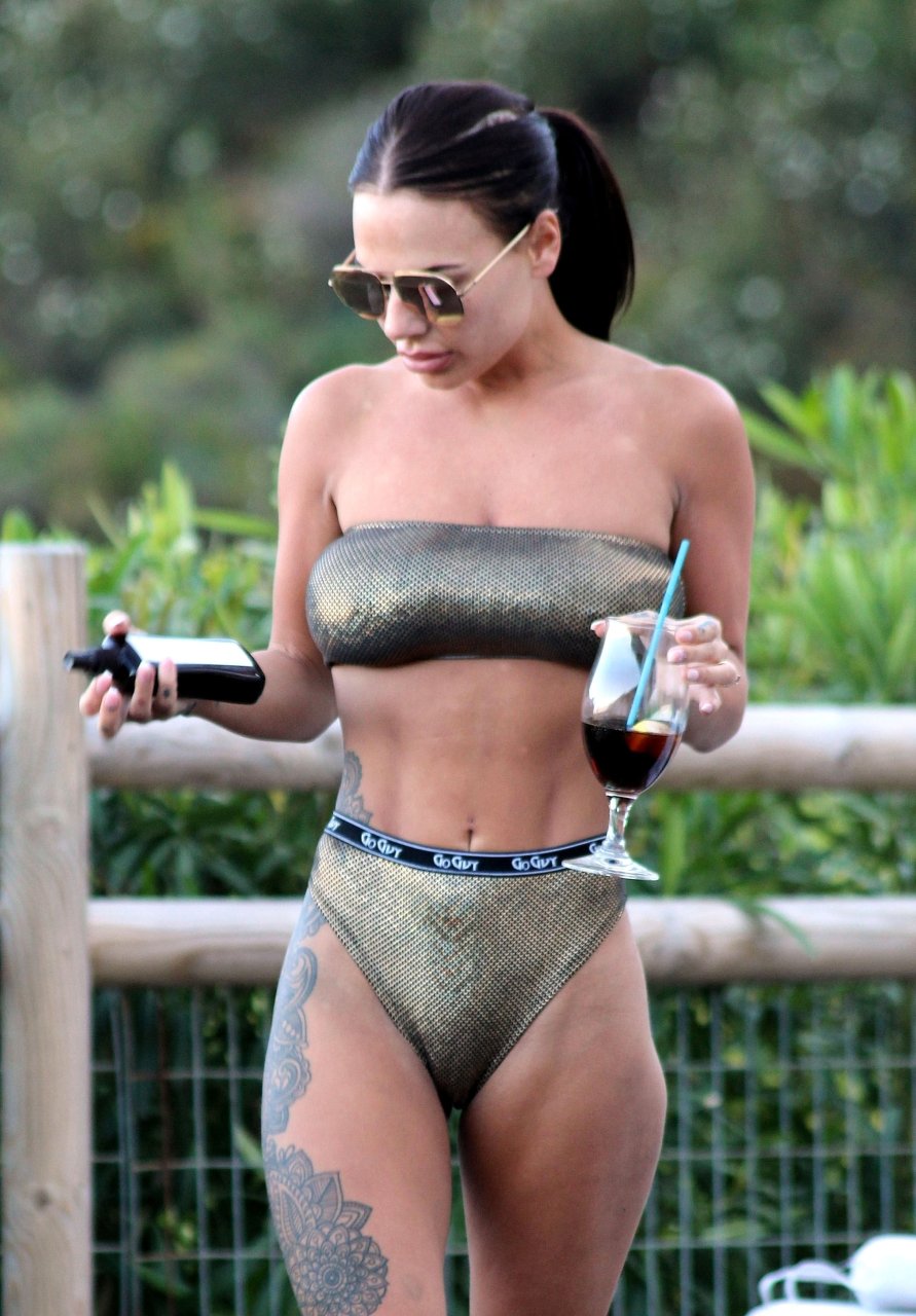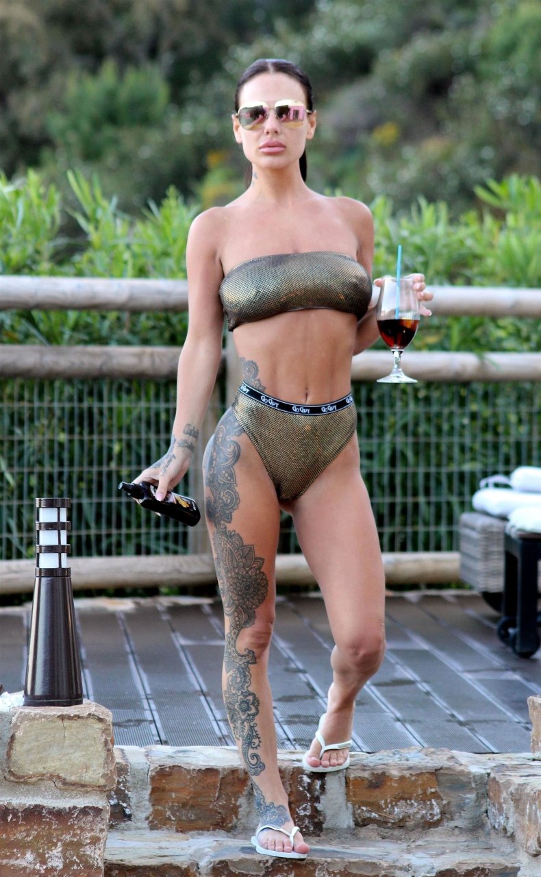 A ex-personalidade do Geordie Shore, Chantelle Connelly, 28, desfruta de um copo de Sangria enquanto exibe seu corpo sexy tatuado à beira da piscina durante férias em Marbella, Espanha, 05/05/2018.