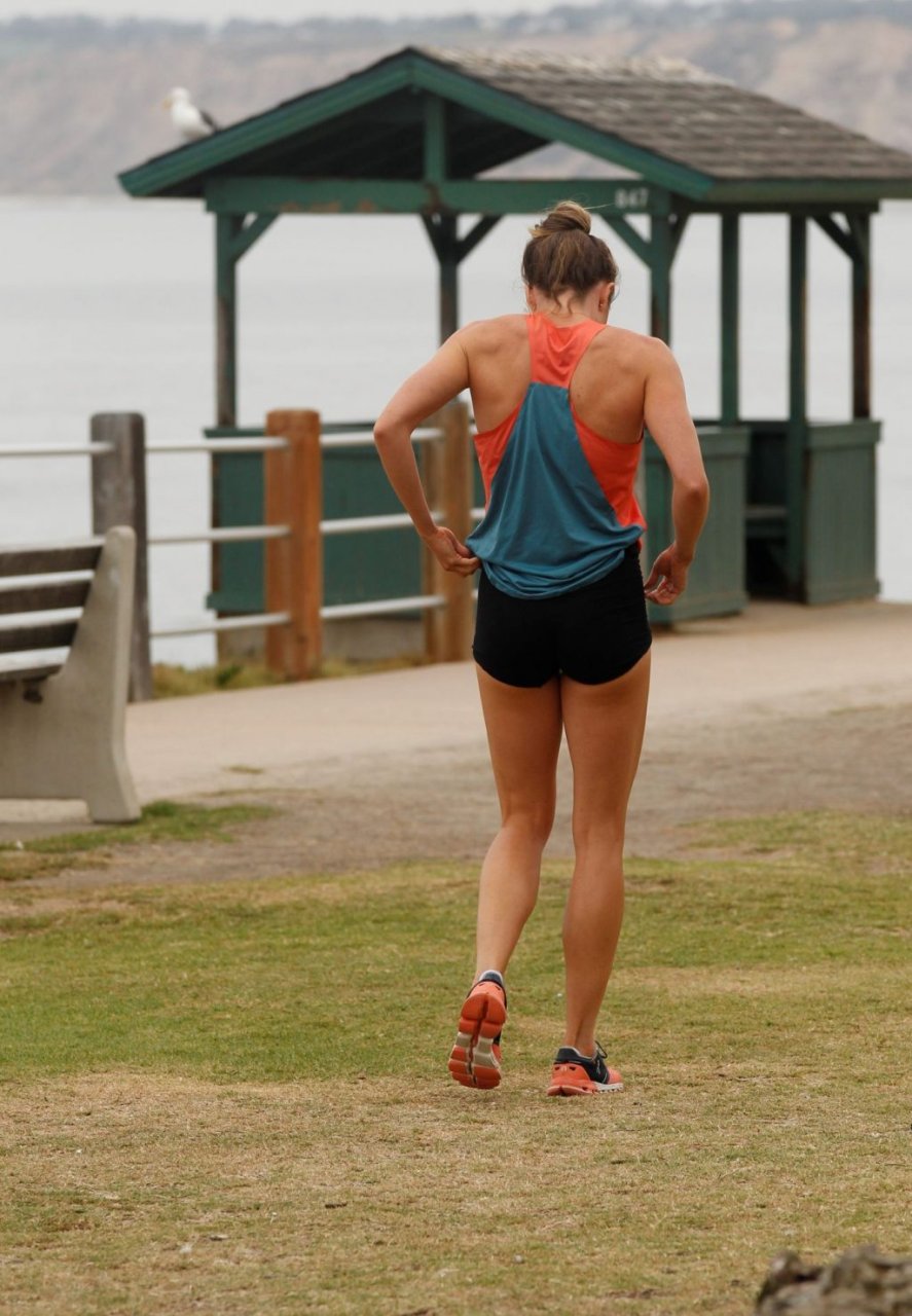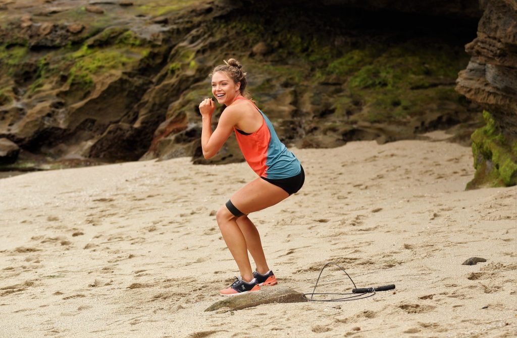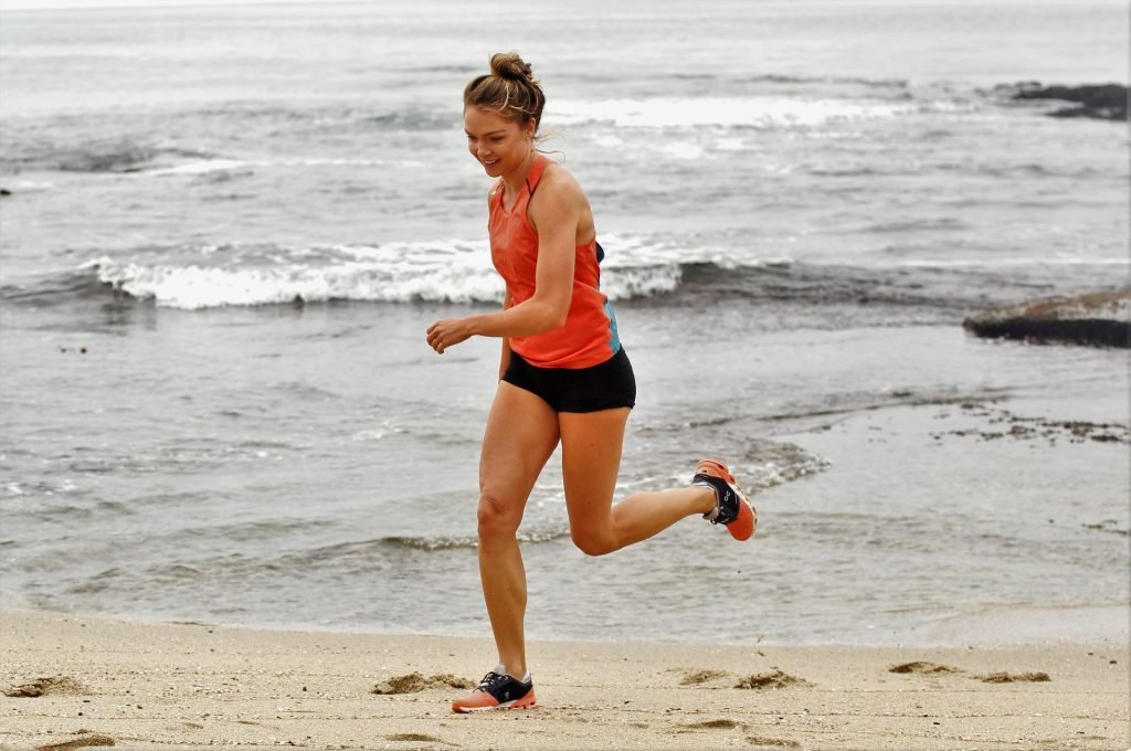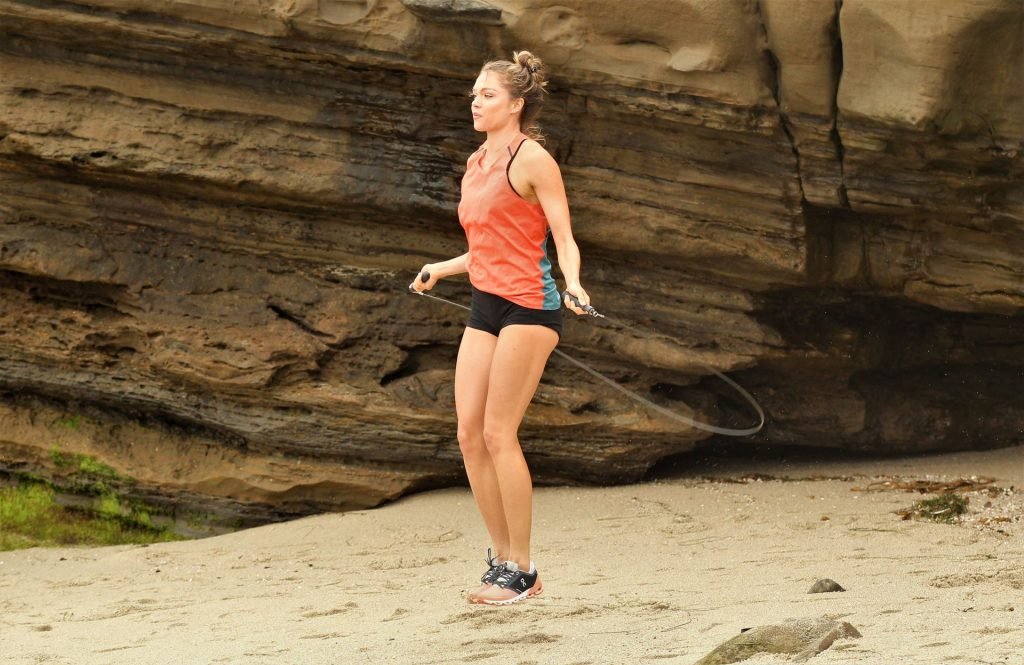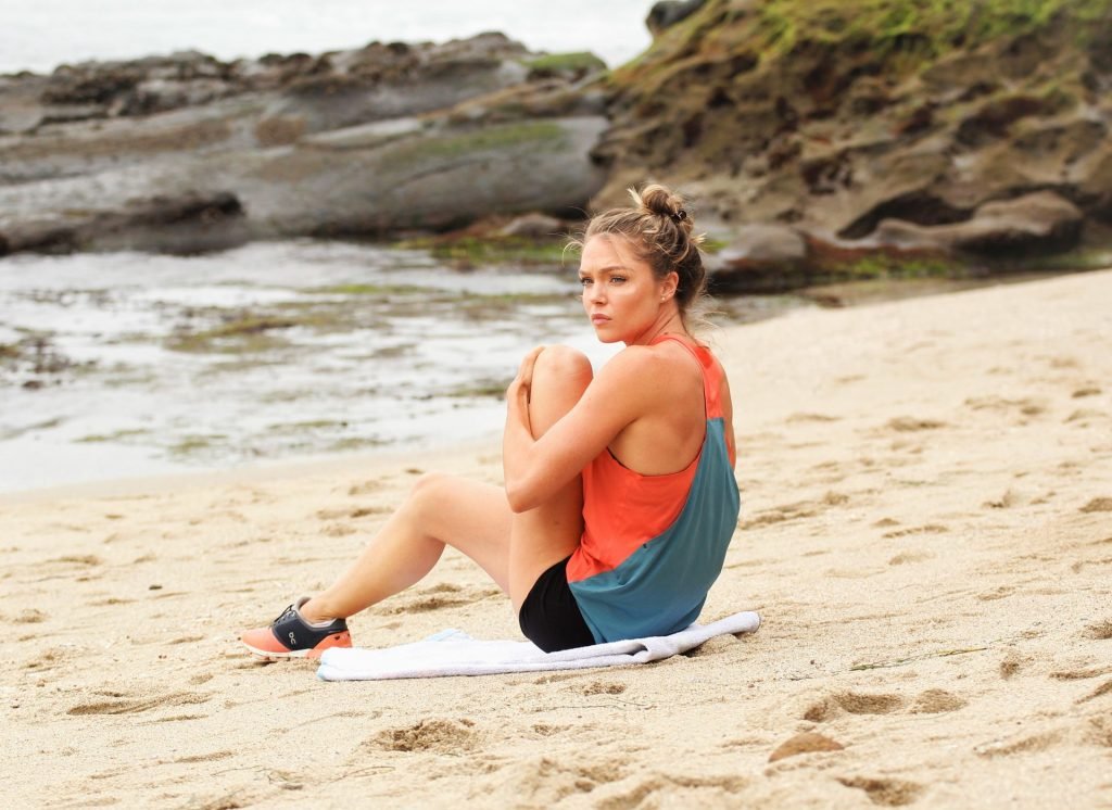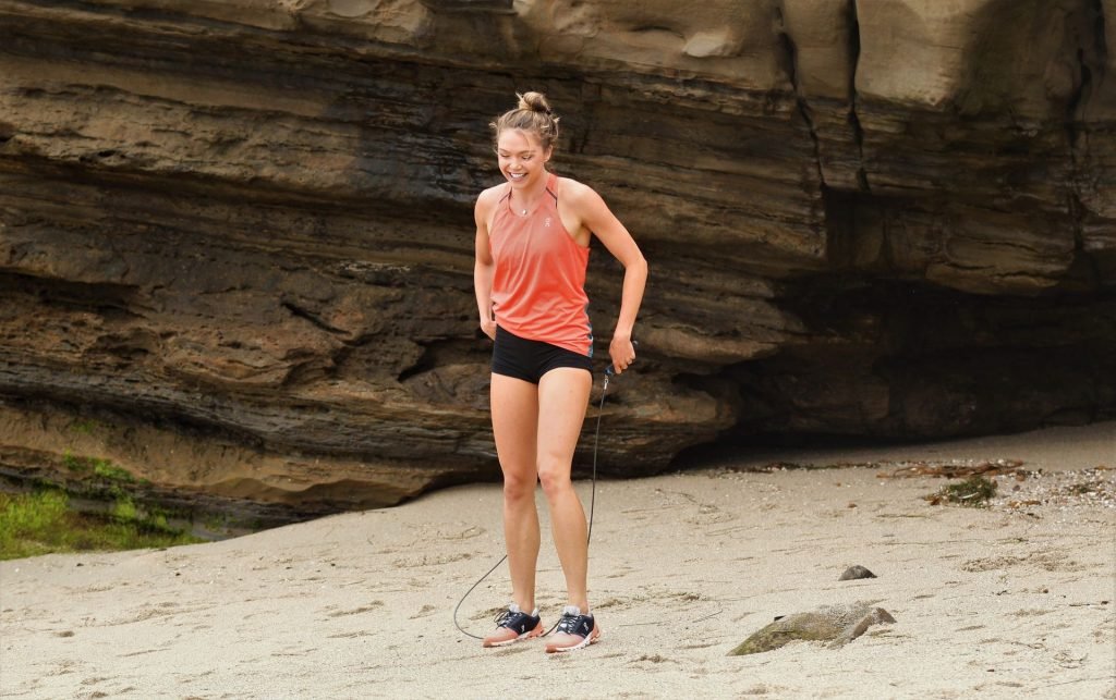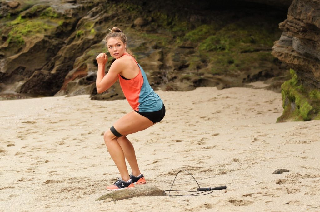 Heptatleta Chari Hawkins, uma das esperanças da Equipe EUA para medalhas em atletismo nas Olimpíadas de Tóquio no próximo ano, foi vista correndo e alongando nas areias da praia de San Diego, 09/07/2019.