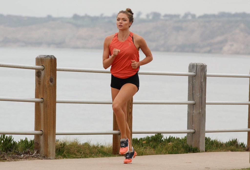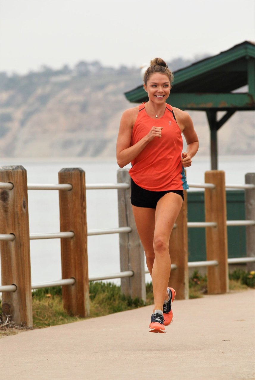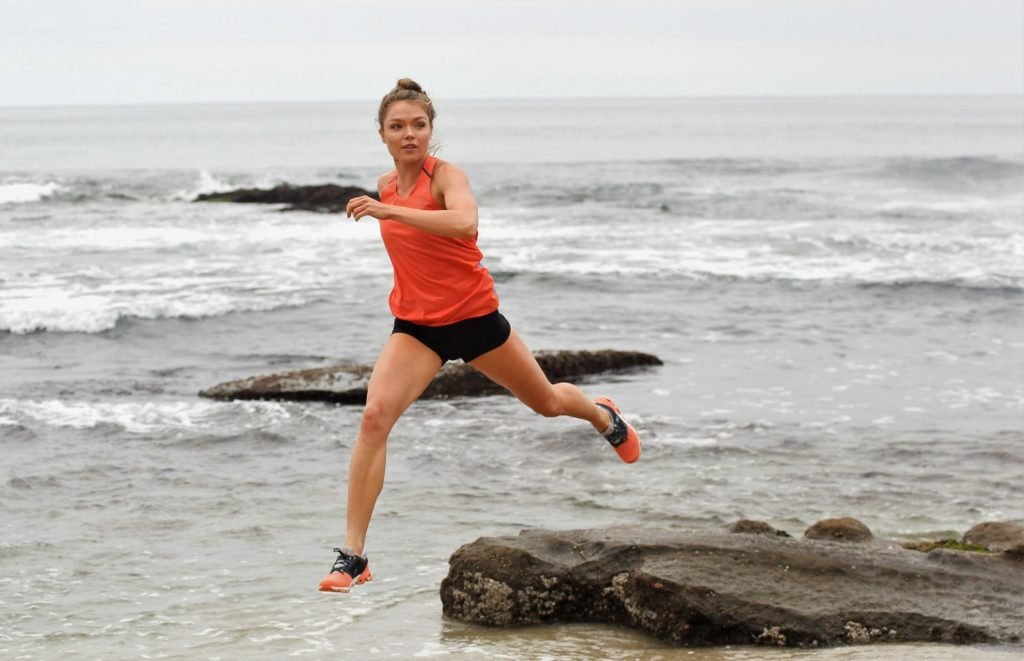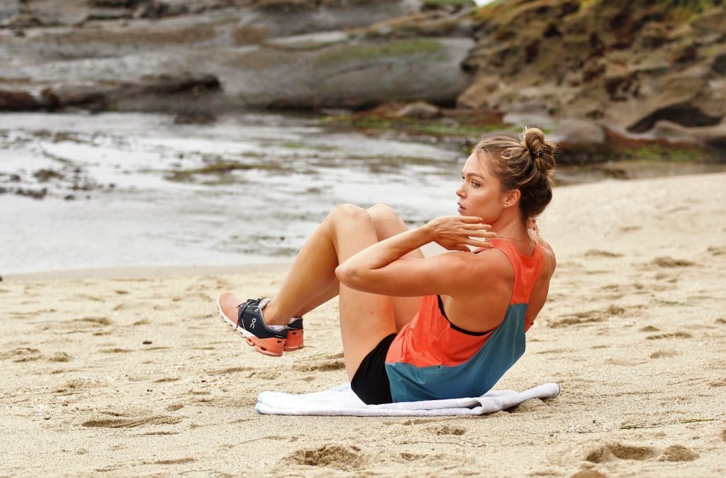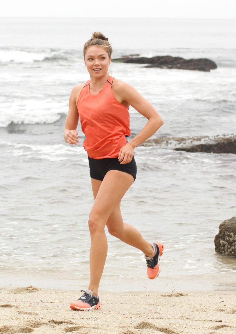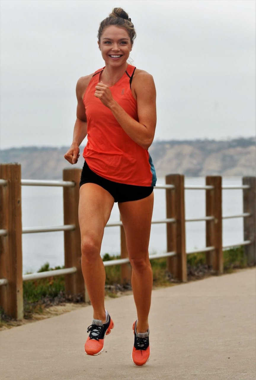 Heptatleta Chari Hawkins, uma das esperanças da Equipe EUA para medalhas em atletismo nas Olimpíadas de Tóquio no próximo ano, foi vista correndo e alongando nas areias da praia de San Diego, 09/07/2019.