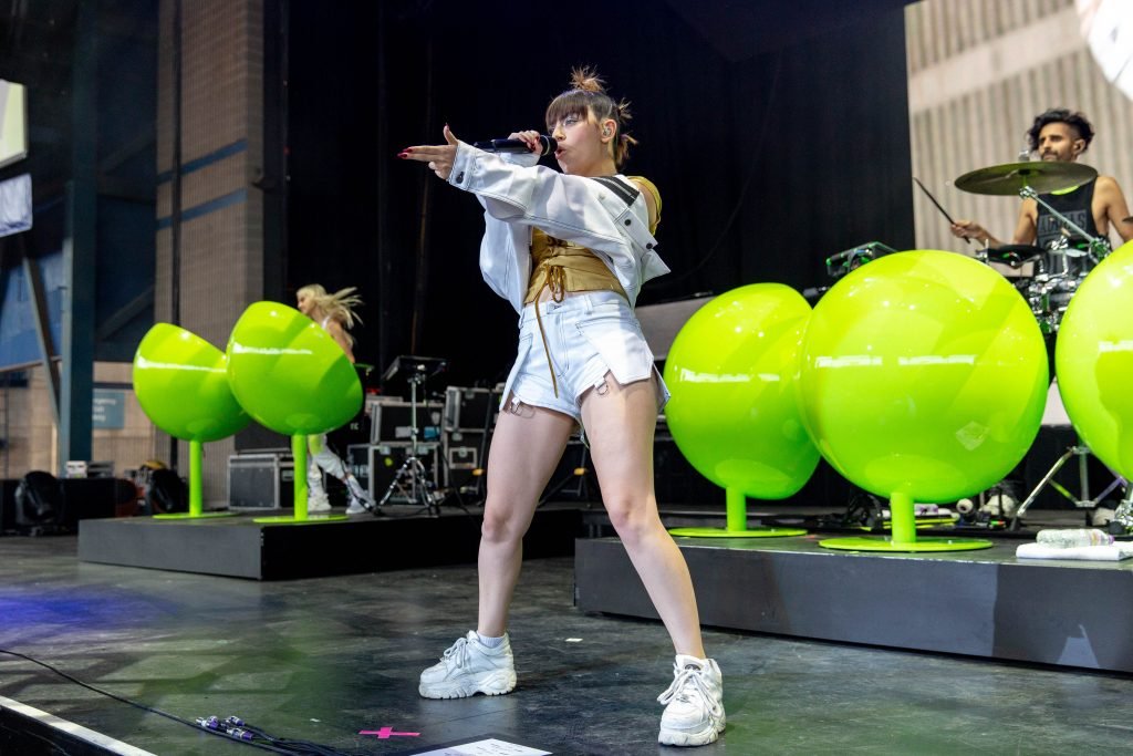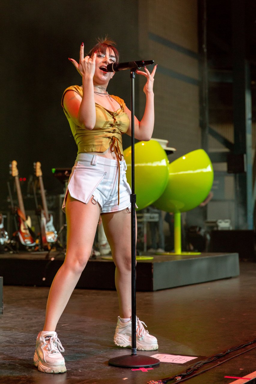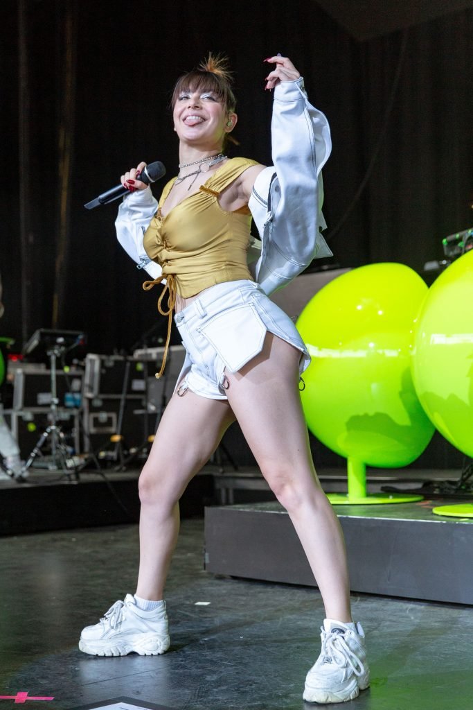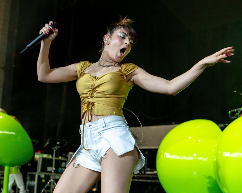 A cantora Charli XCX se apresentou durante o Summerfest Music Festival no Henry Maier Festival Park em Milwaukee, Wisconsin, em 05/07/2018. Ela usava um top dourado com mamilos visíveis e shorts brancos.