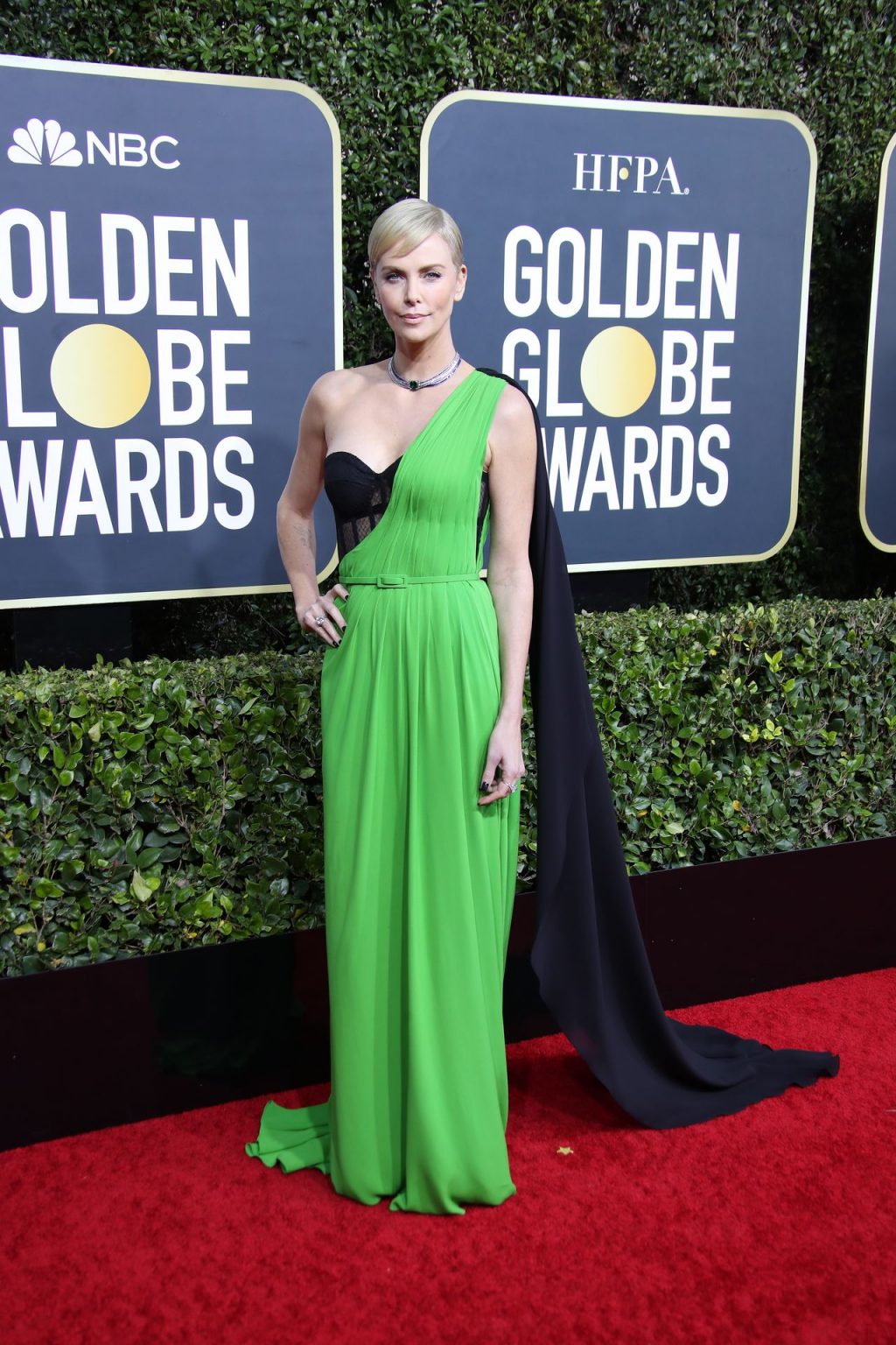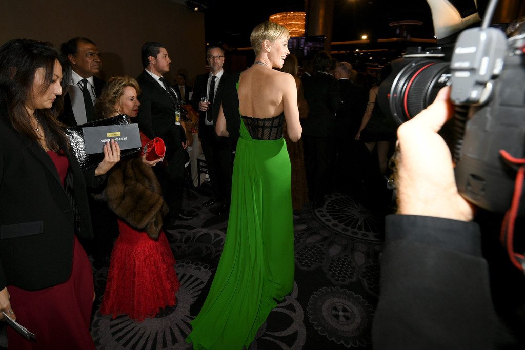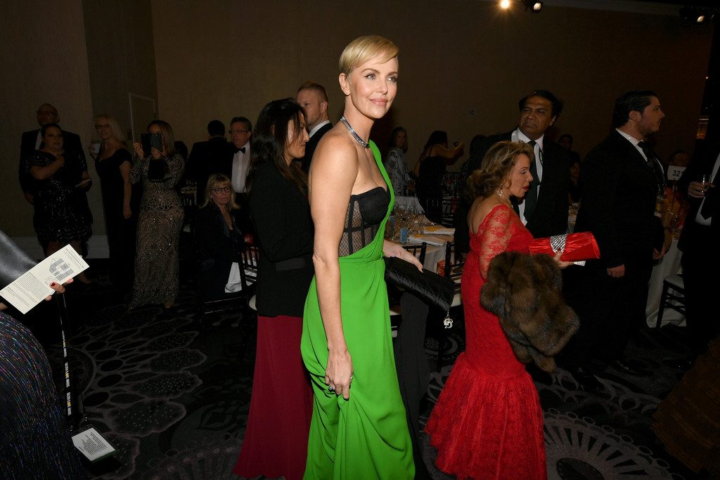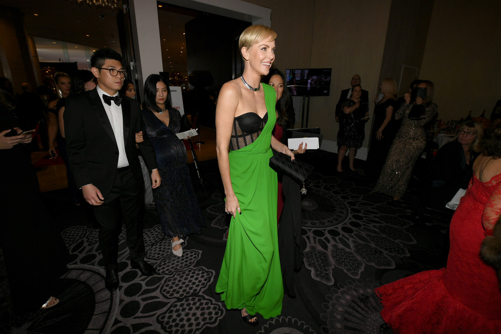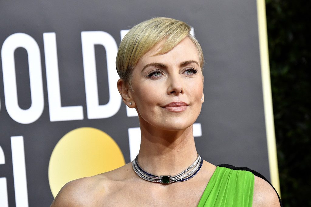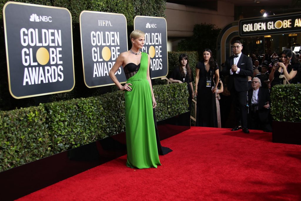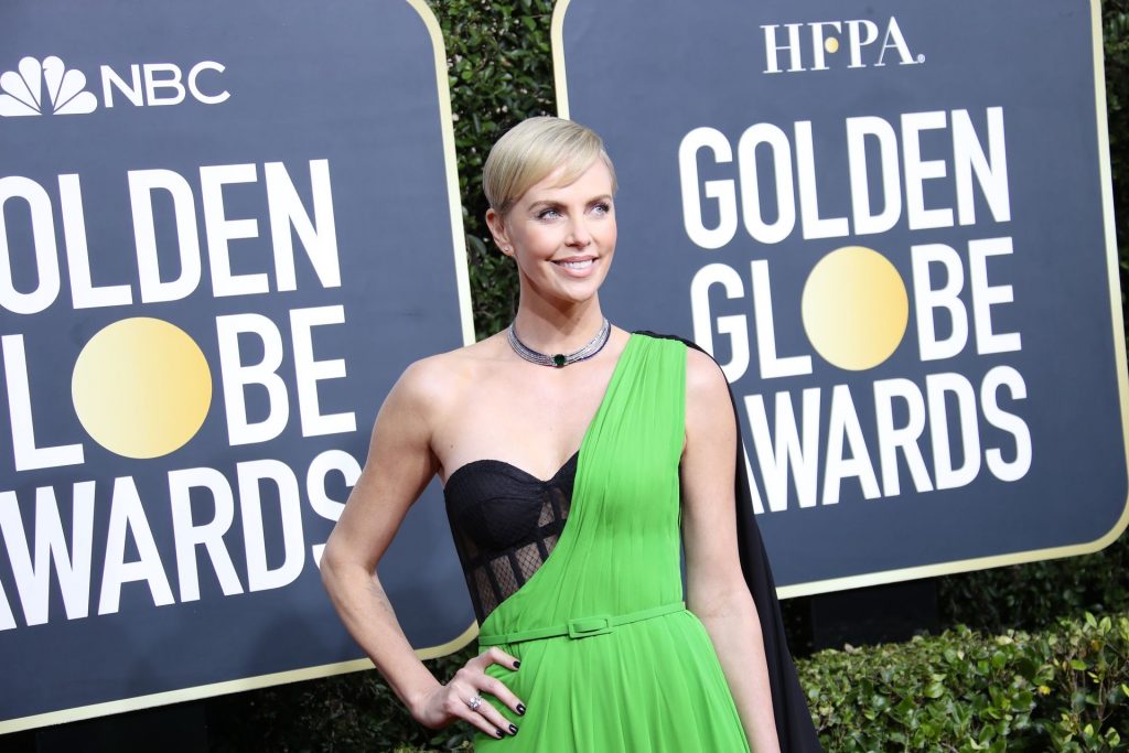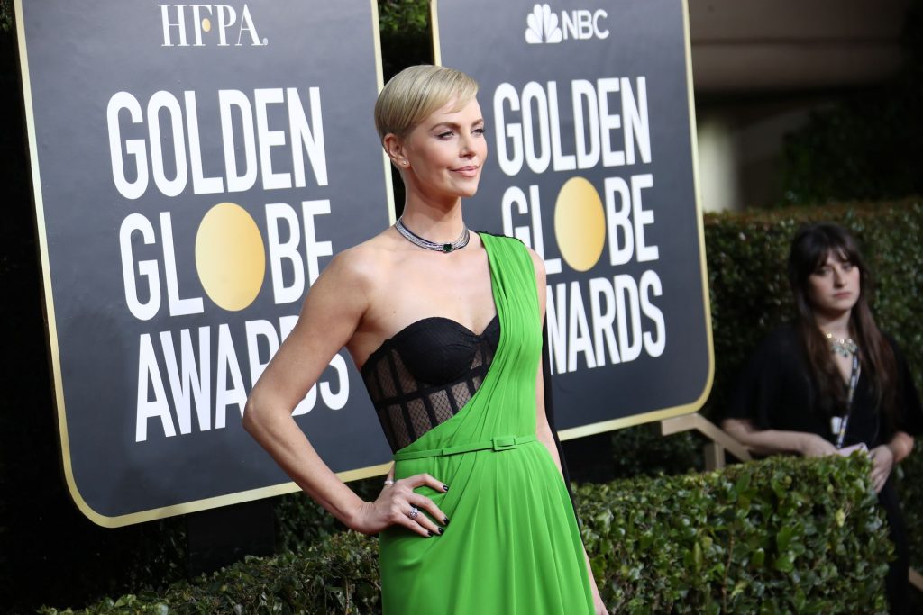 Charlize Theron diz que Bombshell (2019) prova que o #MeToo é uma questão bipartidária enquanto ela caminha no tapete vermelho do Golden Globes em Beverly Hills, 01/05/2020. Graças ao seu papel no filme Bombshell (2019), no qual interpreta a ex-apresentadora da Fox News Megyn Kelly, a atriz está indicada a Melhor Atriz em Drama.