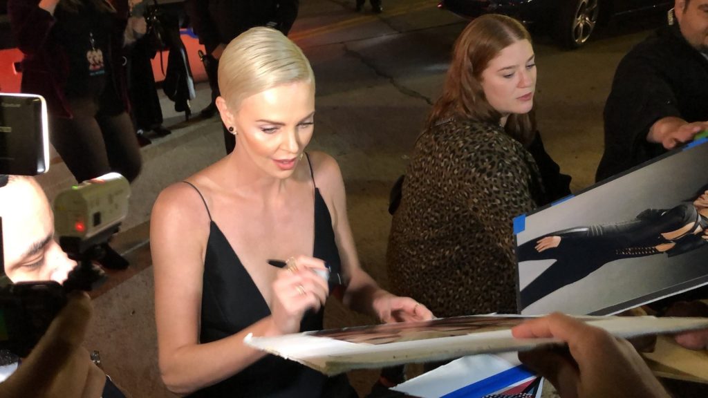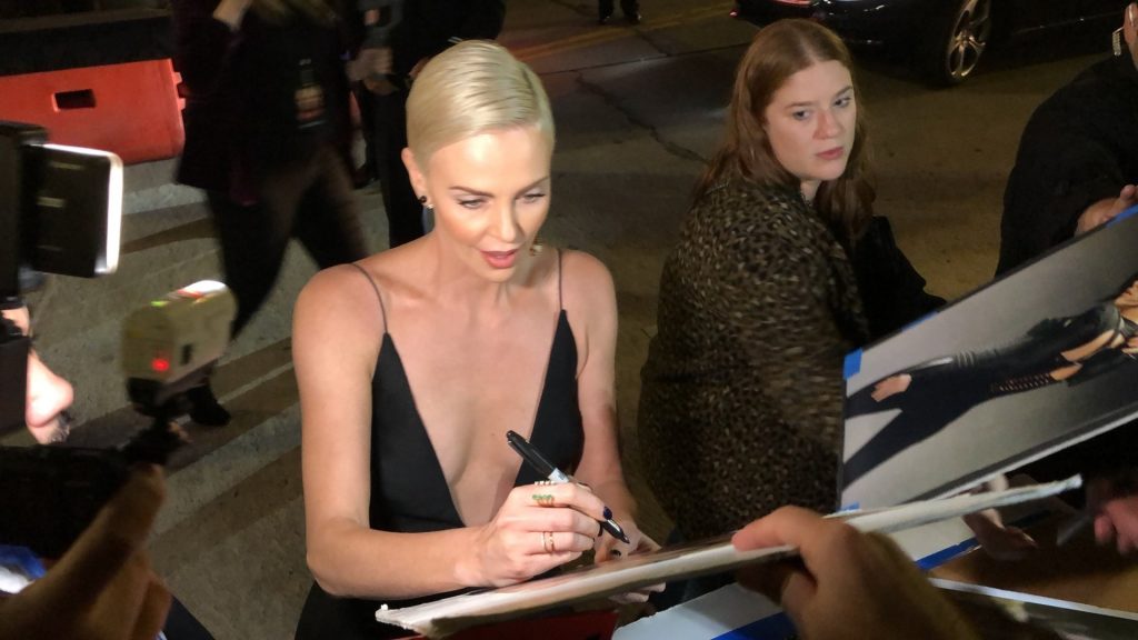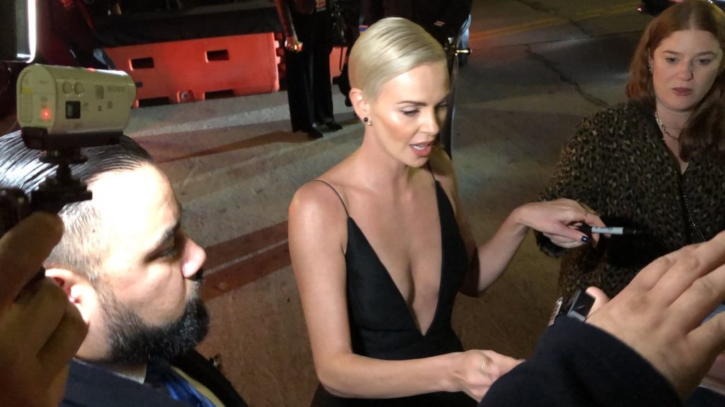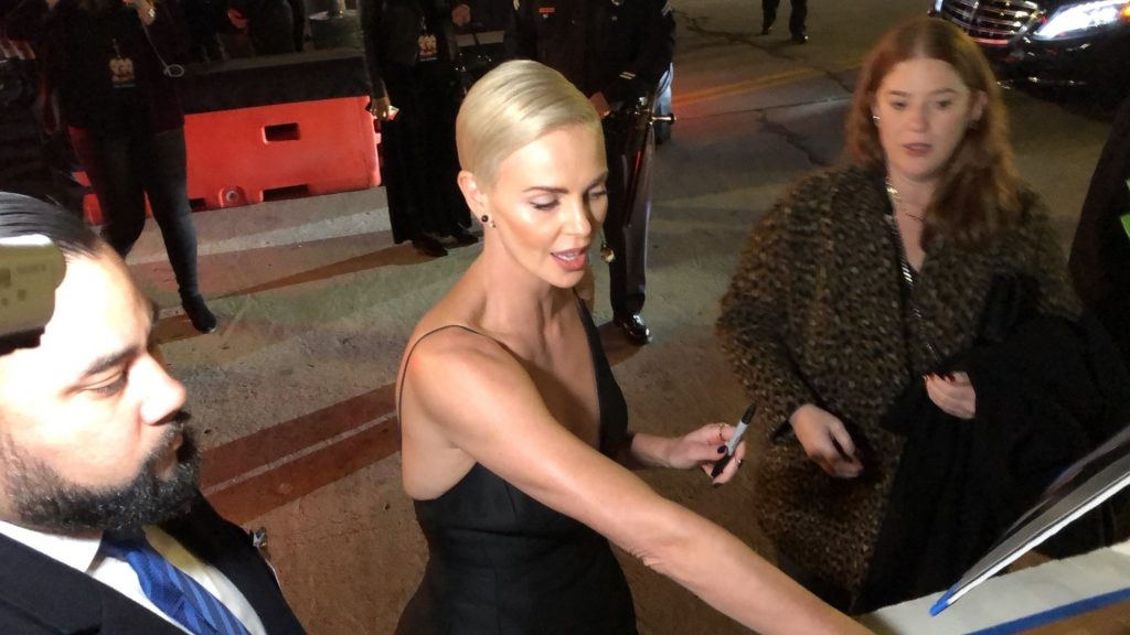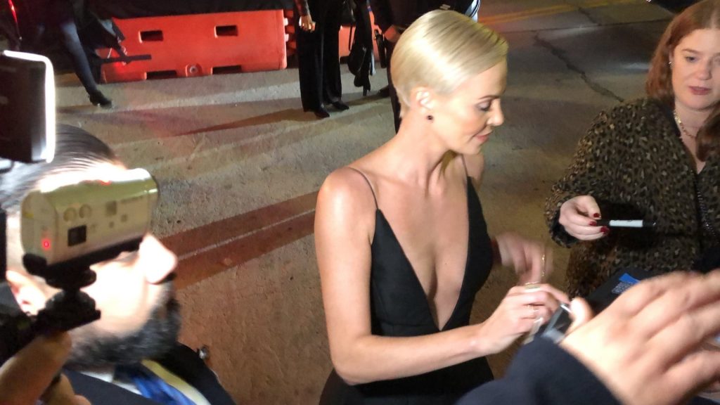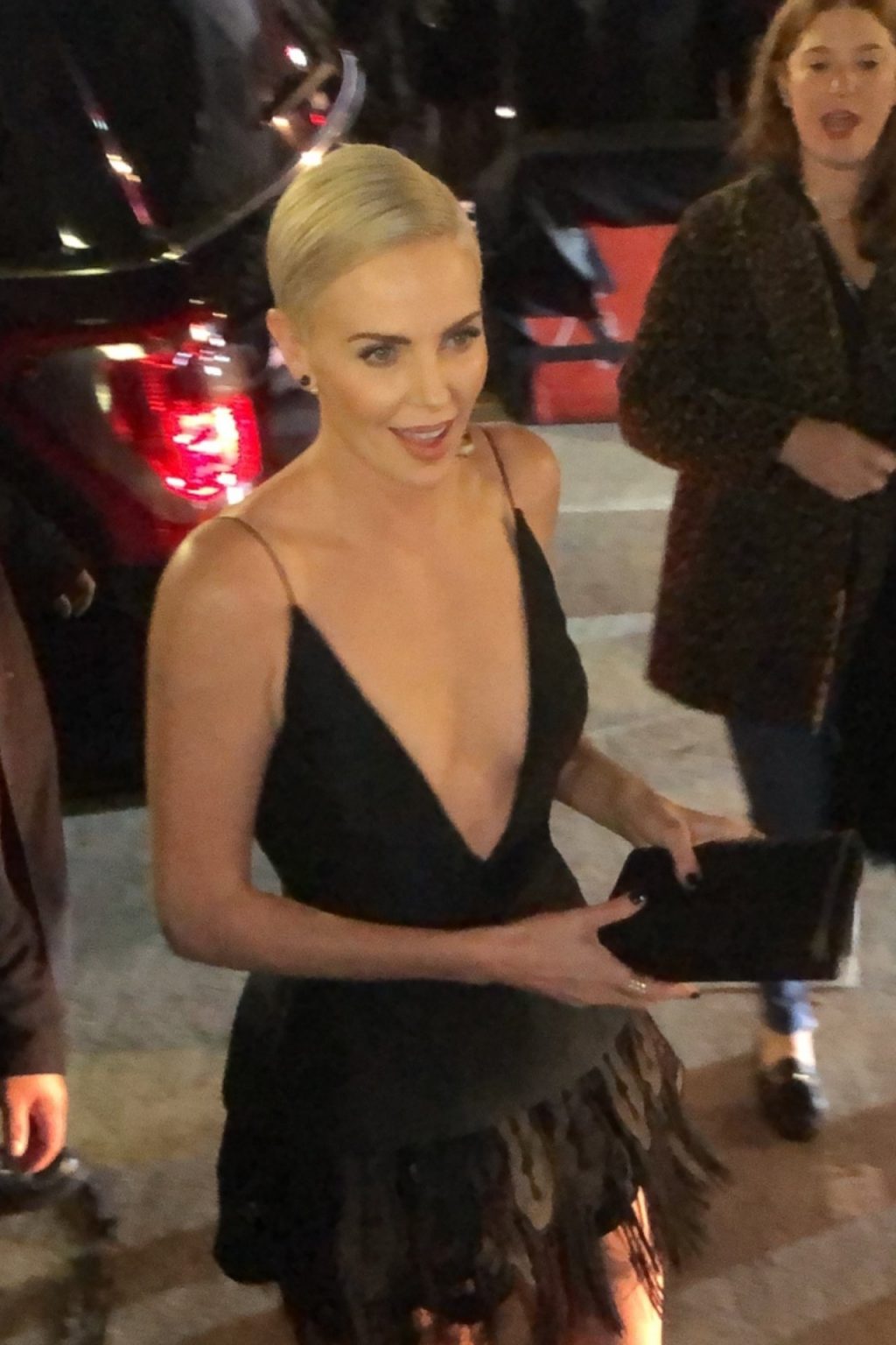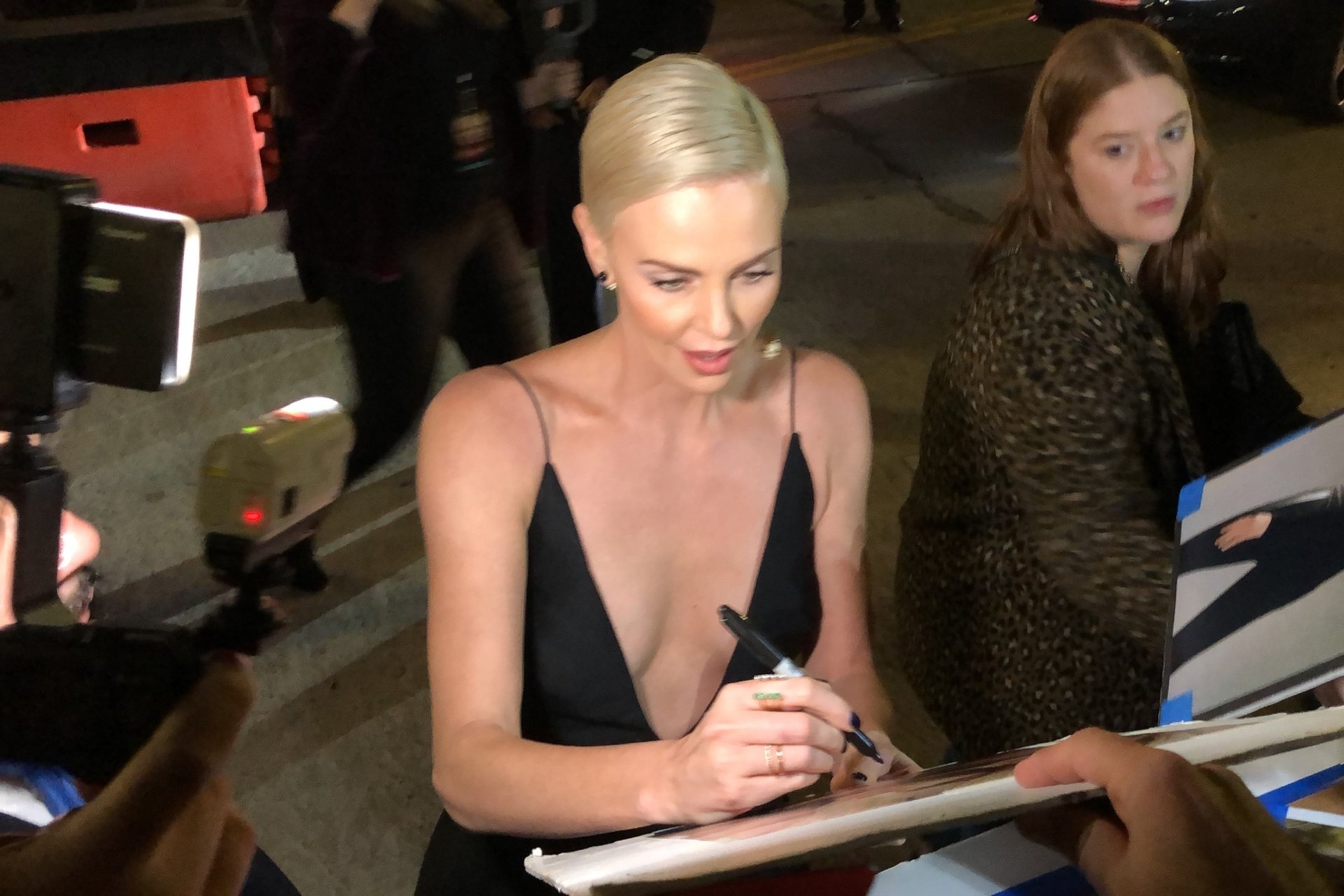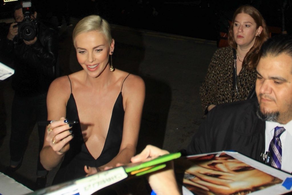 Charlize Theron exibiu seu decote e pernas esbeltas na Exibição Especial de ‘Bombshell’ no Regency Village em Los Angeles, Califórnia, 10/12/2019. A atriz também cumprimentou os fãs com um vestido preto sexy e decotado.