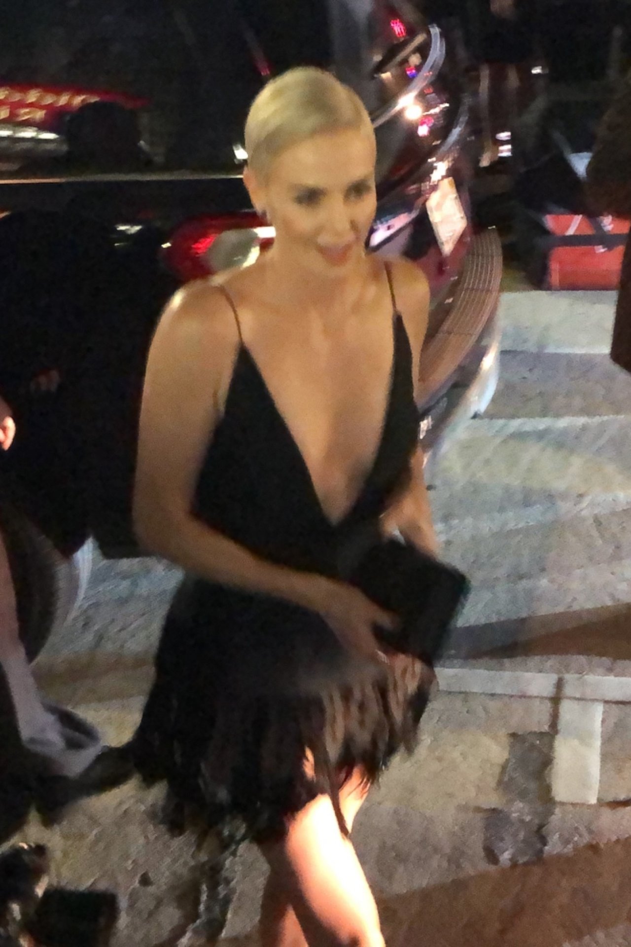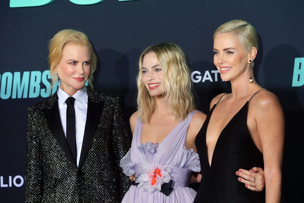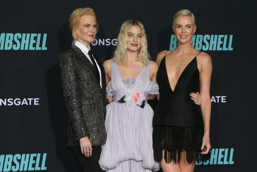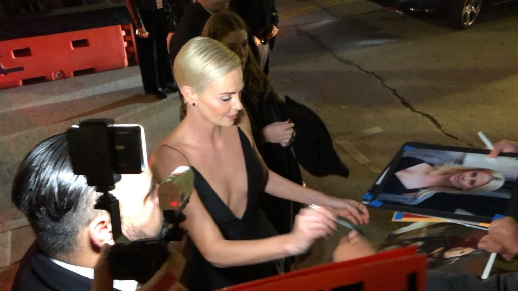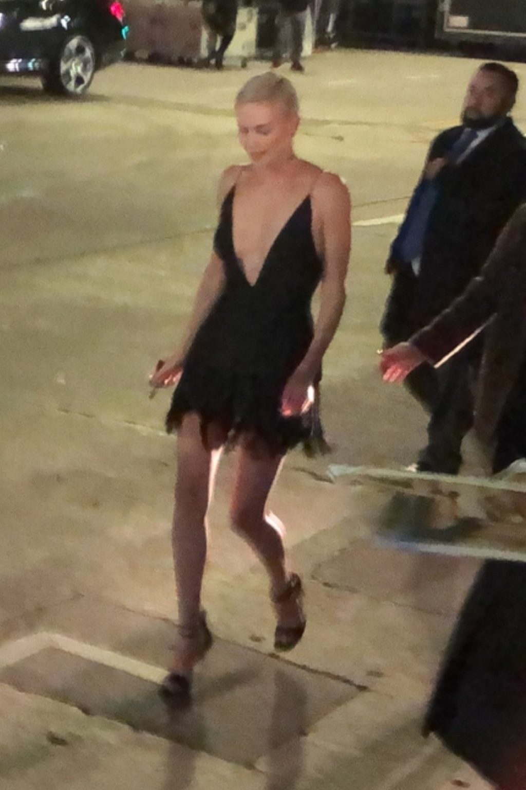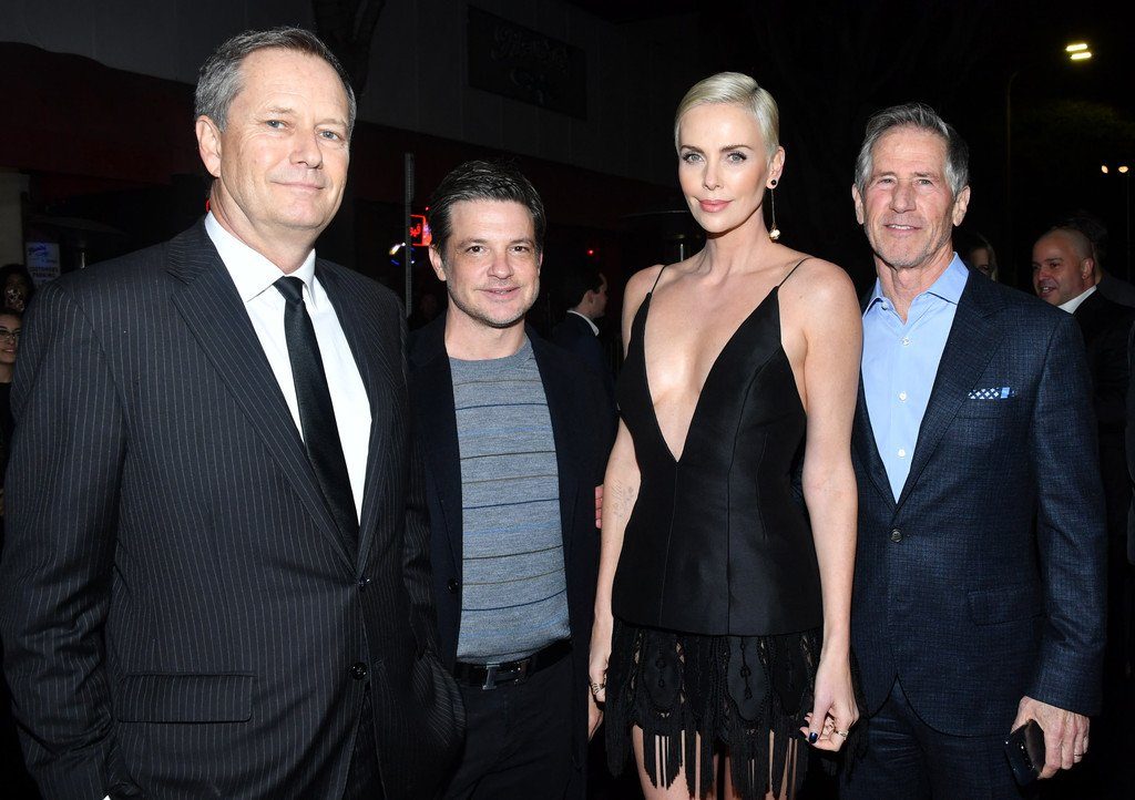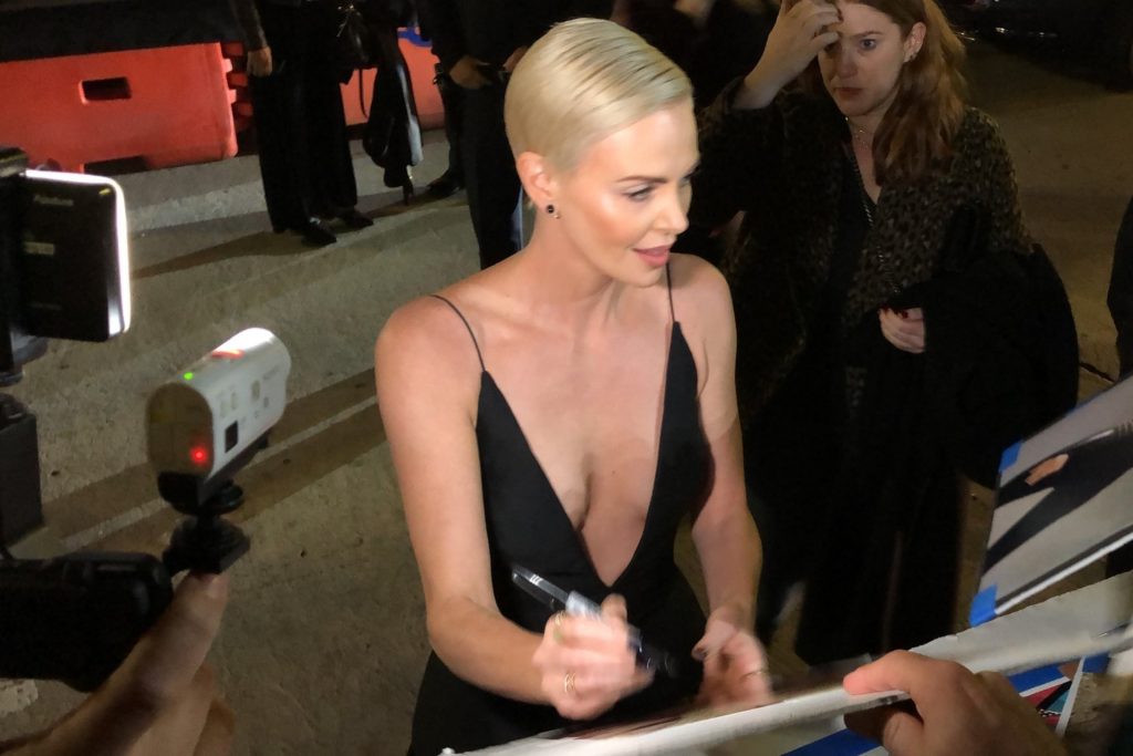 Charlize Theron exibiu seu decote e pernas esbeltas na Exibição Especial de ‘Bombshell’ no Regency Village em Los Angeles, Califórnia, 10/12/2019. A atriz também cumprimentou os fãs com um vestido preto sexy e decotado.