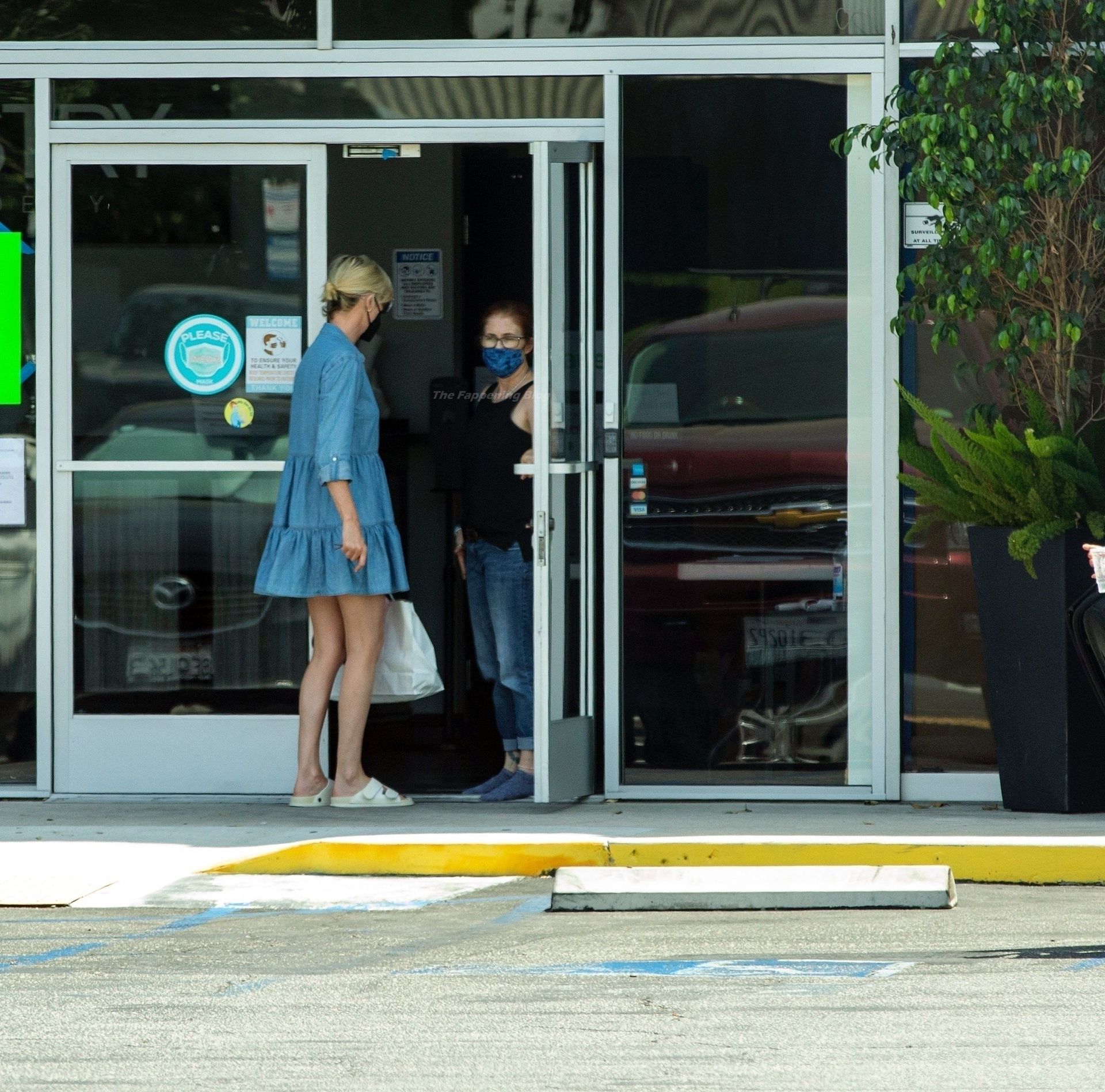 A estrela de cinema chegou à aula de dança da filha vestindo um vestido azul com botões e sandálias brancas.
