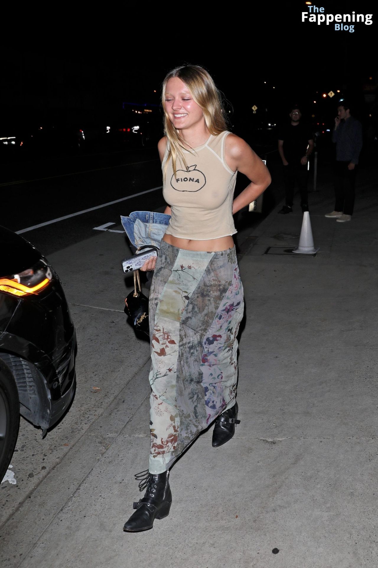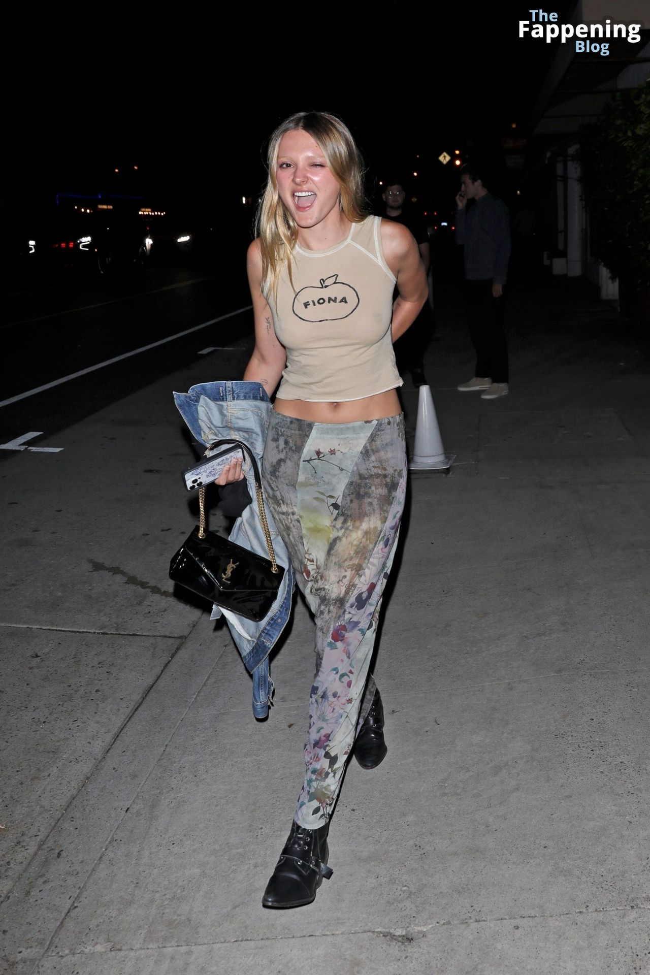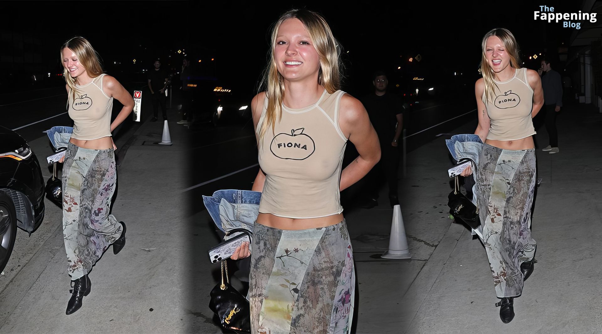 A cantora Charlotte Lawrence está só sorrisos ao ser flagrada usando um top transparente, mandando um alô para a colega cantora Fiona Apple depois de comer no restaurante italiano Giorgio Baldi em Santa Monica.