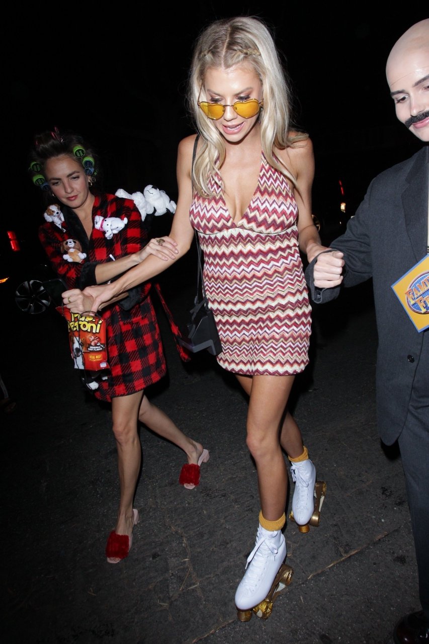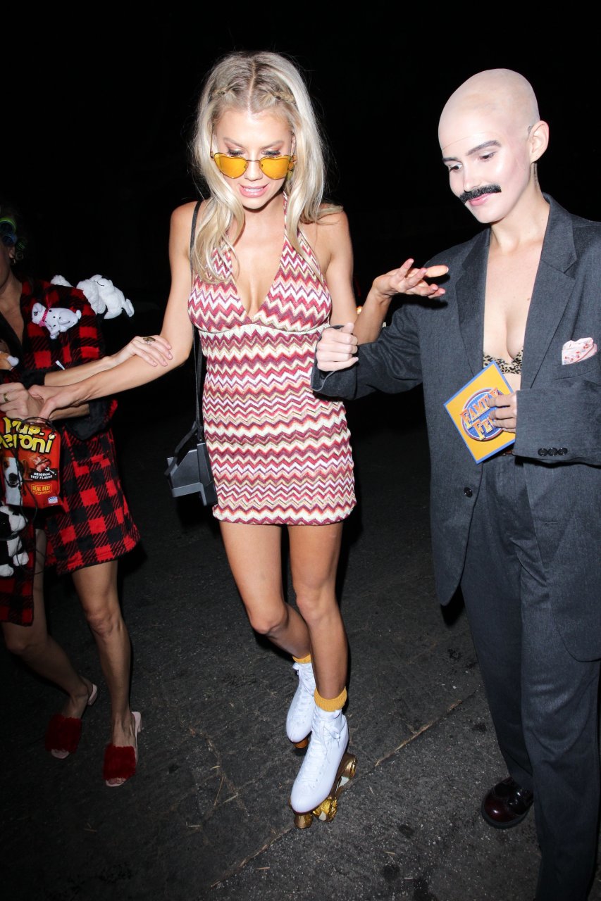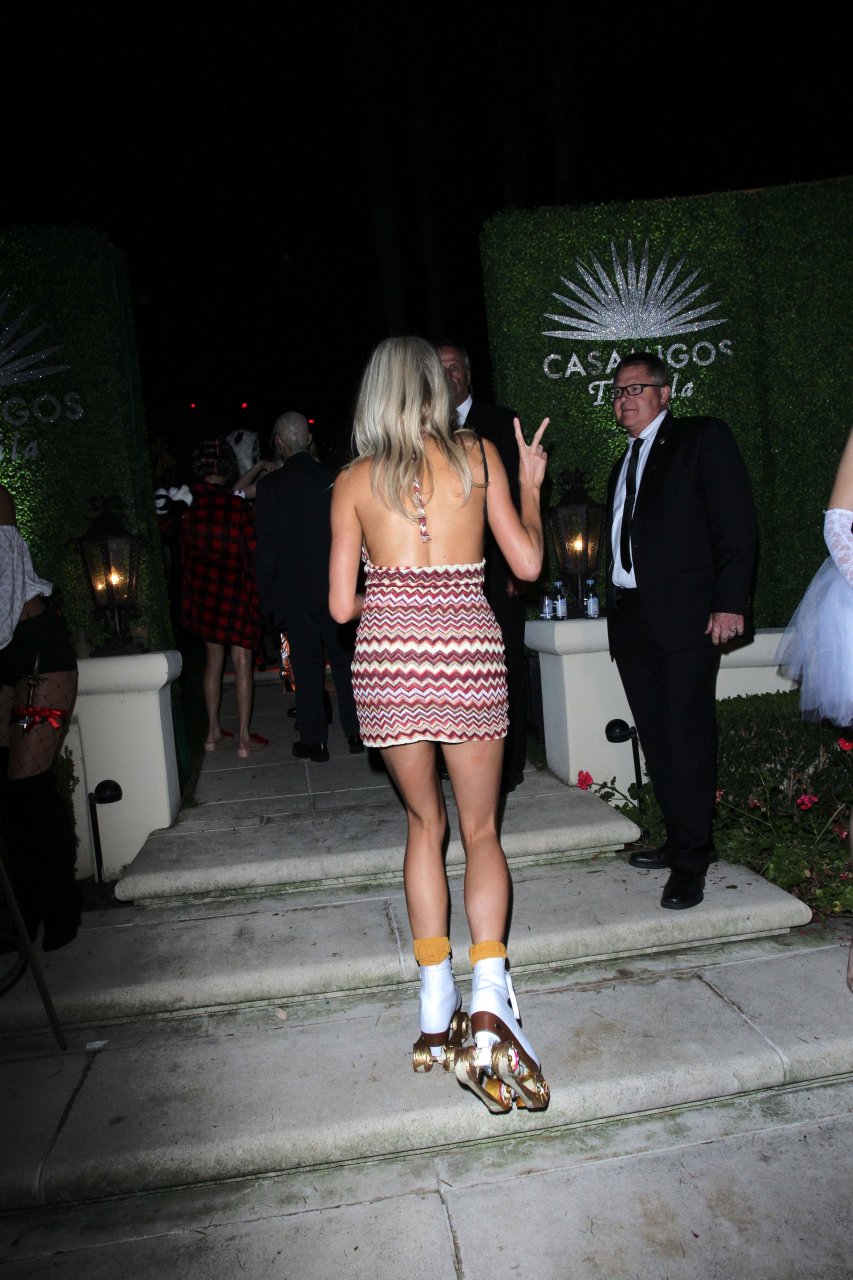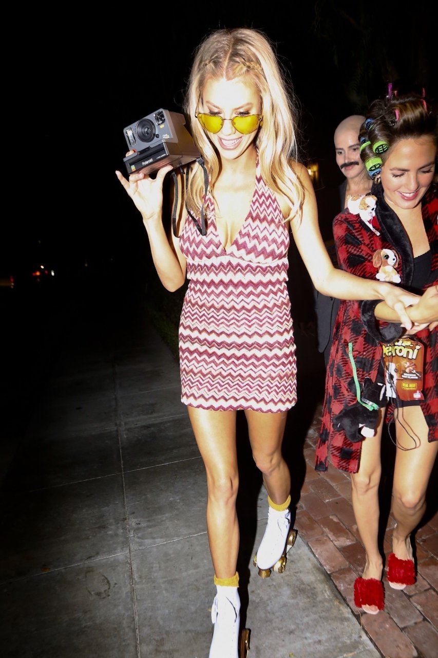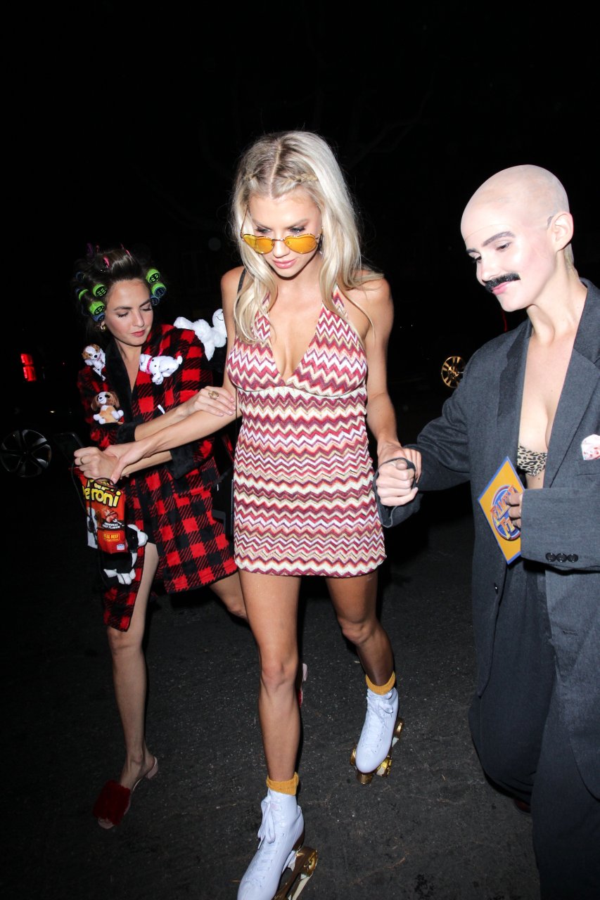Model e atriz Charlotte McKinney mostra sua roupa íntima, bunda, buceta e seios enquanto brinca com as câmeras ao sair como a Roller Girl de Boogie Nights na festa de Halloween da Casamigos em Beverly Hills, 27/10/2018.