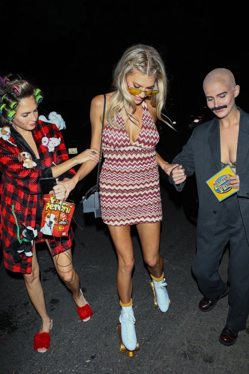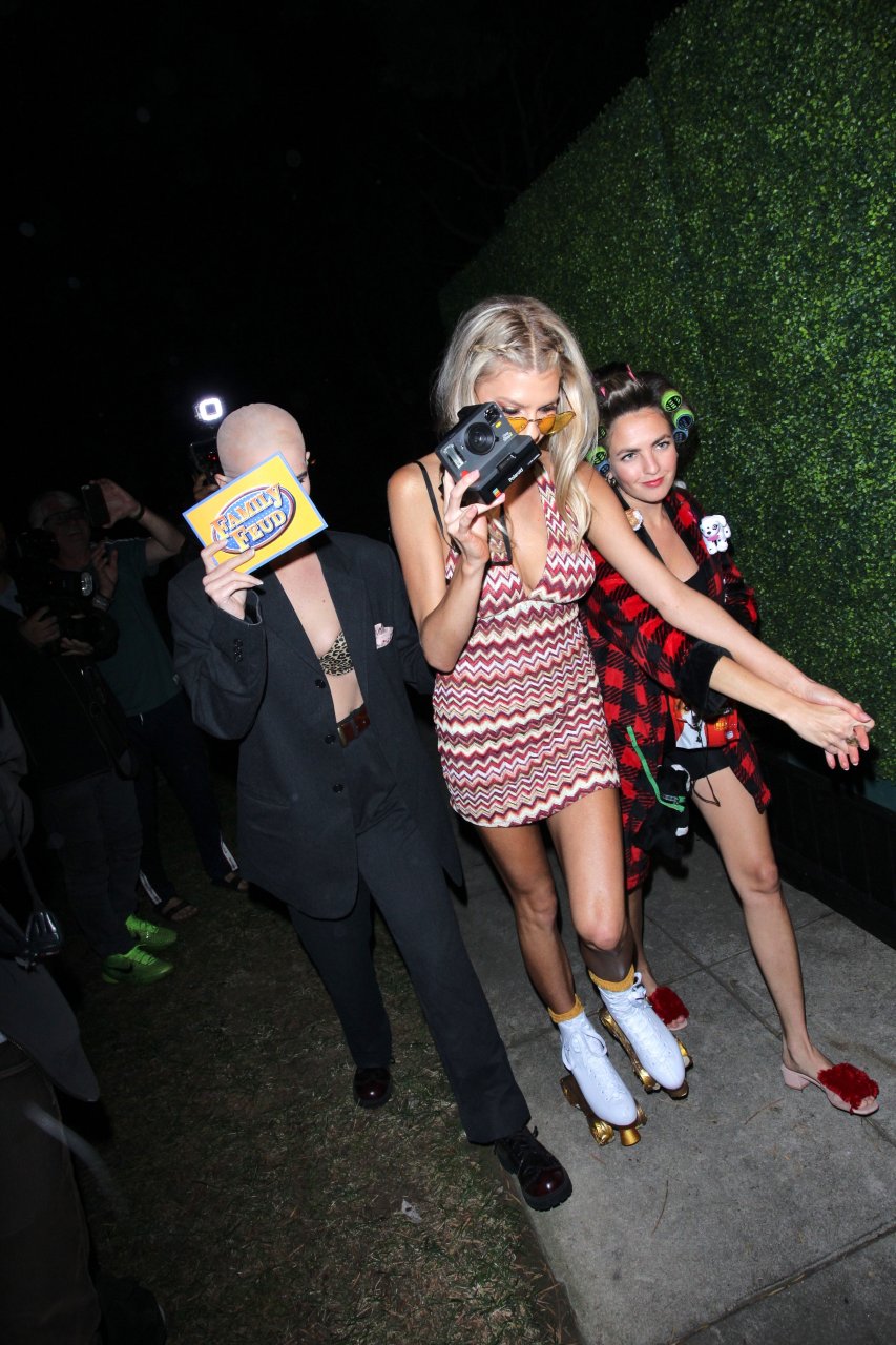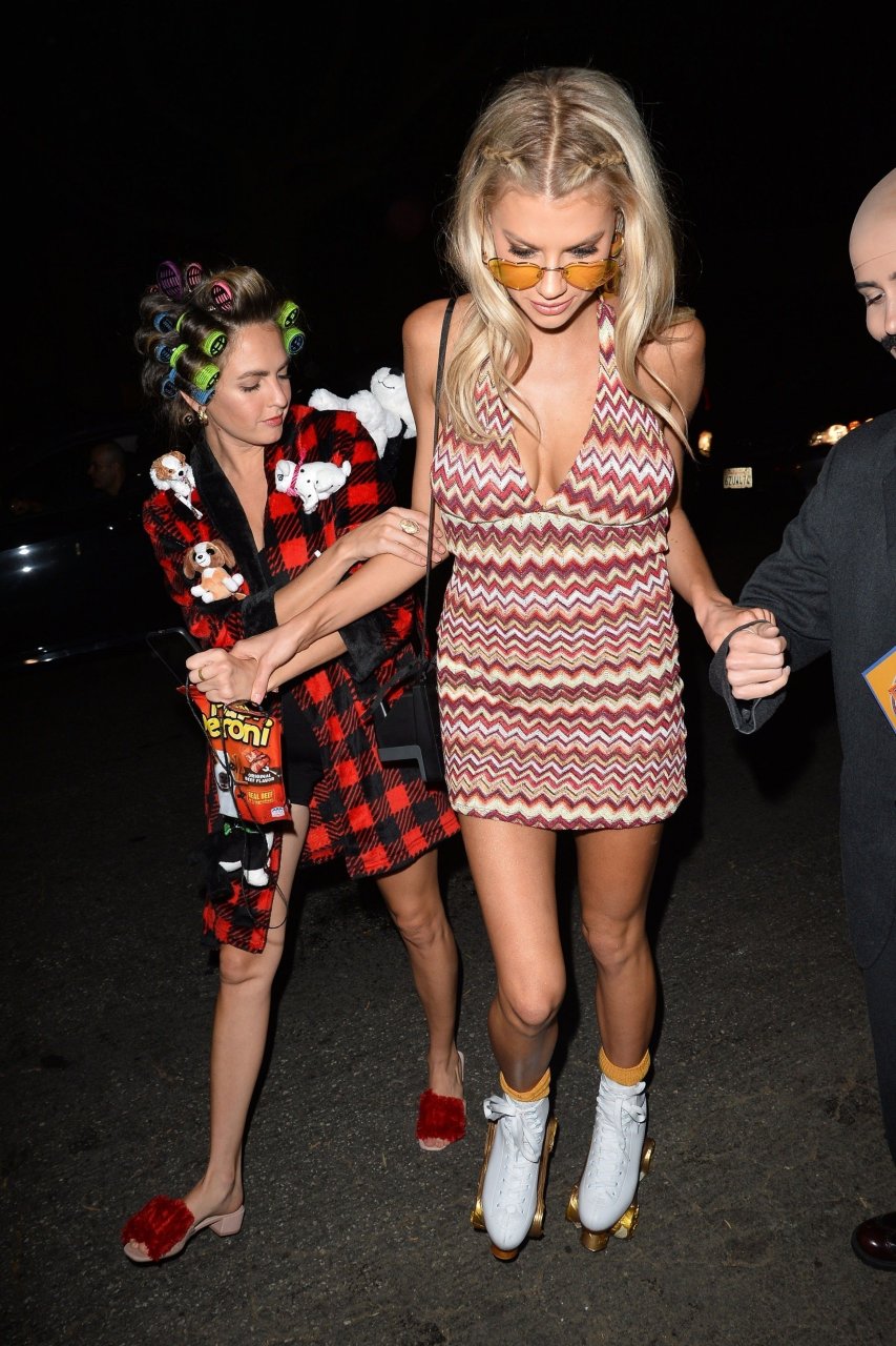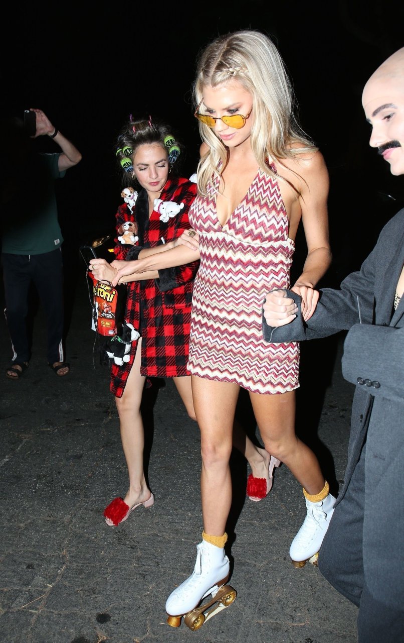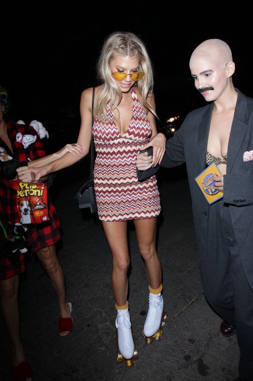 Model e atriz Charlotte McKinney mostra sua roupa íntima, bunda, buceta e seios enquanto brinca com as câmeras ao sair como a Roller Girl de Boogie Nights na festa de Halloween da Casamigos em Beverly Hills, 27/10/2018.