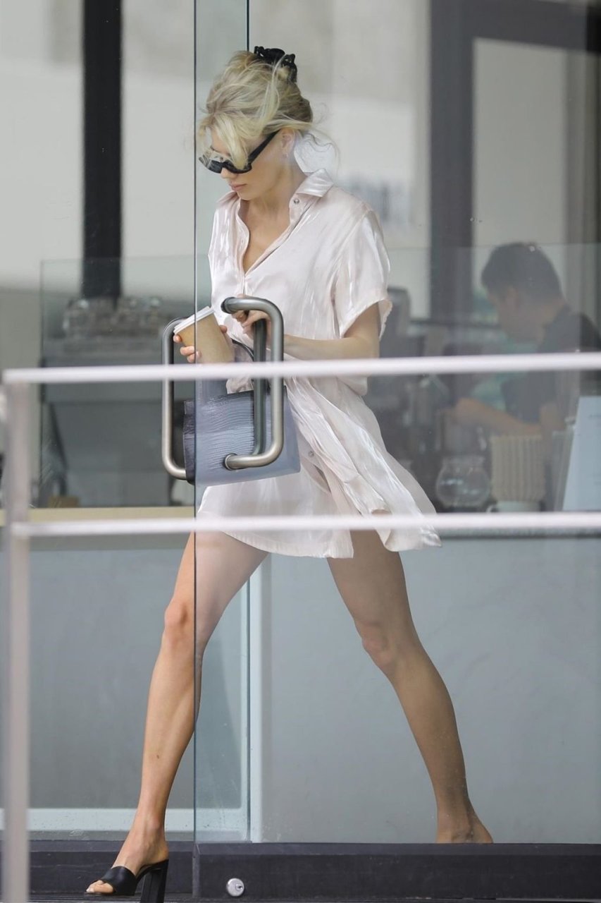 Infelizmente para Charlotte, os ventos estão fortes causando um mau funcionamento em seu mini robe de seda, revelando a roupa íntima da modelo de 25 anos. Charlotte é rápida em perceber o deslize e se cobre enquanto desce as escadas e vai para seu transporte.