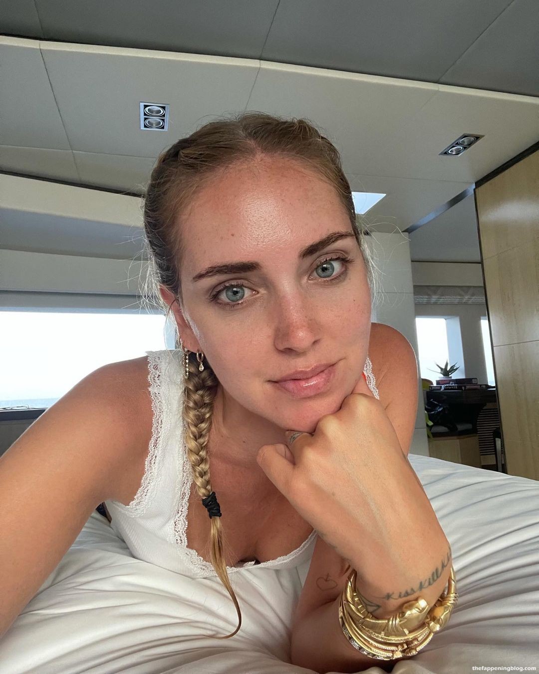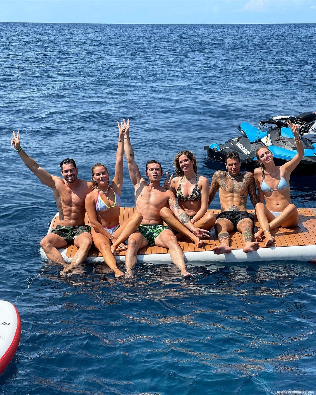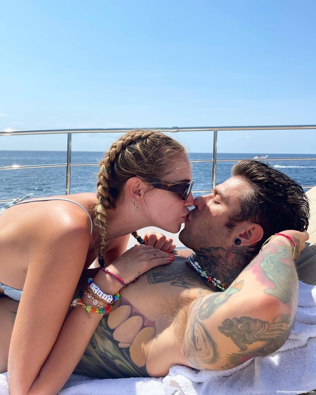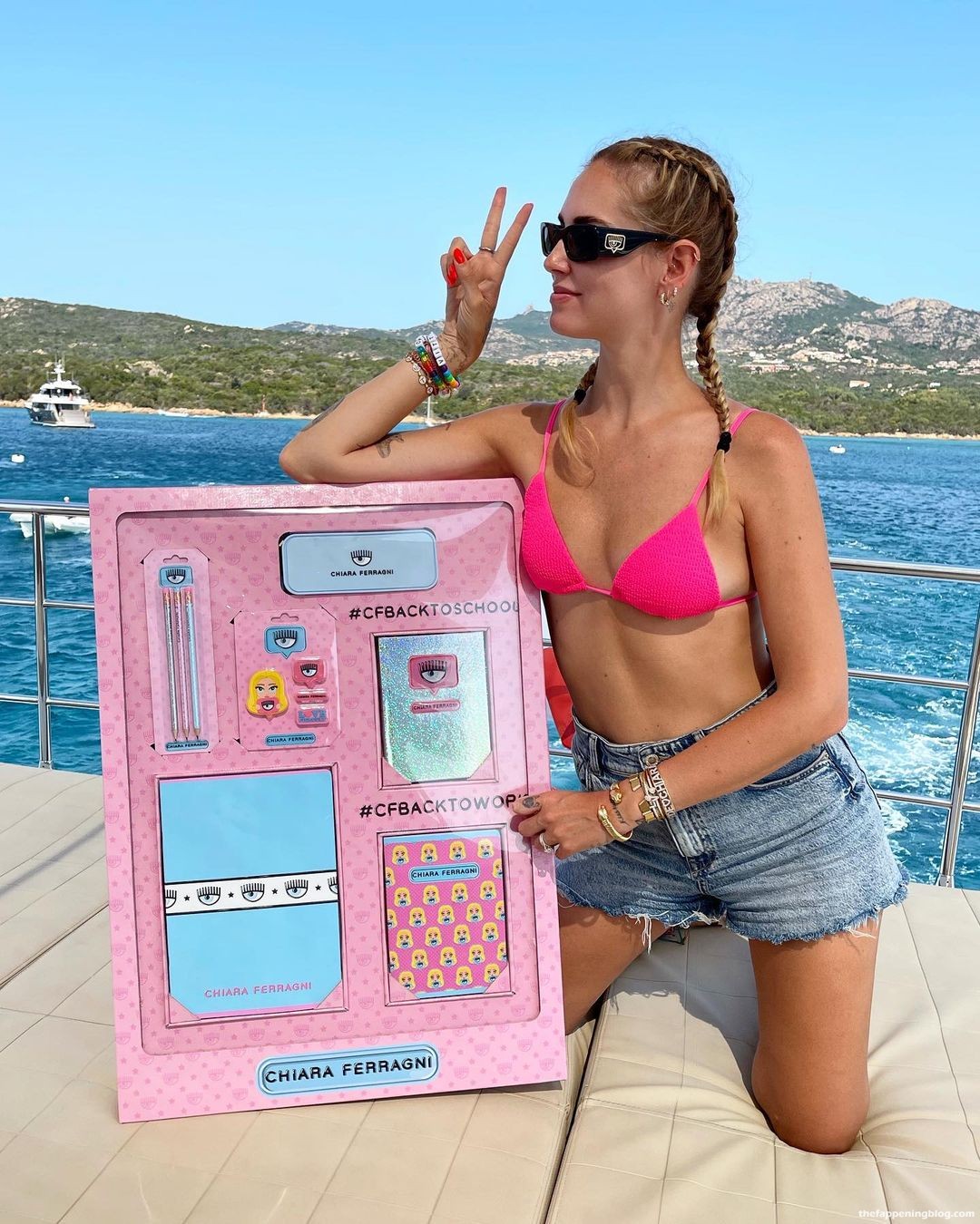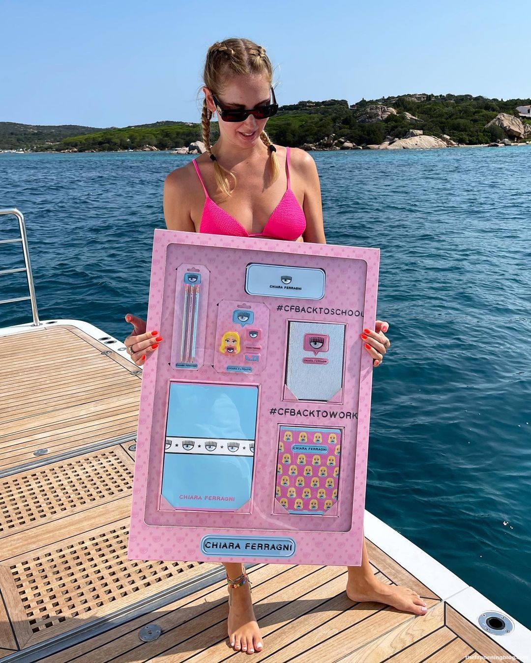 A modelo Chiara Ferragni passa seus dias de barco com amigos – Instagram (agosto de 2021). Ela mostra seus seios, pernas esbeltas e corpo sexy, usando biquínis azul e rosa.