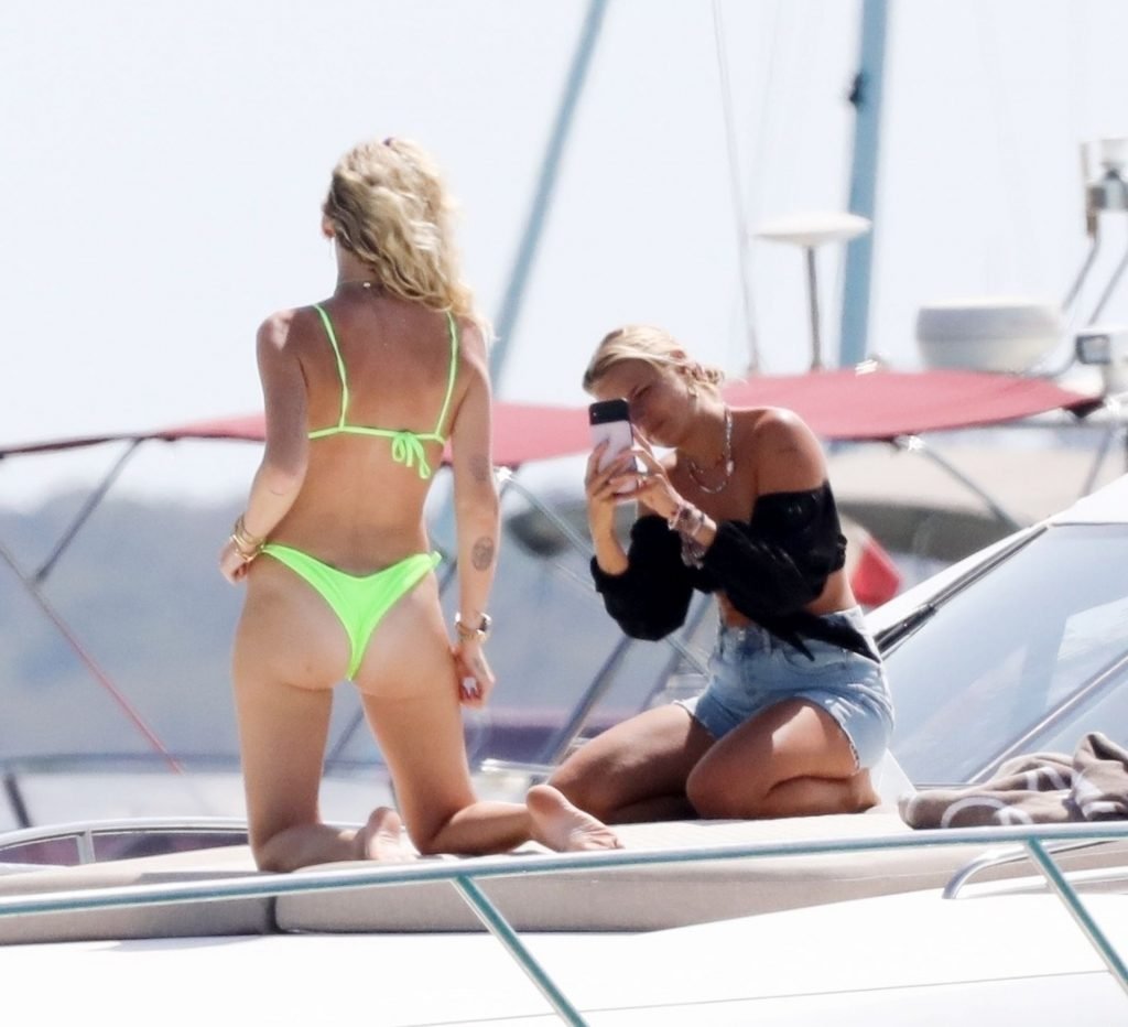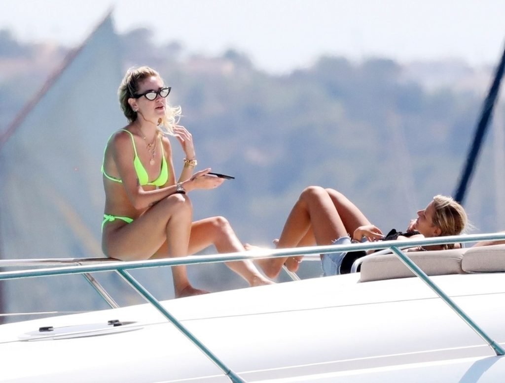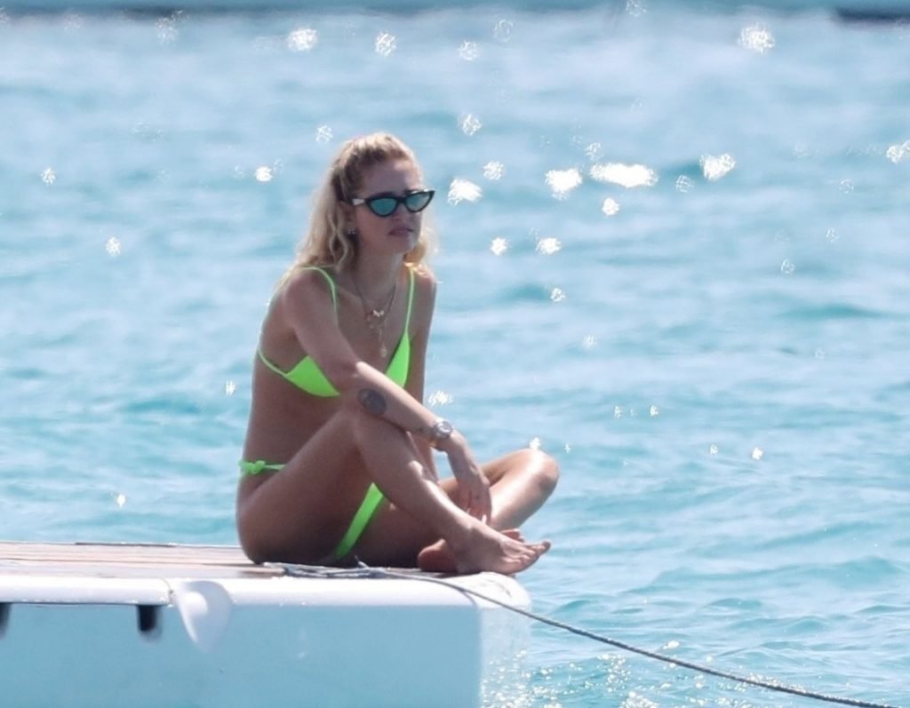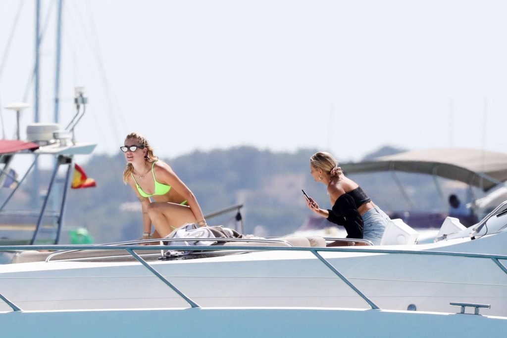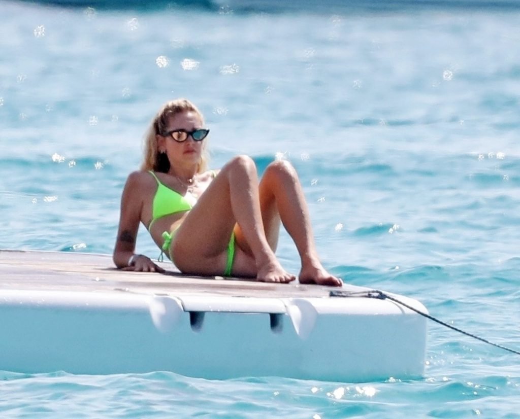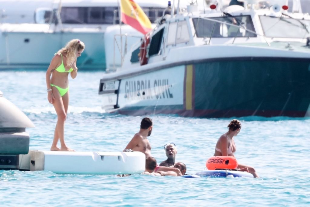 Chiara Ferragni foi fotografada com seu marido Fedez aproveitando as férias em Formentera, 04/08/2019. Chiara Ferragni foi vista usando um biquíni neon brilhante de duas peças e Fedez com shorts estampados, camiseta branca e tênis.