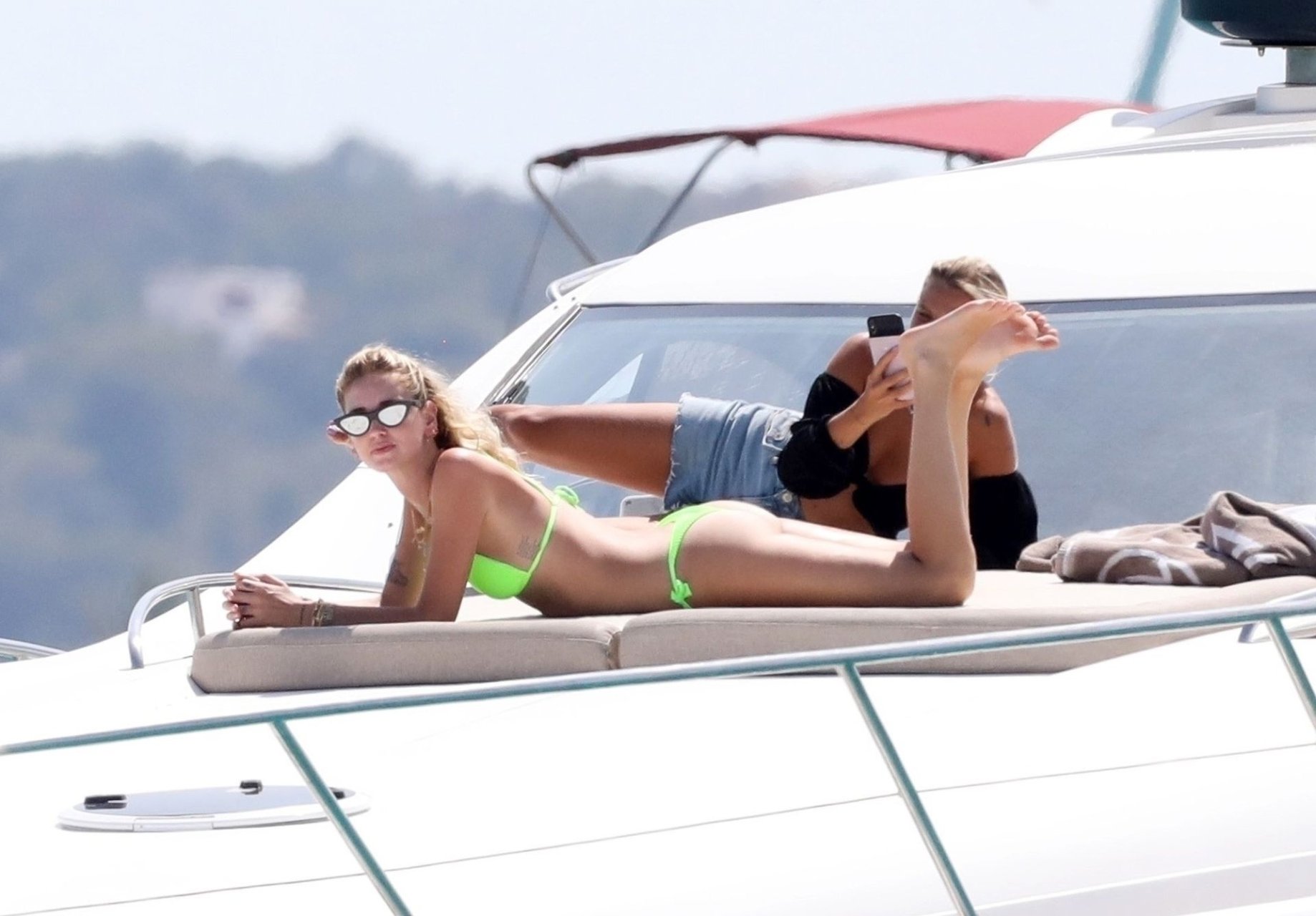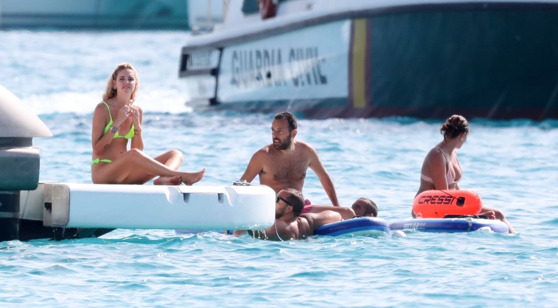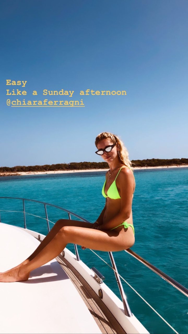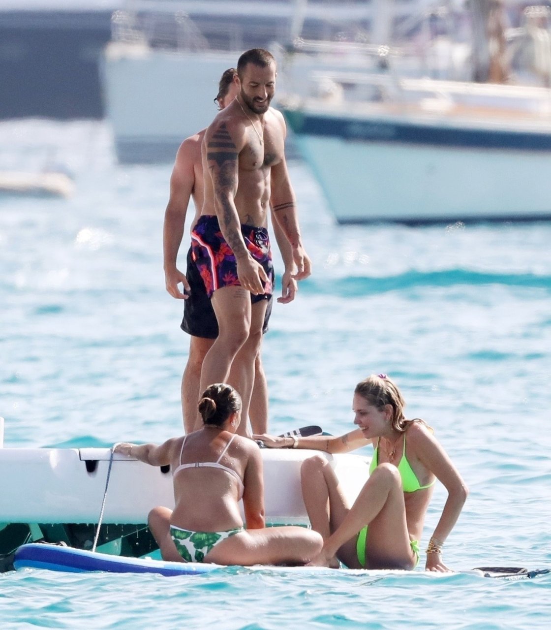 Chiara Ferragni foi fotografada com seu marido Fedez aproveitando as férias em Formentera, 04/08/2019. Chiara Ferragni foi vista usando um biquíni neon brilhante de duas peças e Fedez com shorts estampados, camiseta branca e tênis.