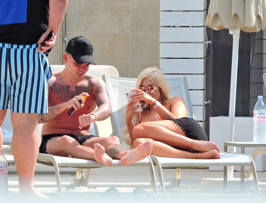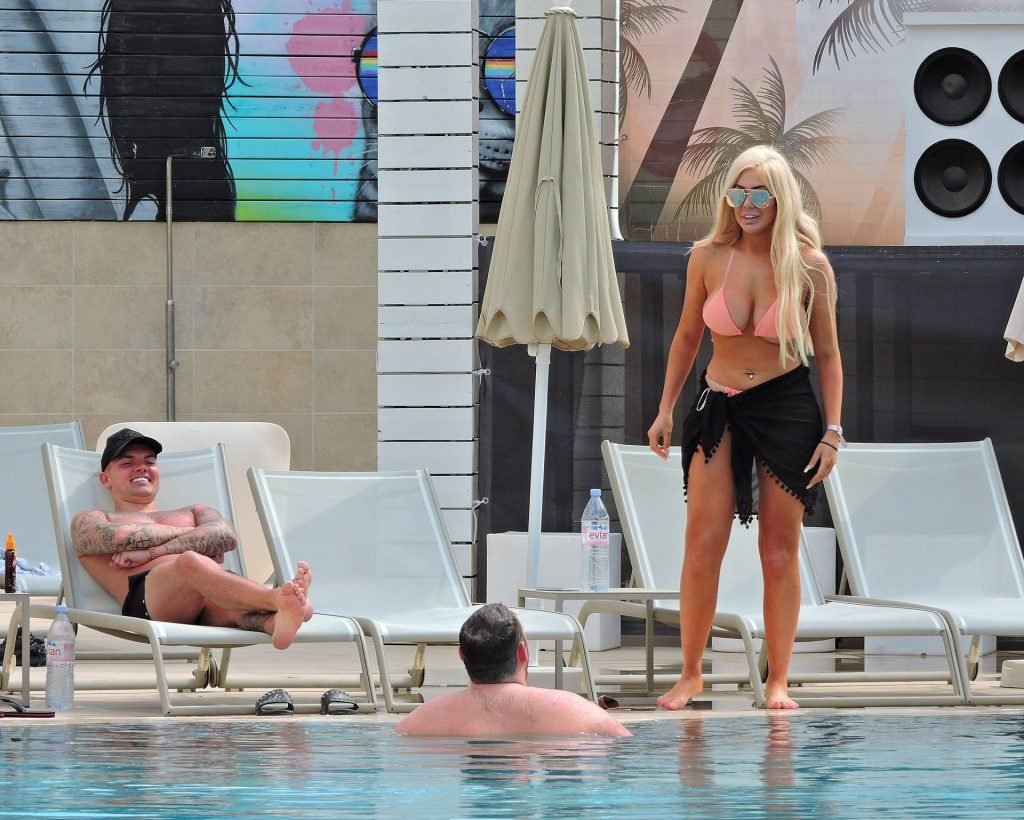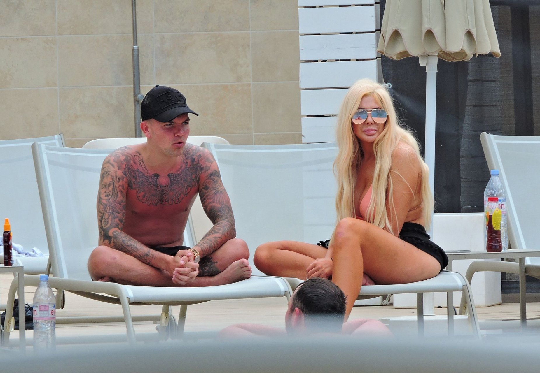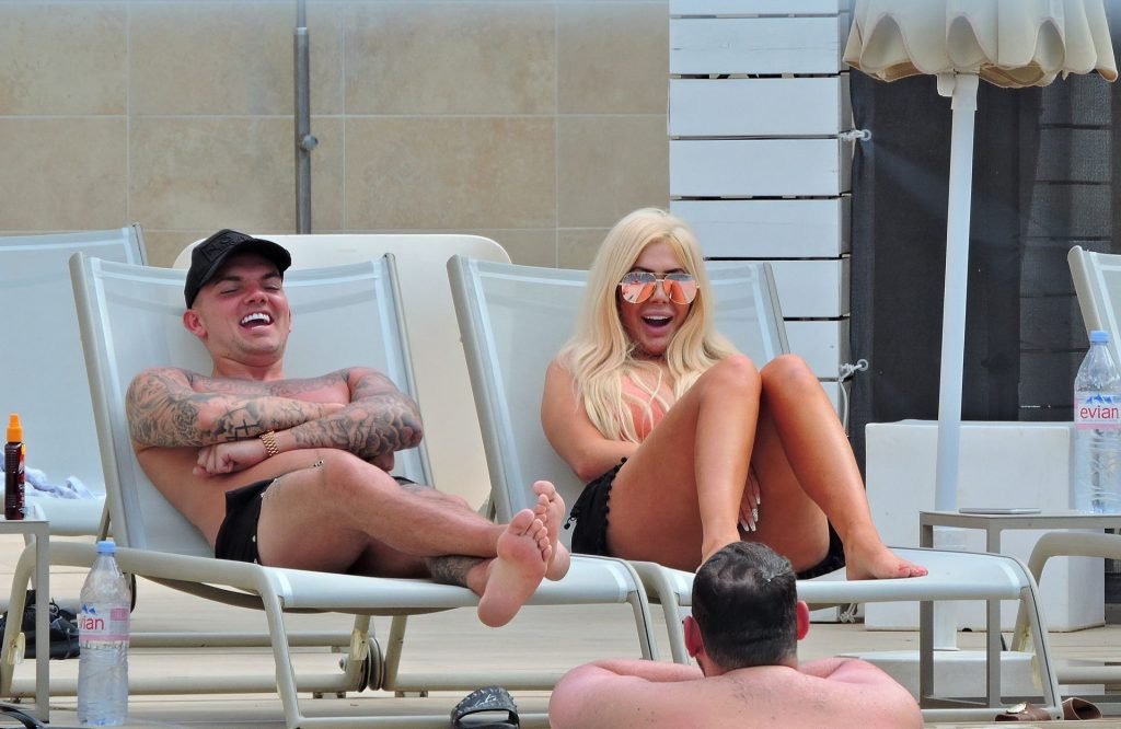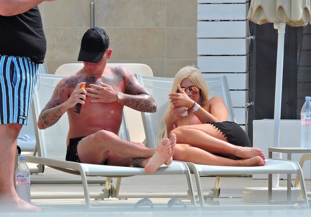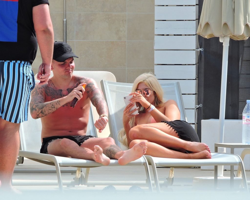 A estrela inglesa de reality show Chloe Ferry e o namorado intermitente Sam Gowland são vistos relaxando à beira da piscina durante as férias juntos em Magaluf, Maiorca, 21/05/2019.