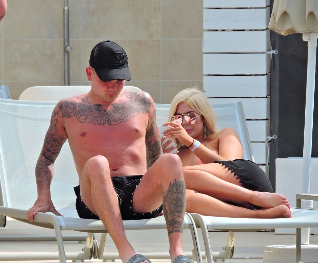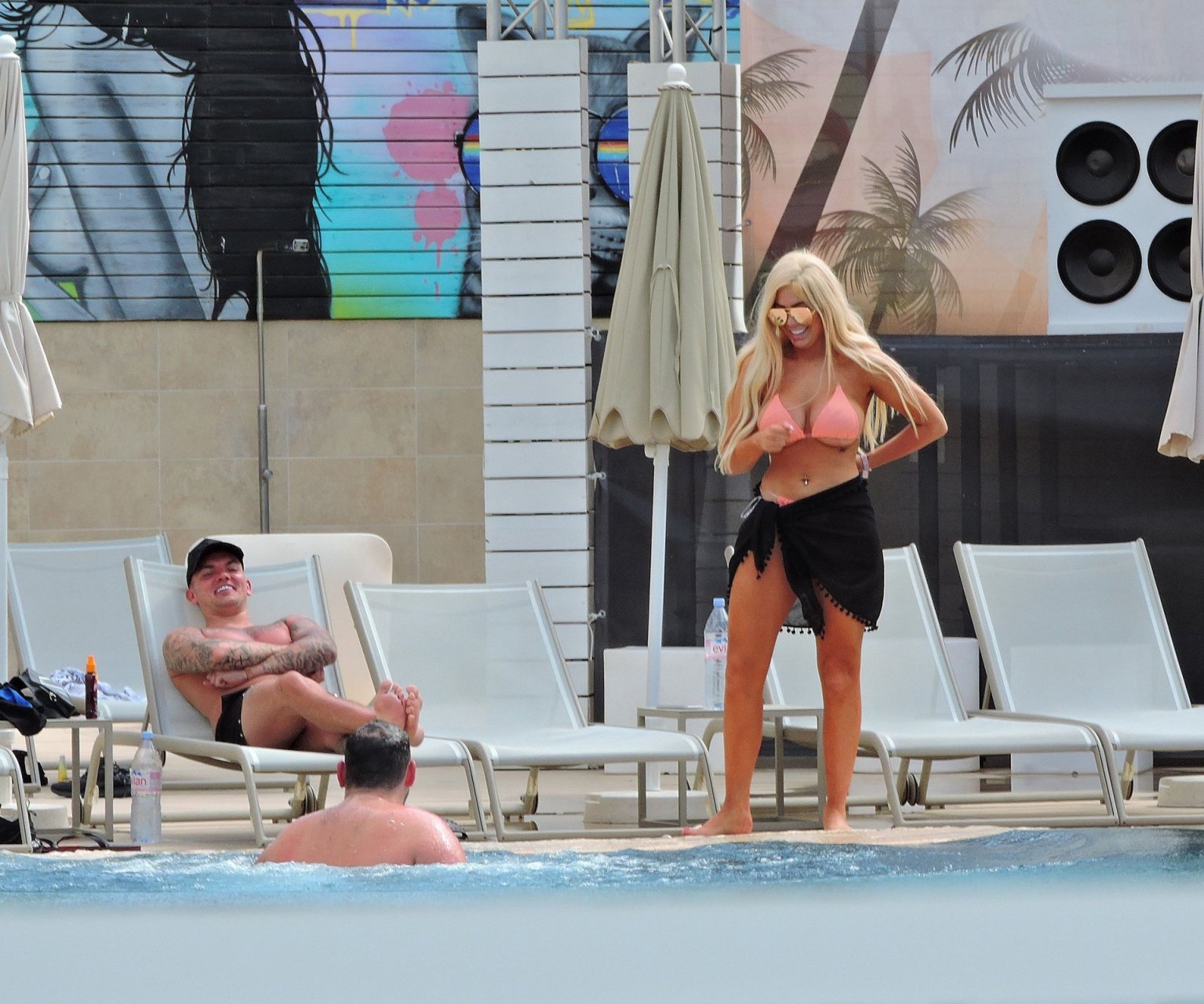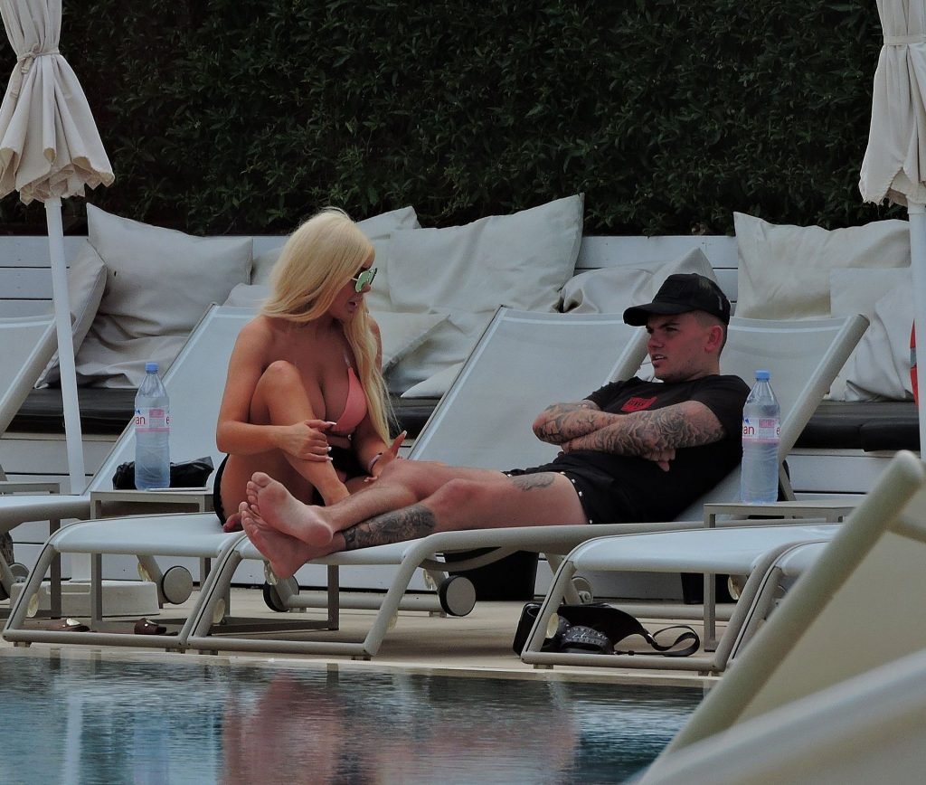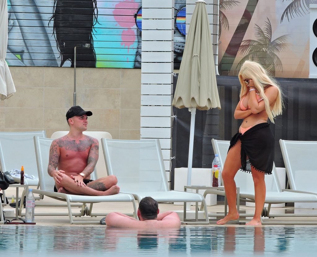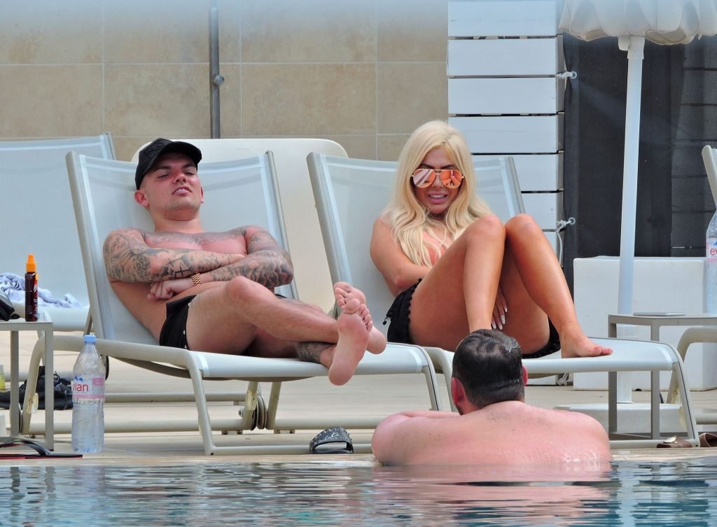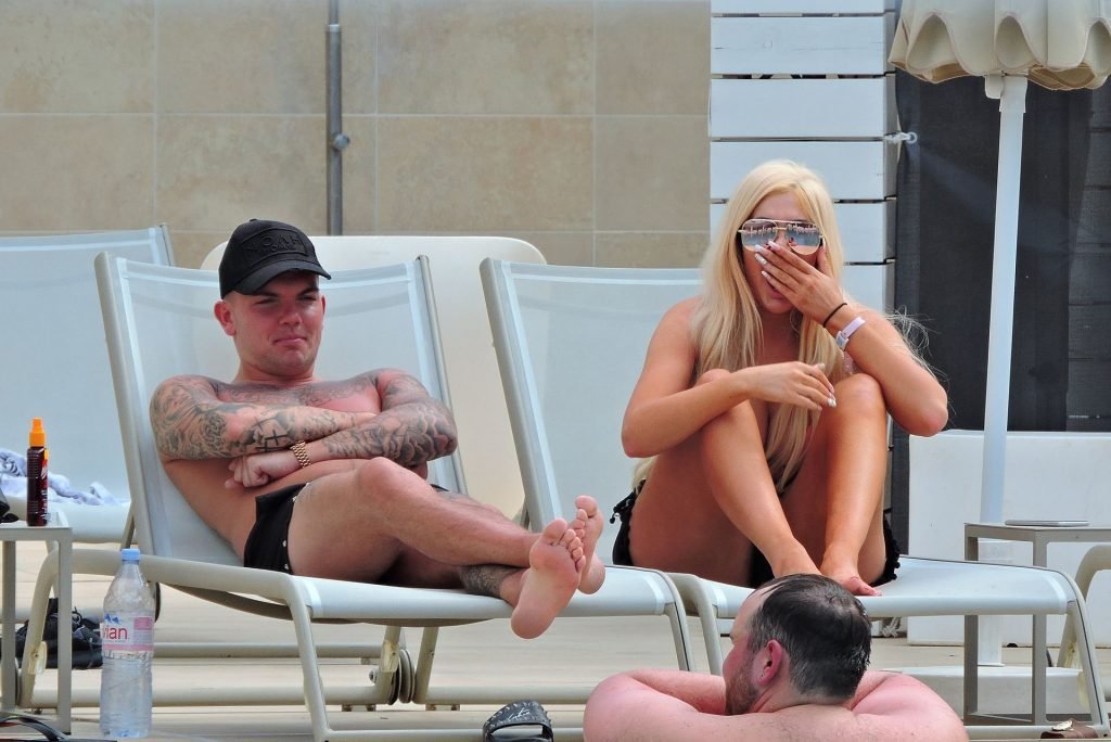 A estrela inglesa de reality show Chloe Ferry e o namorado intermitente Sam Gowland são vistos relaxando à beira da piscina durante as férias juntos em Magaluf, Maiorca, 21/05/2019.