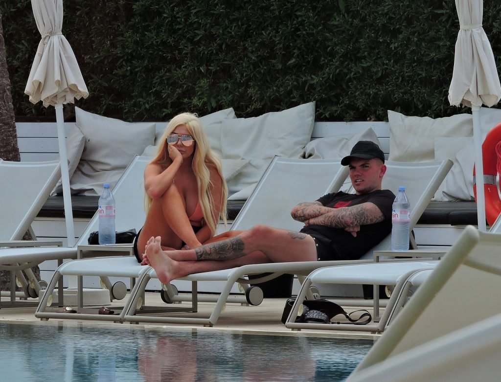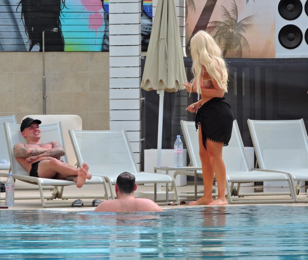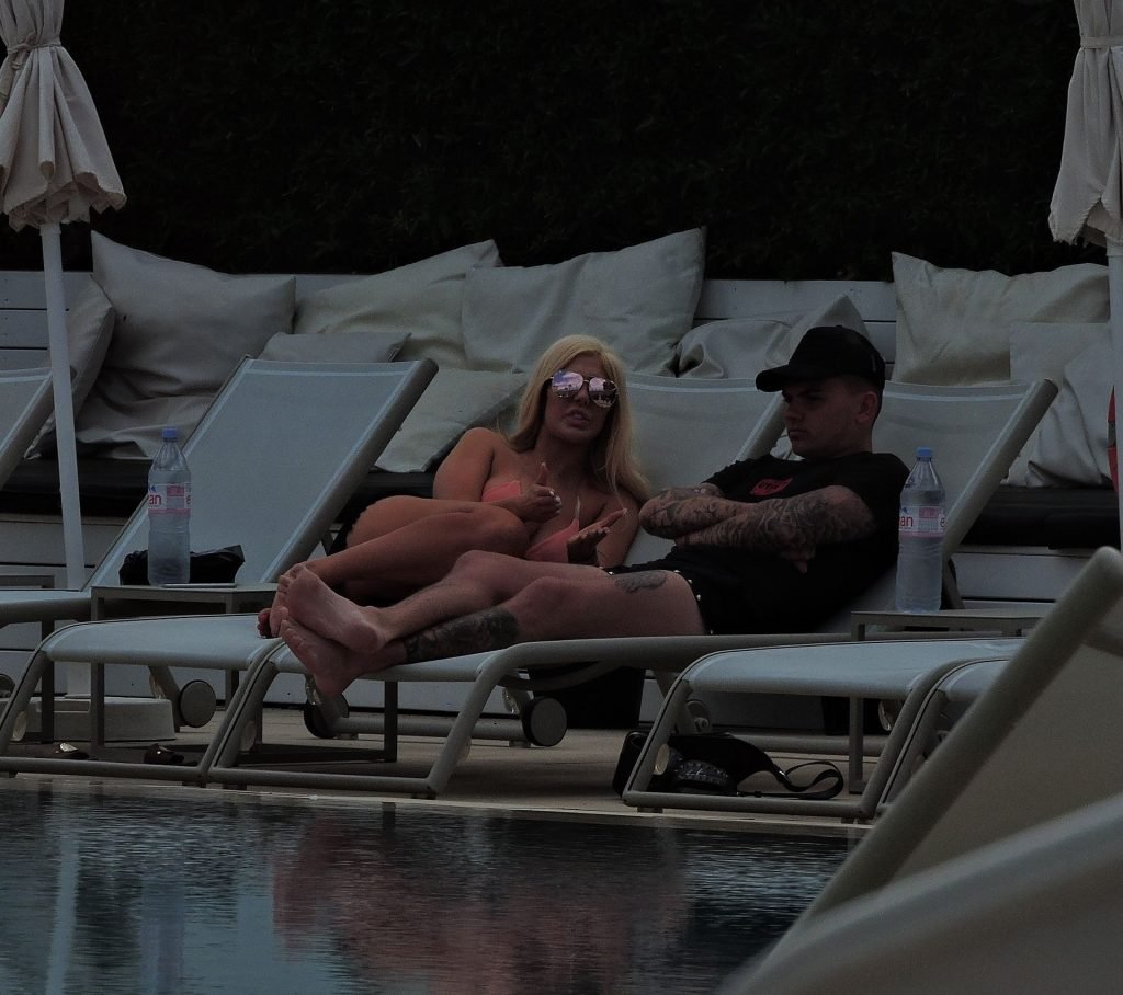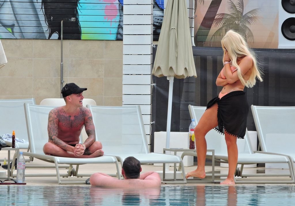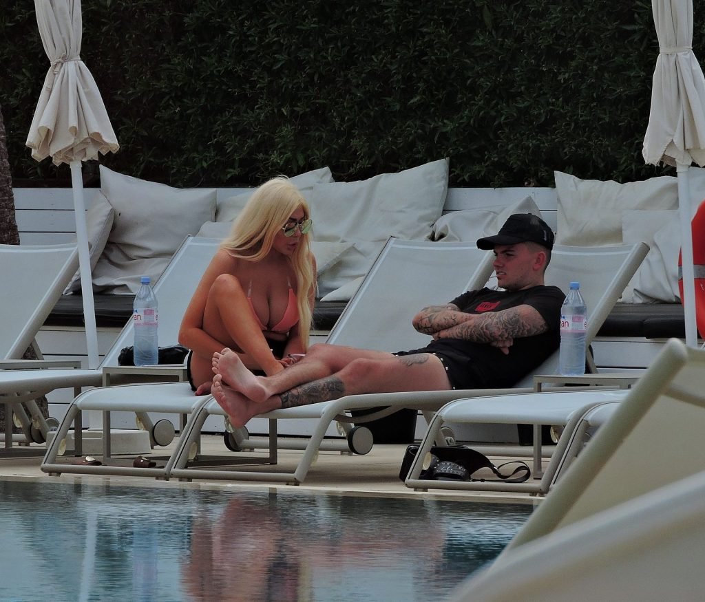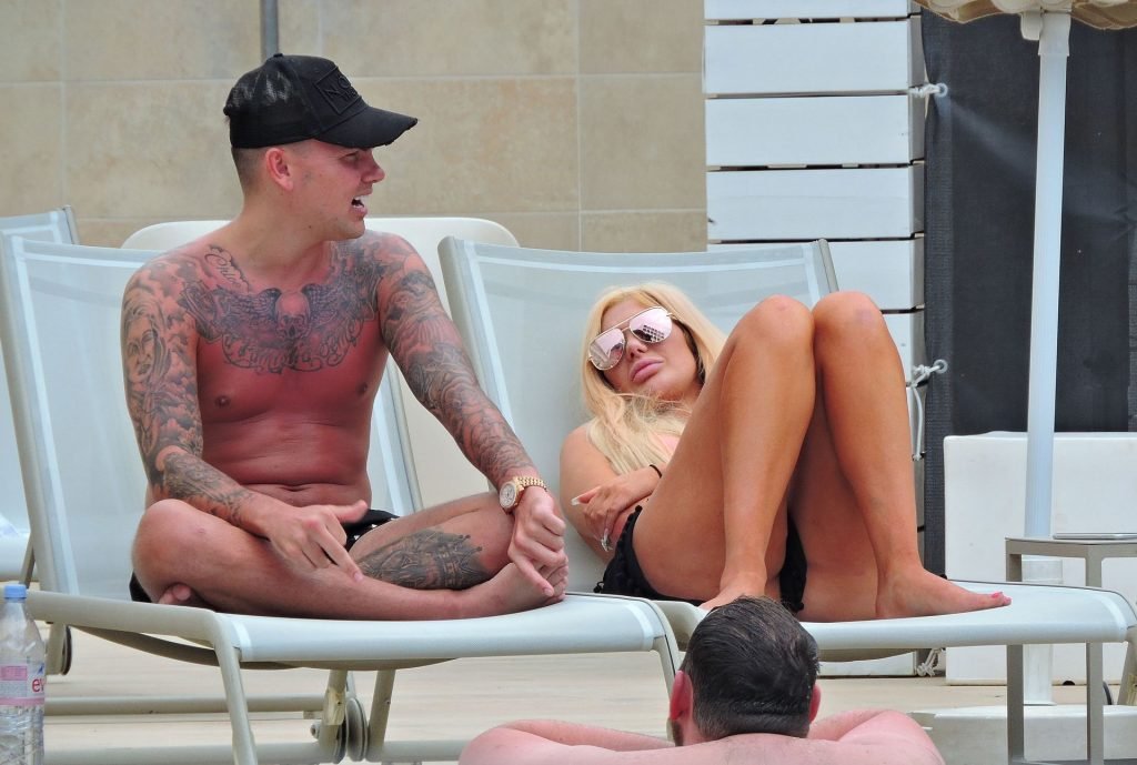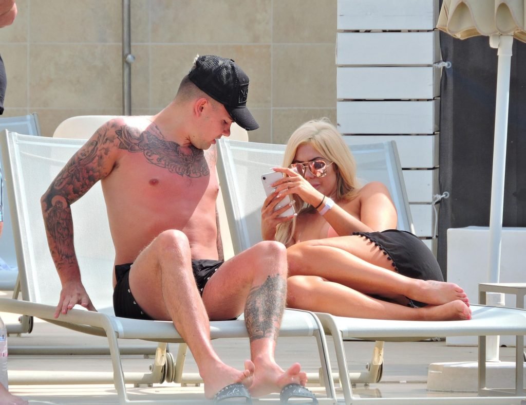 A estrela inglesa de reality show Chloe Ferry e o namorado intermitente Sam Gowland são vistos relaxando à beira da piscina durante as férias juntos em Magaluf, Maiorca, 21/05/2019.