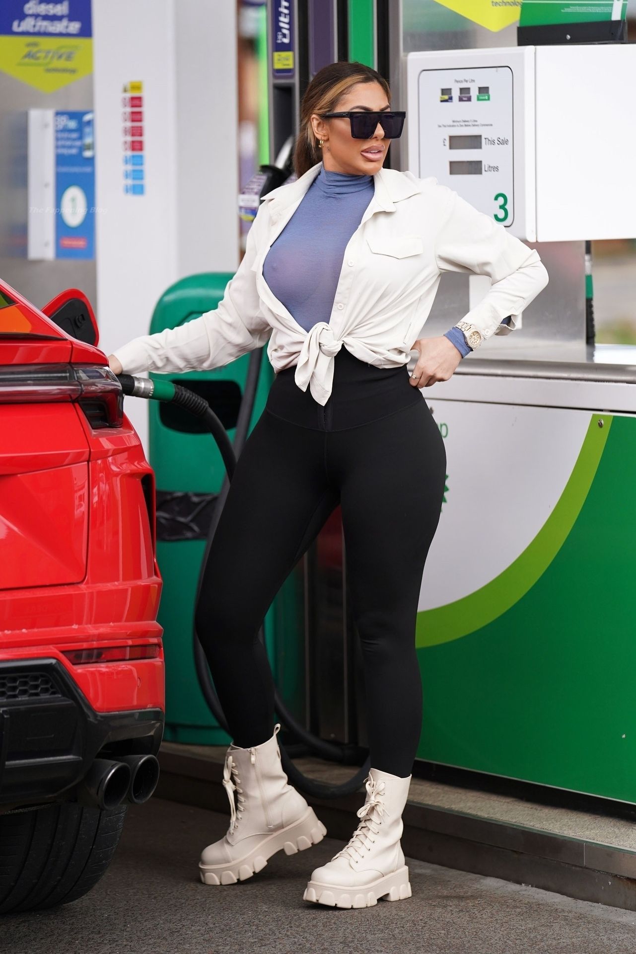 Chloe Ferry é fotografada em um veículo Lamborghini Urus 4×4 de £180.000 enquanto parava para abastecer e calibrar o pneu em um posto de gasolina local.