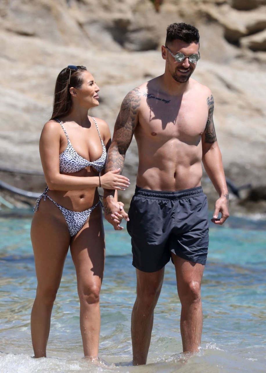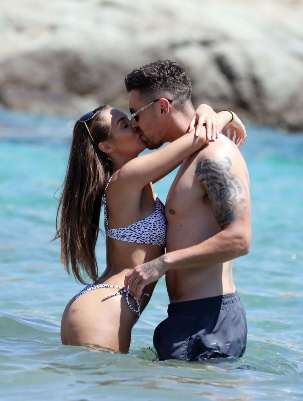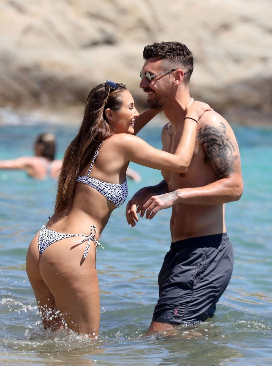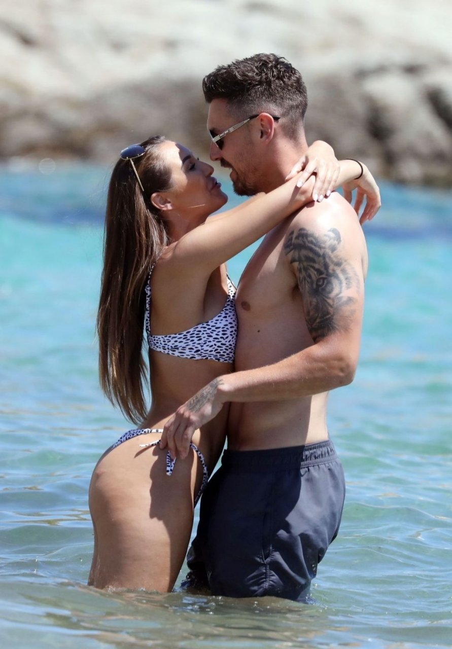 Reality star Chloe Goodman e o jogador de futebol do QPR Grant Hall fotografados em suas férias ao sol em Mykonos, 16/05/2019. O casal parecia estar sentindo o amor enquanto se abraçavam e compartilhavam alguns beijos enquanto brincavam na água.