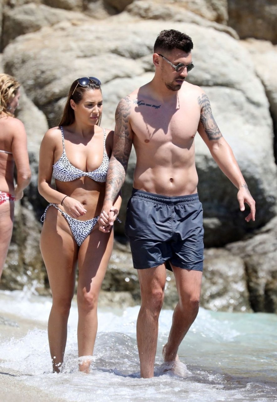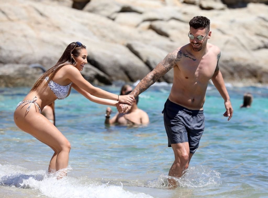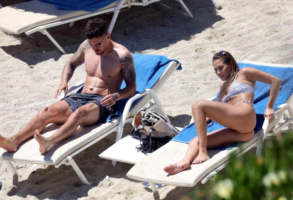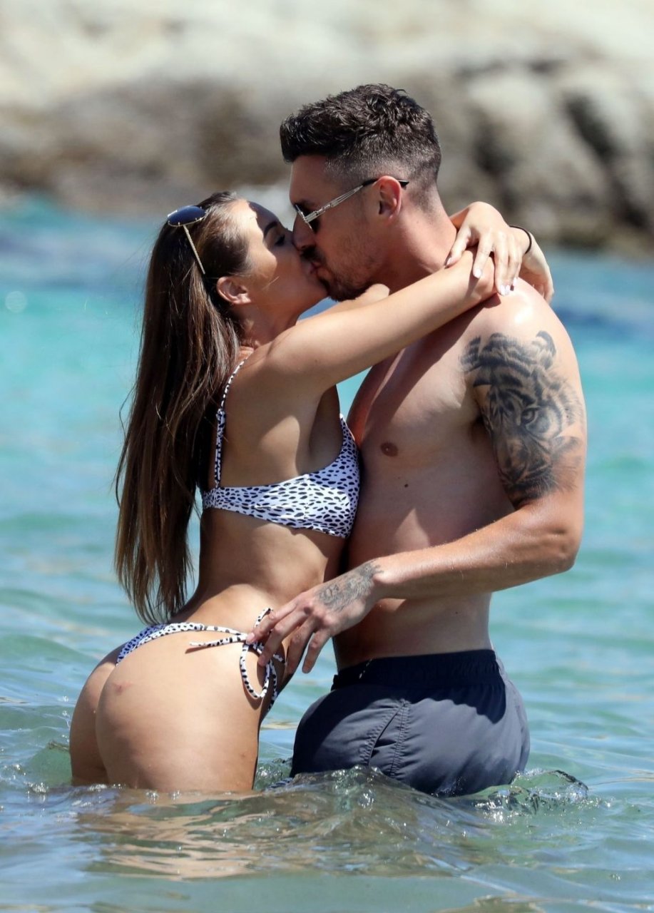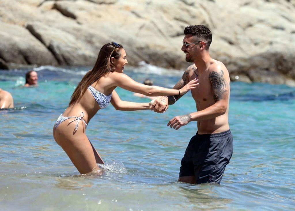 Reality star Chloe Goodman e o jogador de futebol do QPR Grant Hall fotografados em suas férias ao sol em Mykonos, 16/05/2019. O casal parecia estar sentindo o amor enquanto se abraçavam e compartilhavam alguns beijos enquanto brincavam na água.