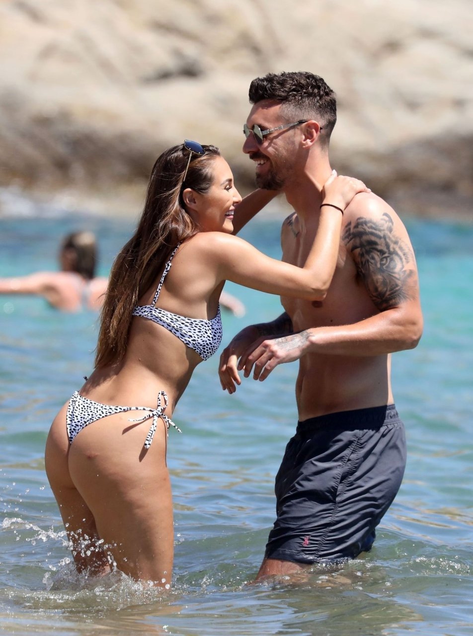 Reality star Chloe Goodman e o jogador de futebol do QPR Grant Hall fotografados em suas férias ao sol em Mykonos, 16/05/2019. O casal parecia estar sentindo o amor enquanto se abraçavam e compartilhavam alguns beijos enquanto brincavam na água.