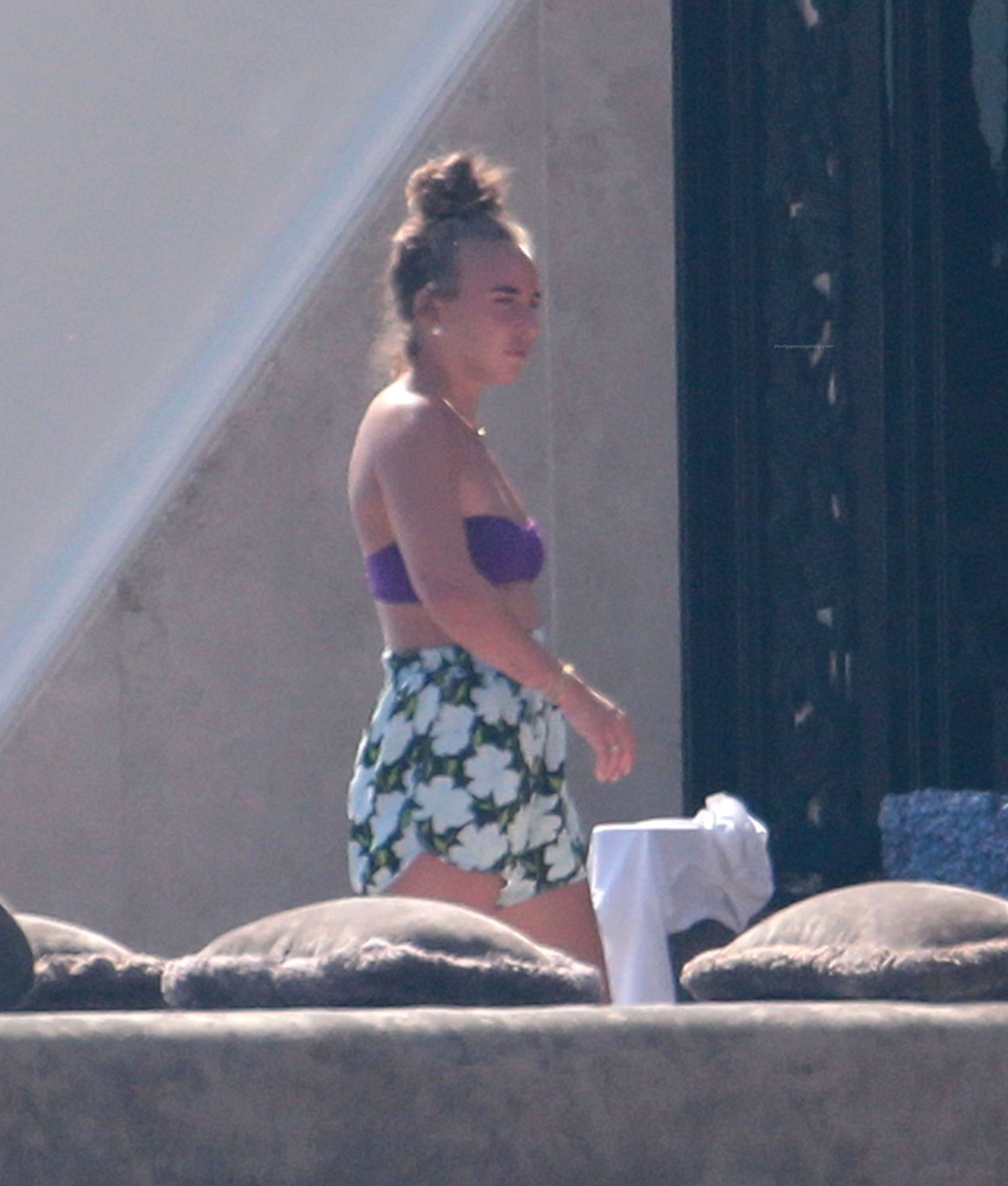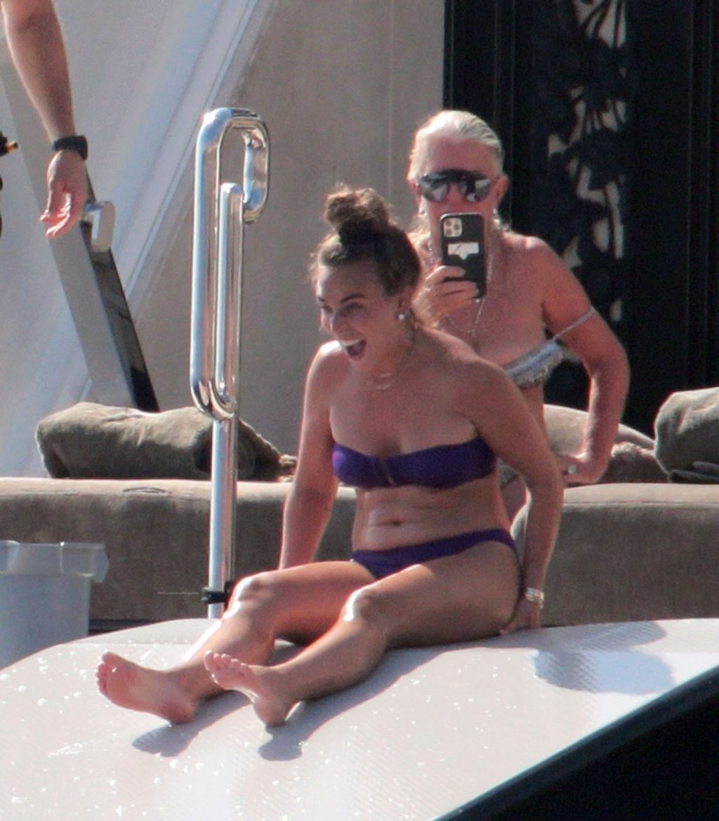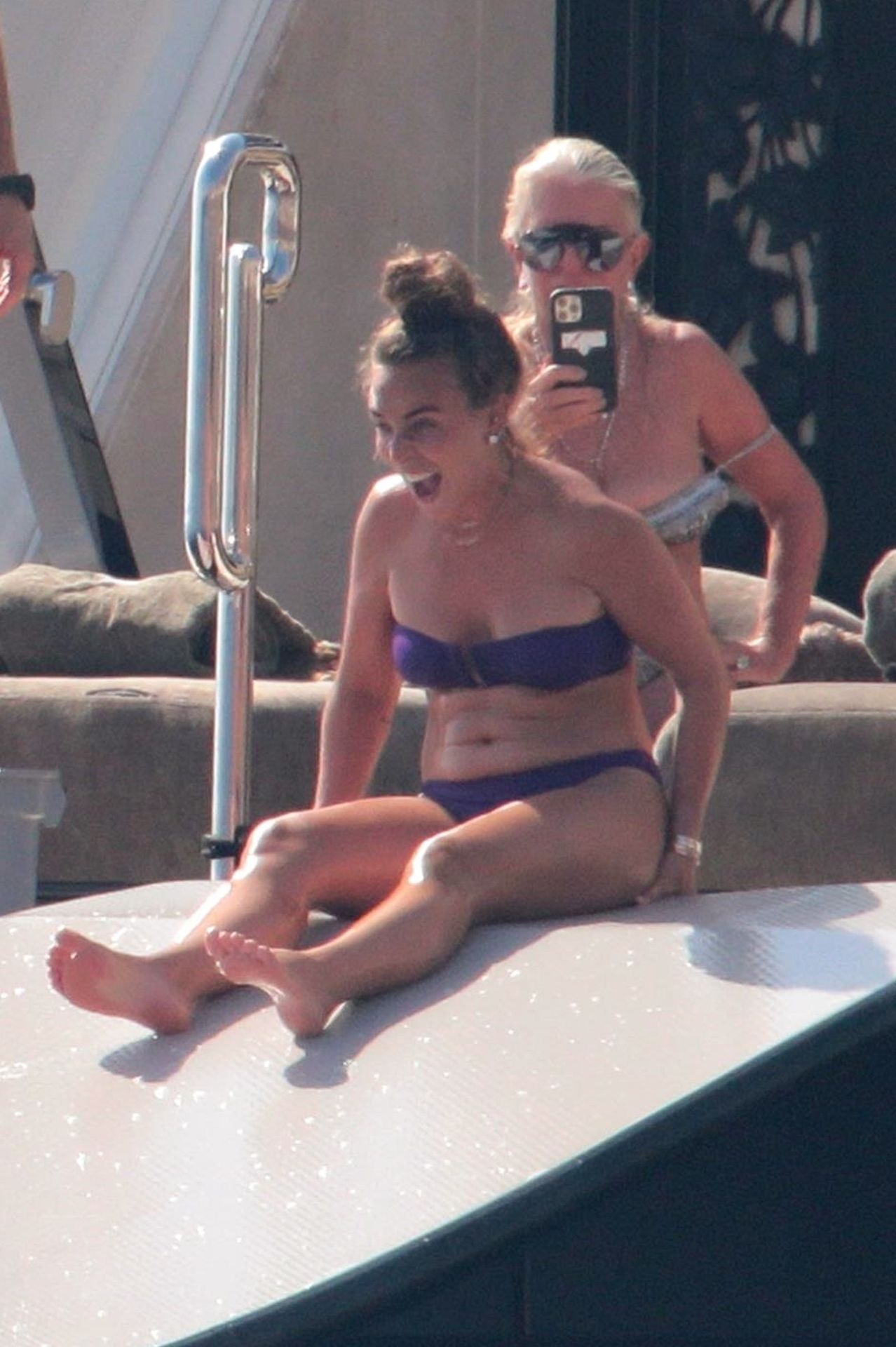 Chloe foi a primeira a experimentar o escorregador vestindo seu biquíni roxo mínimo, com a mãe Tina tirando algumas fotos do evento emocionante em seu telefone.