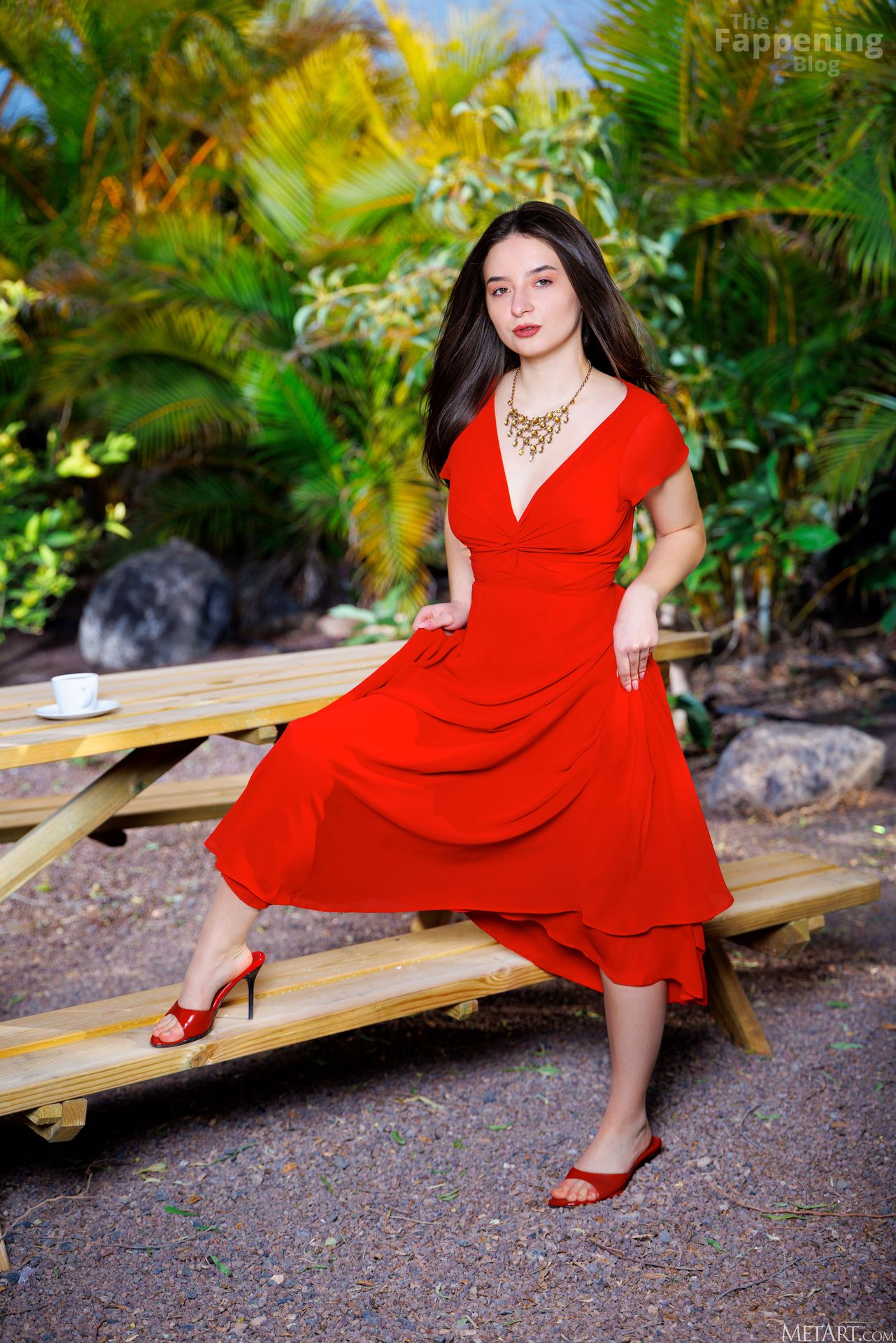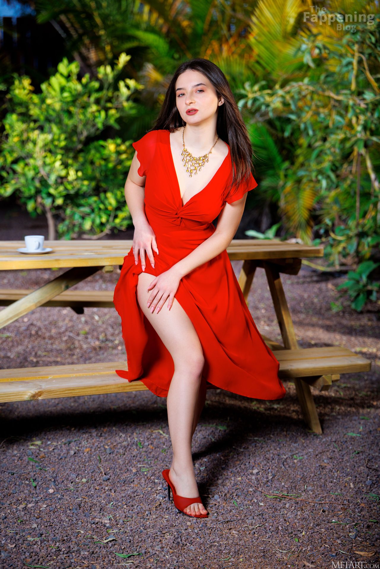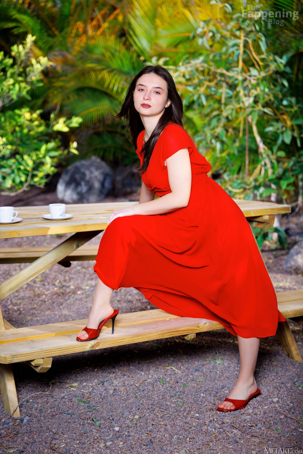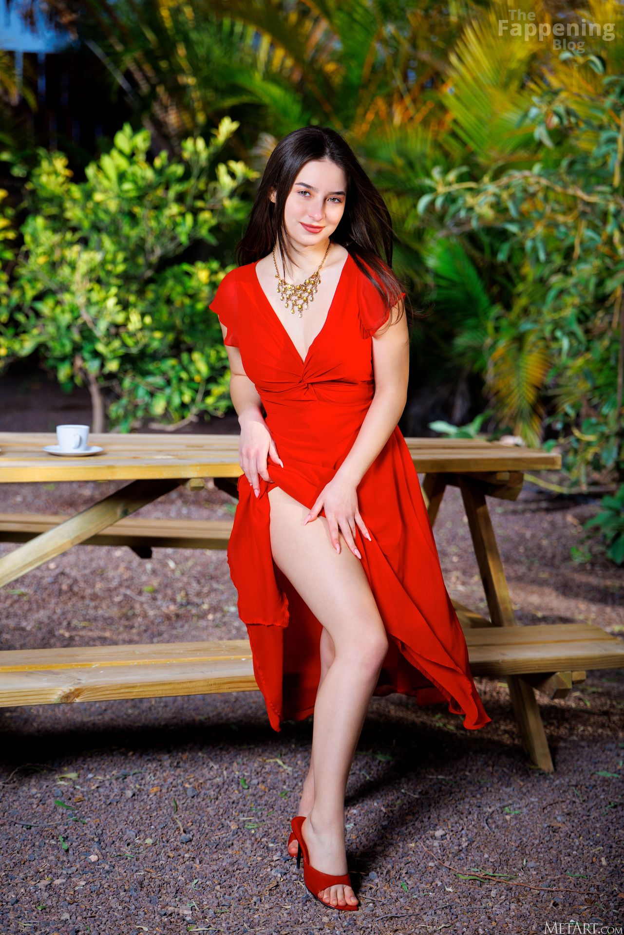 Model Chloe Moss fica selvagem, posando nua em um banco de rua, mostrando suas partes cor-de-rosa. A deslumbrante de 20 anos veste um vestido vermelho, mal cobrindo com apenas uma pequena calcinha por baixo. Ela está toda sorridente, levantando o vestido para mostrar a parte de baixo.