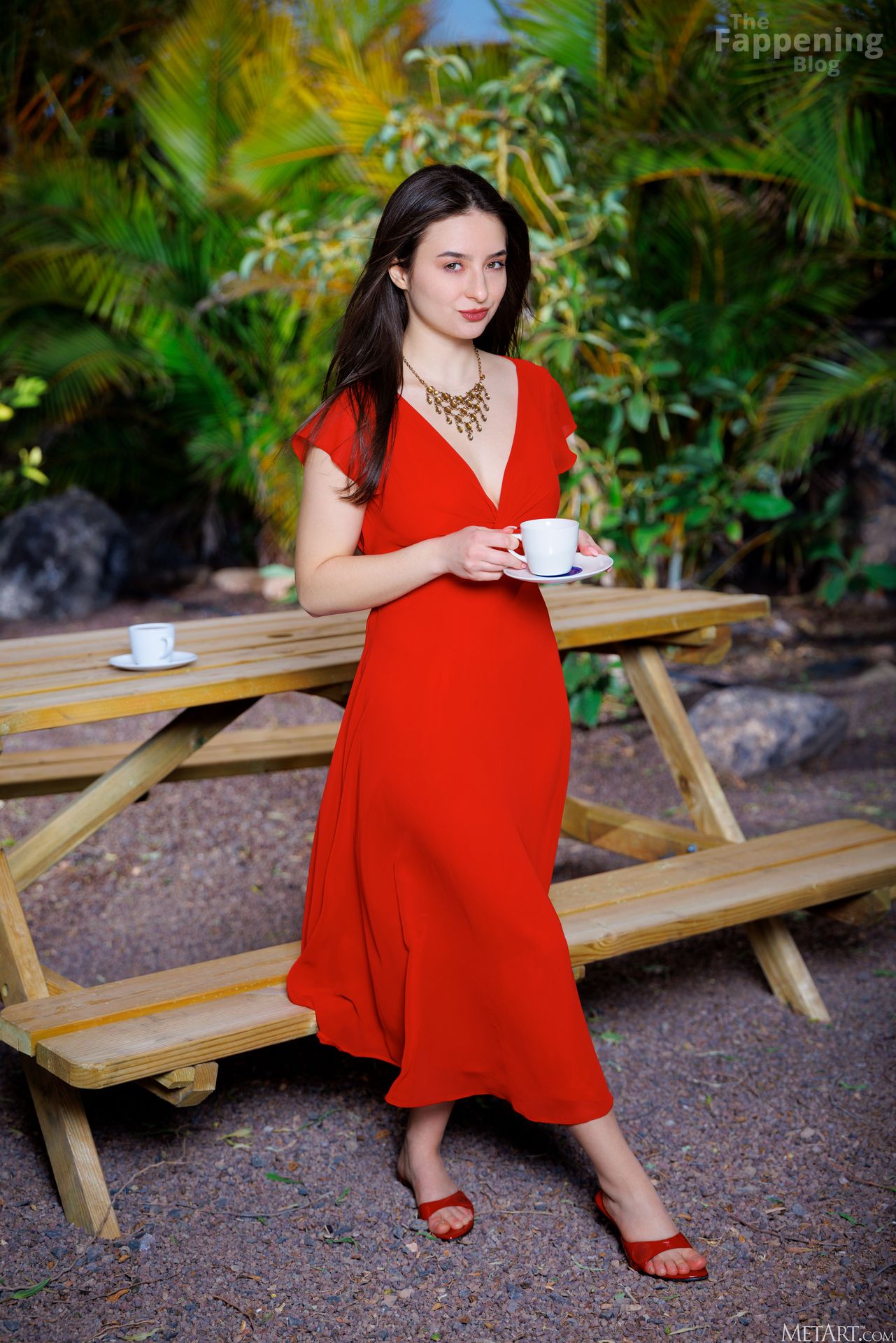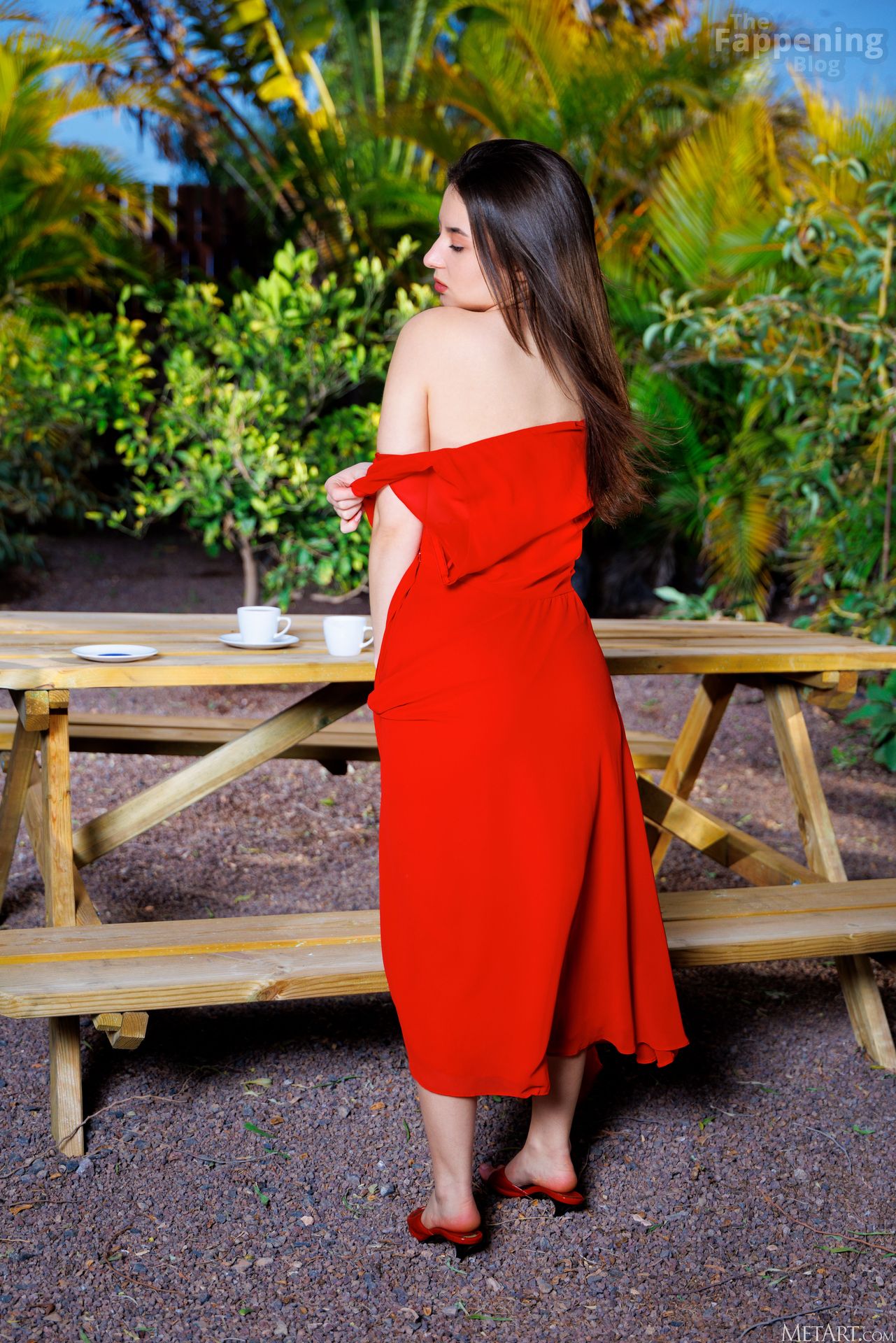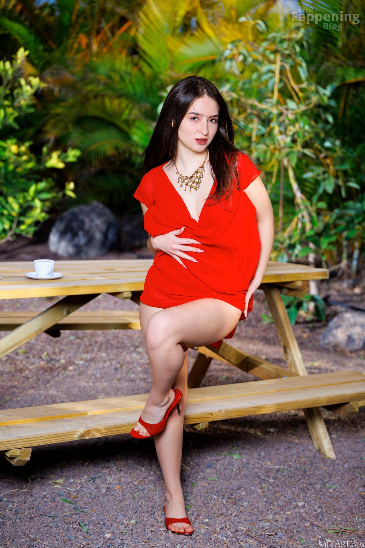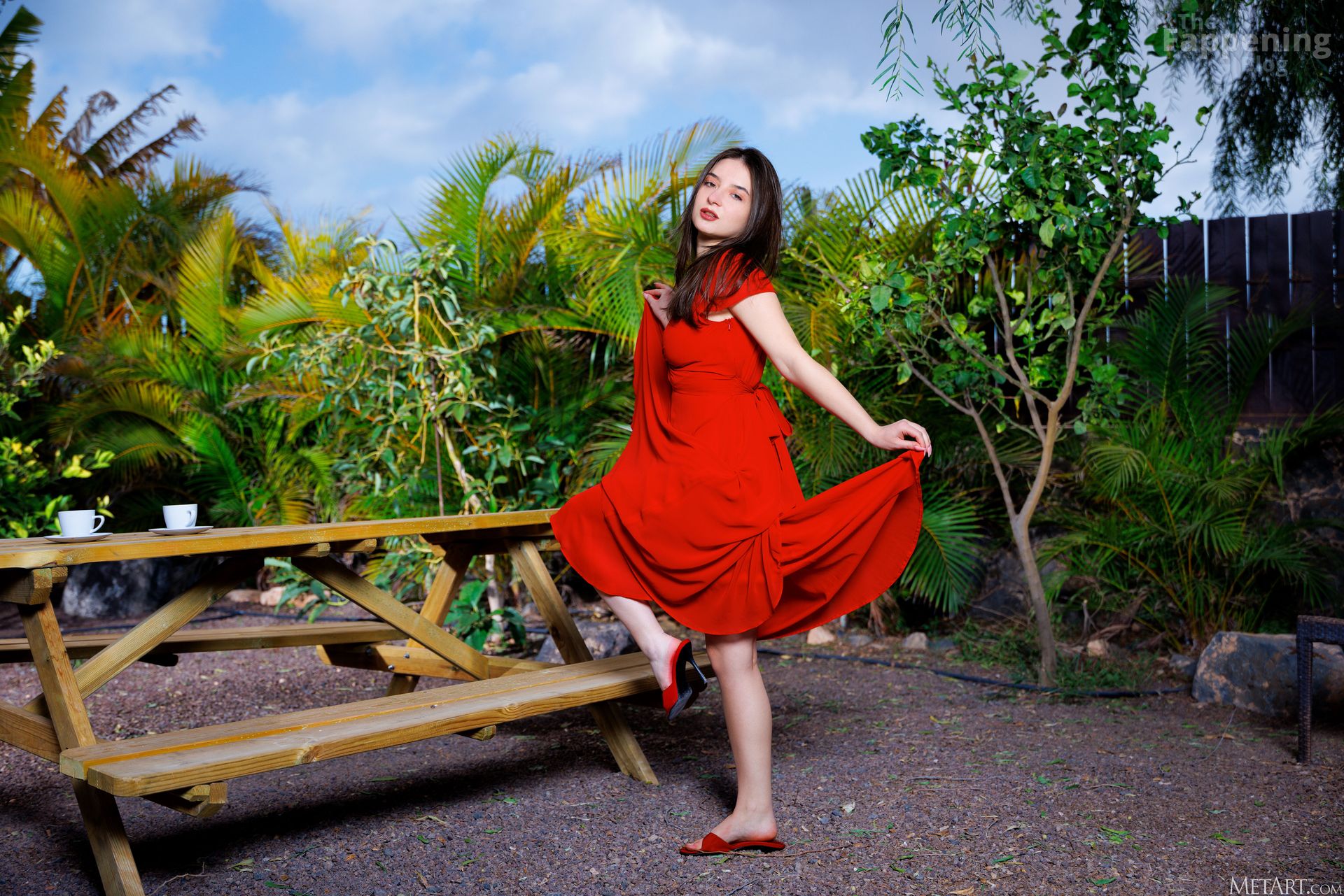 Model Chloe Moss fica selvagem, posando nua em um banco de rua, mostrando suas partes cor-de-rosa. A deslumbrante de 20 anos veste um vestido vermelho, mal cobrindo com apenas uma pequena calcinha por baixo. Ela está toda sorridente, levantando o vestido para mostrar a parte de baixo.