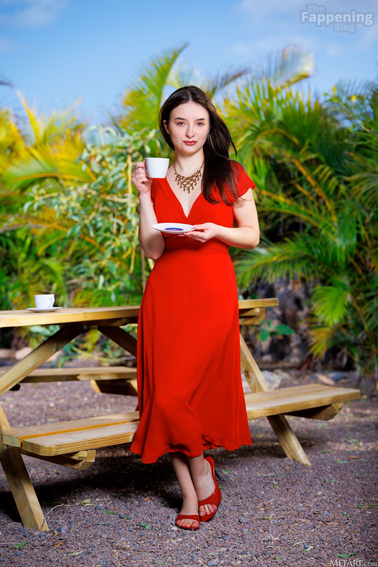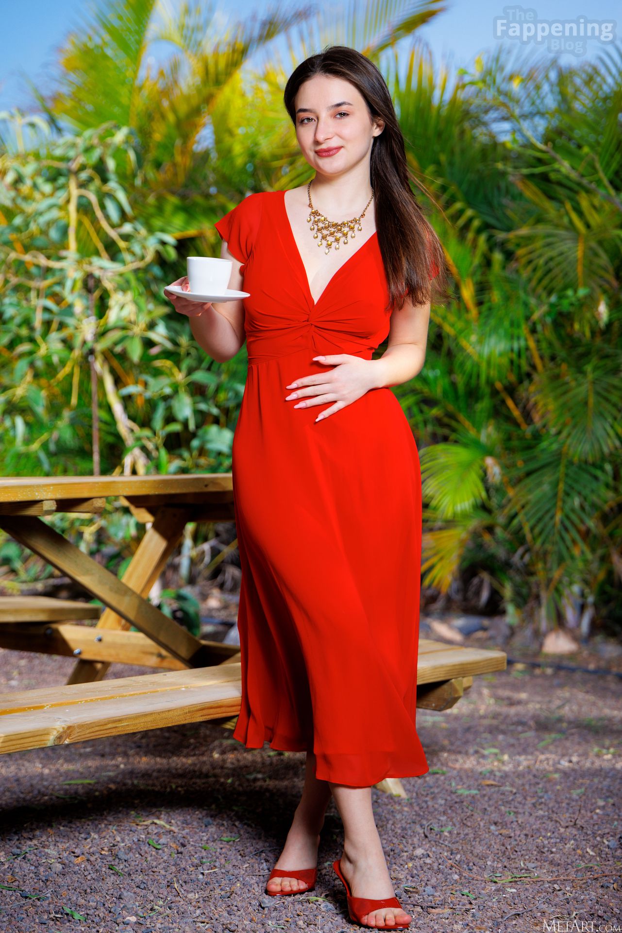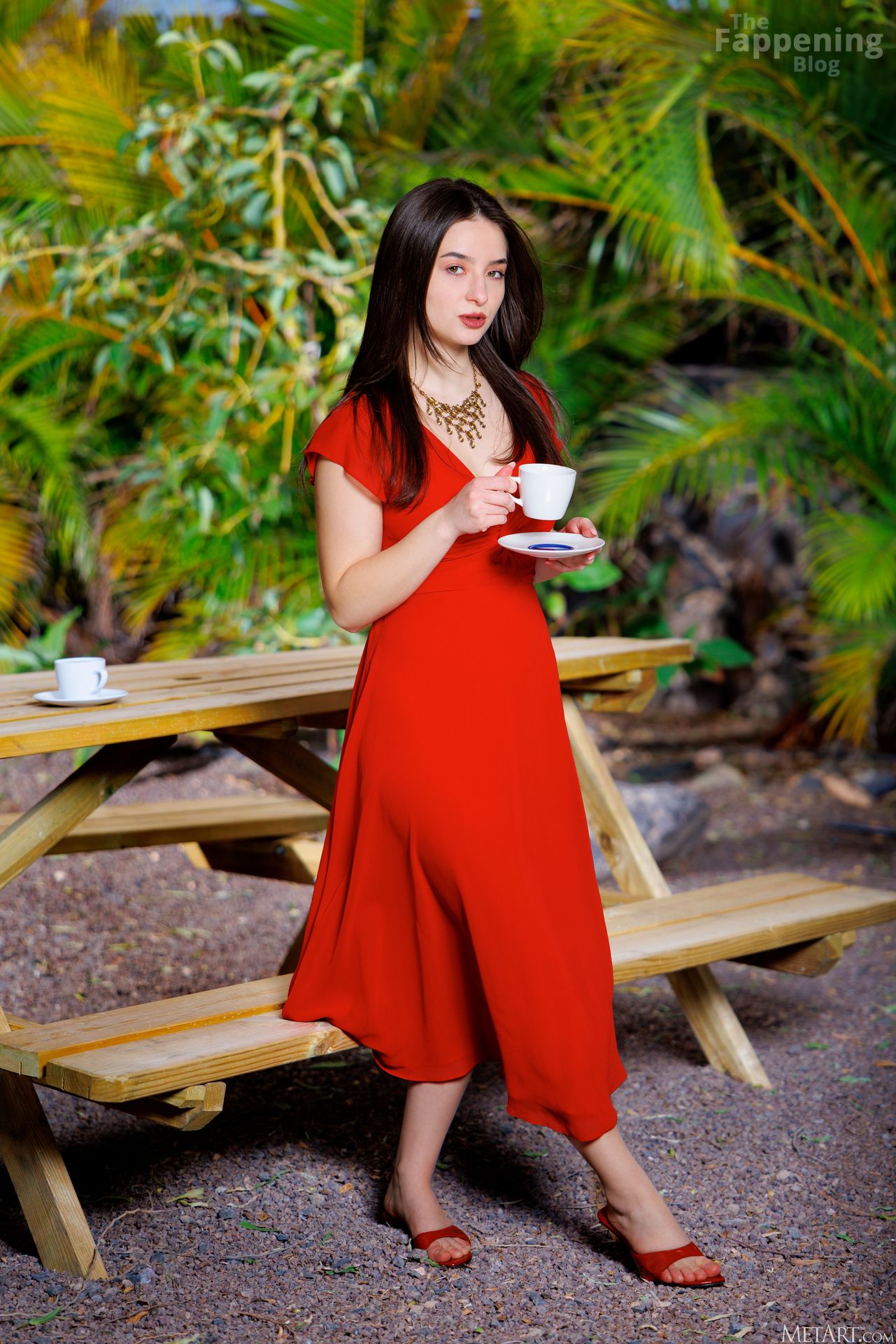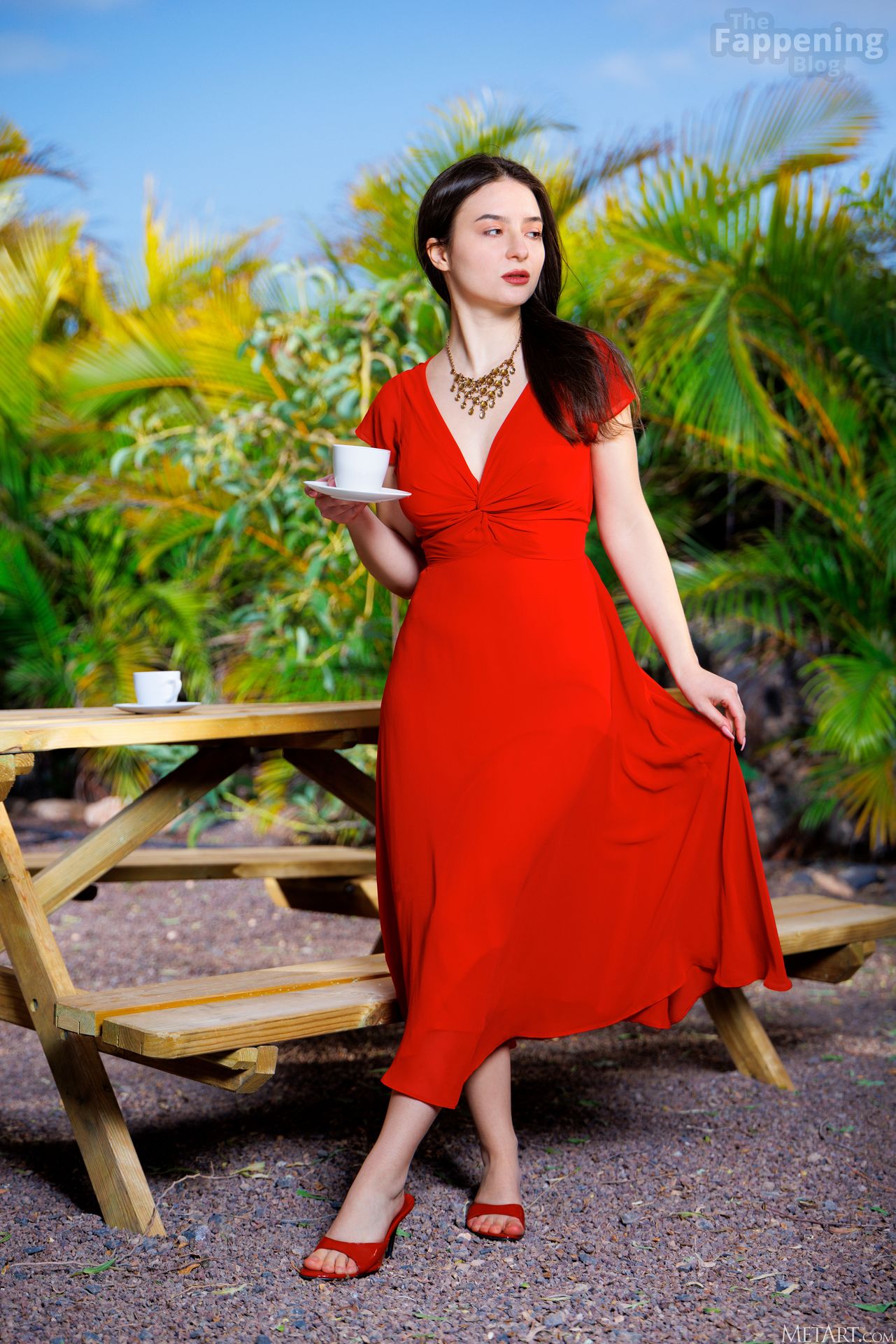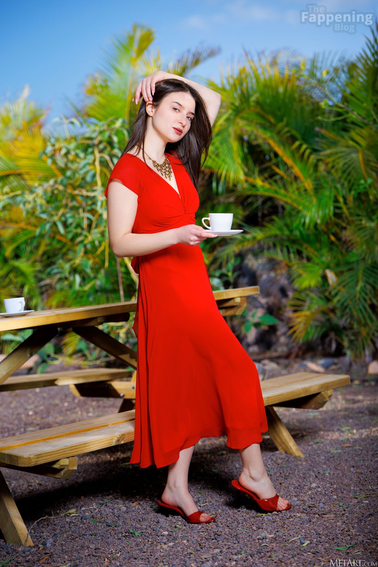 Model Chloe Moss fica selvagem, posando nua em um banco de rua, mostrando suas partes cor-de-rosa. A deslumbrante de 20 anos veste um vestido vermelho, mal cobrindo com apenas uma pequena calcinha por baixo. Ela está toda sorridente, levantando o vestido para mostrar a parte de baixo.