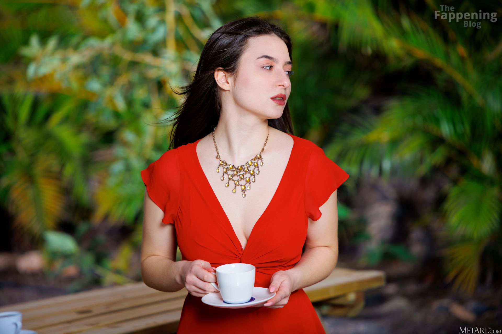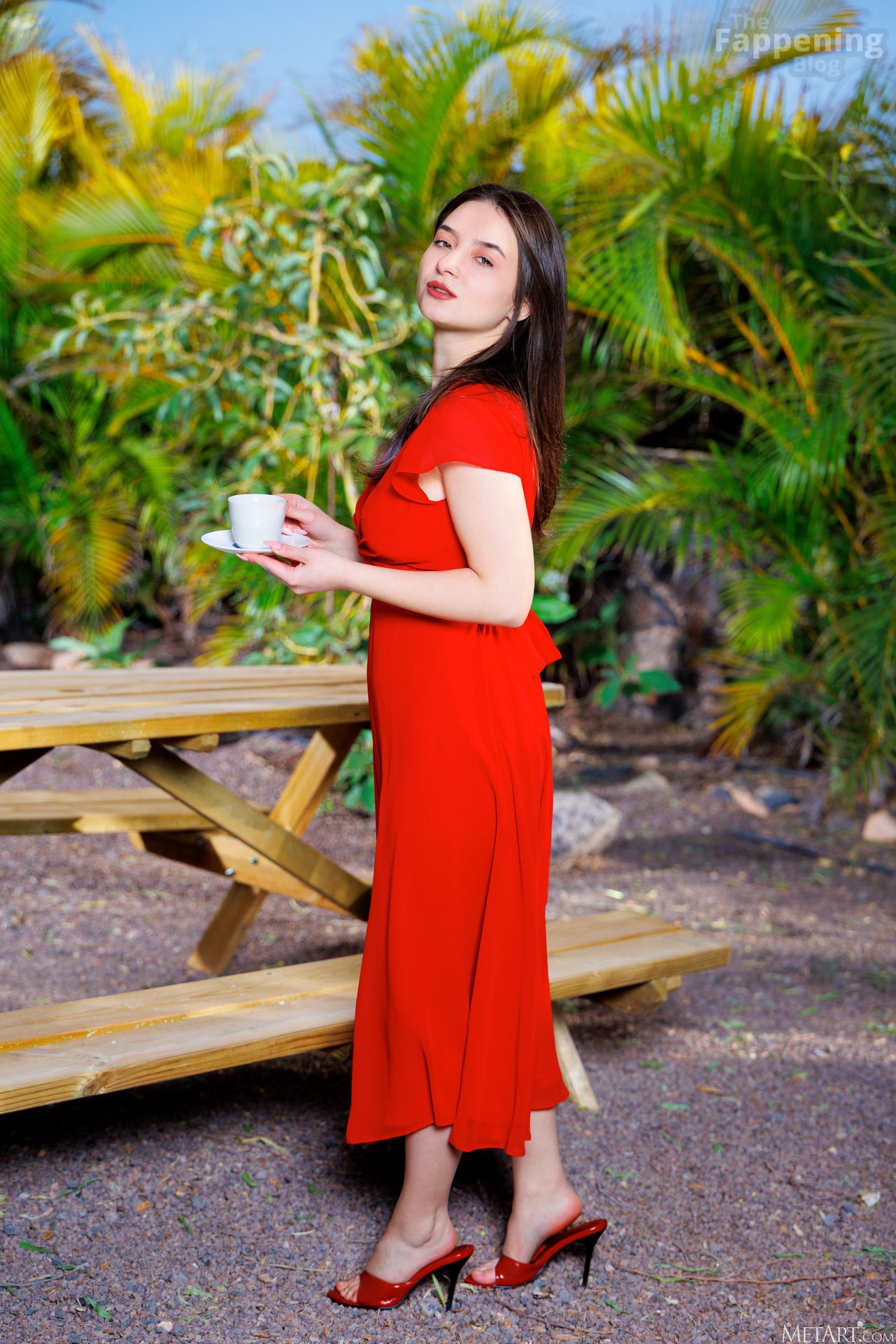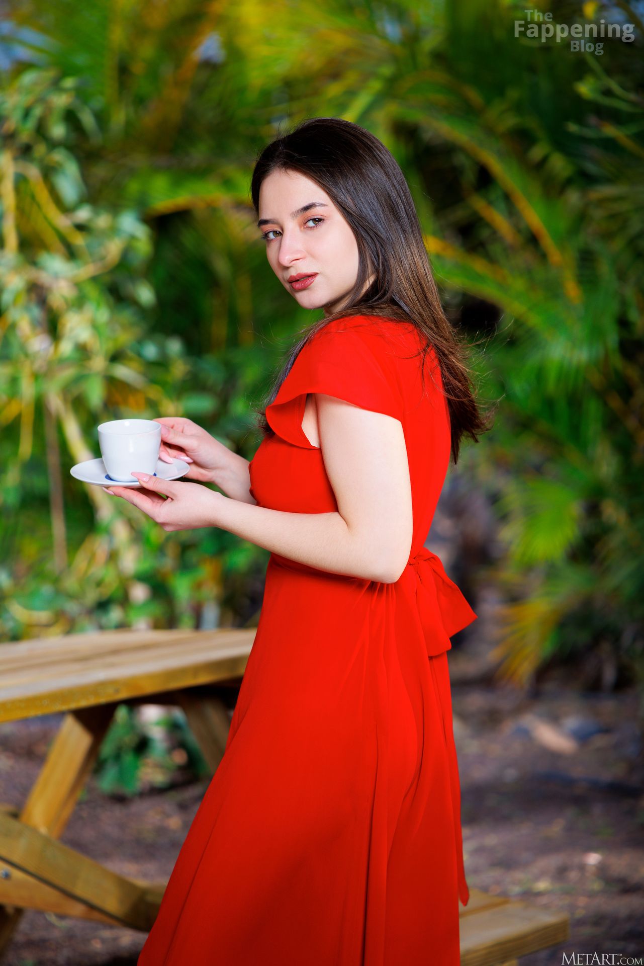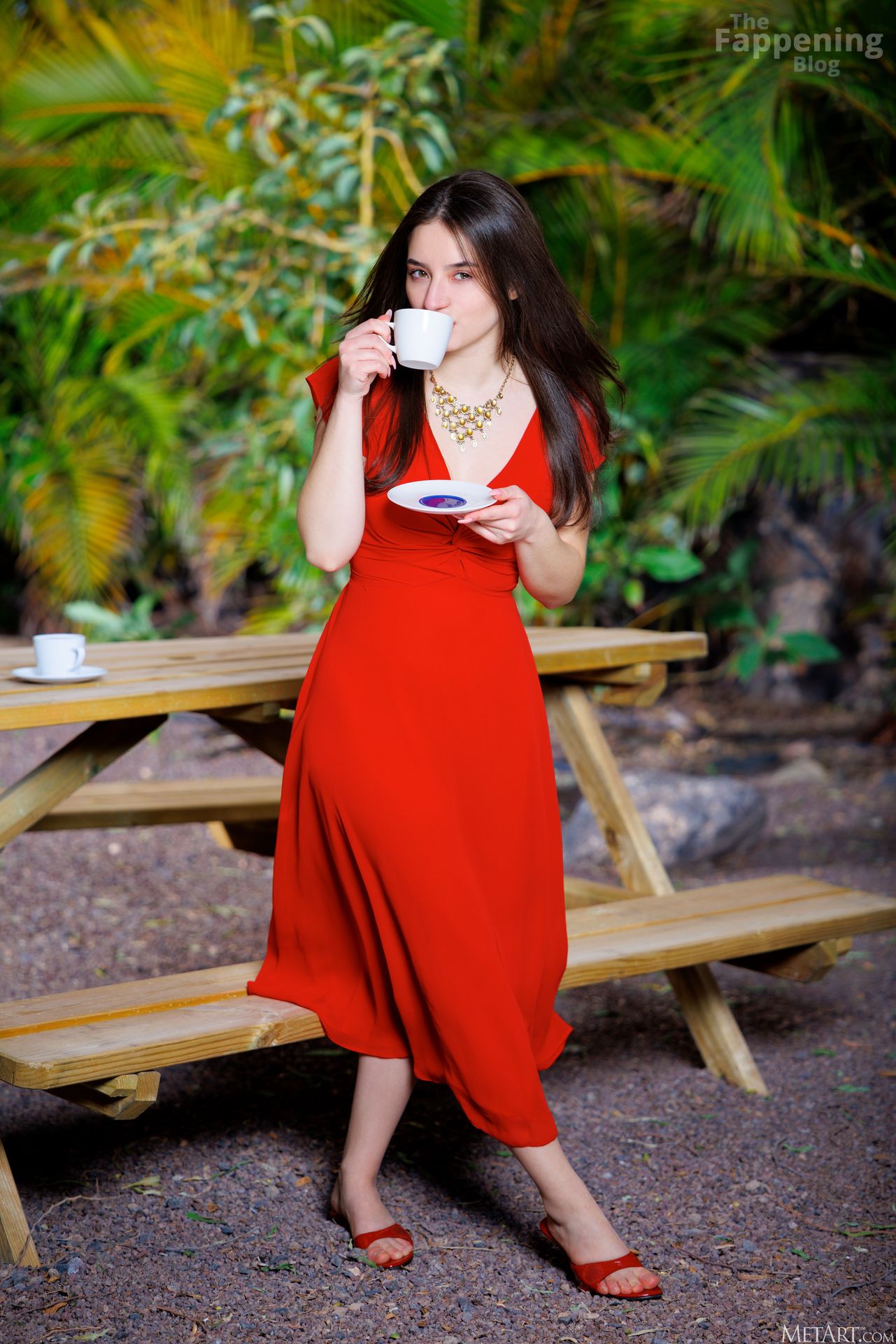Model Chloe Moss fica selvagem, posando nua em um banco de rua, mostrando suas partes cor-de-rosa. A deslumbrante de 20 anos veste um vestido vermelho, mal cobrindo com apenas uma pequena calcinha por baixo. Ela está toda sorridente, levantando o vestido para mostrar a parte de baixo.