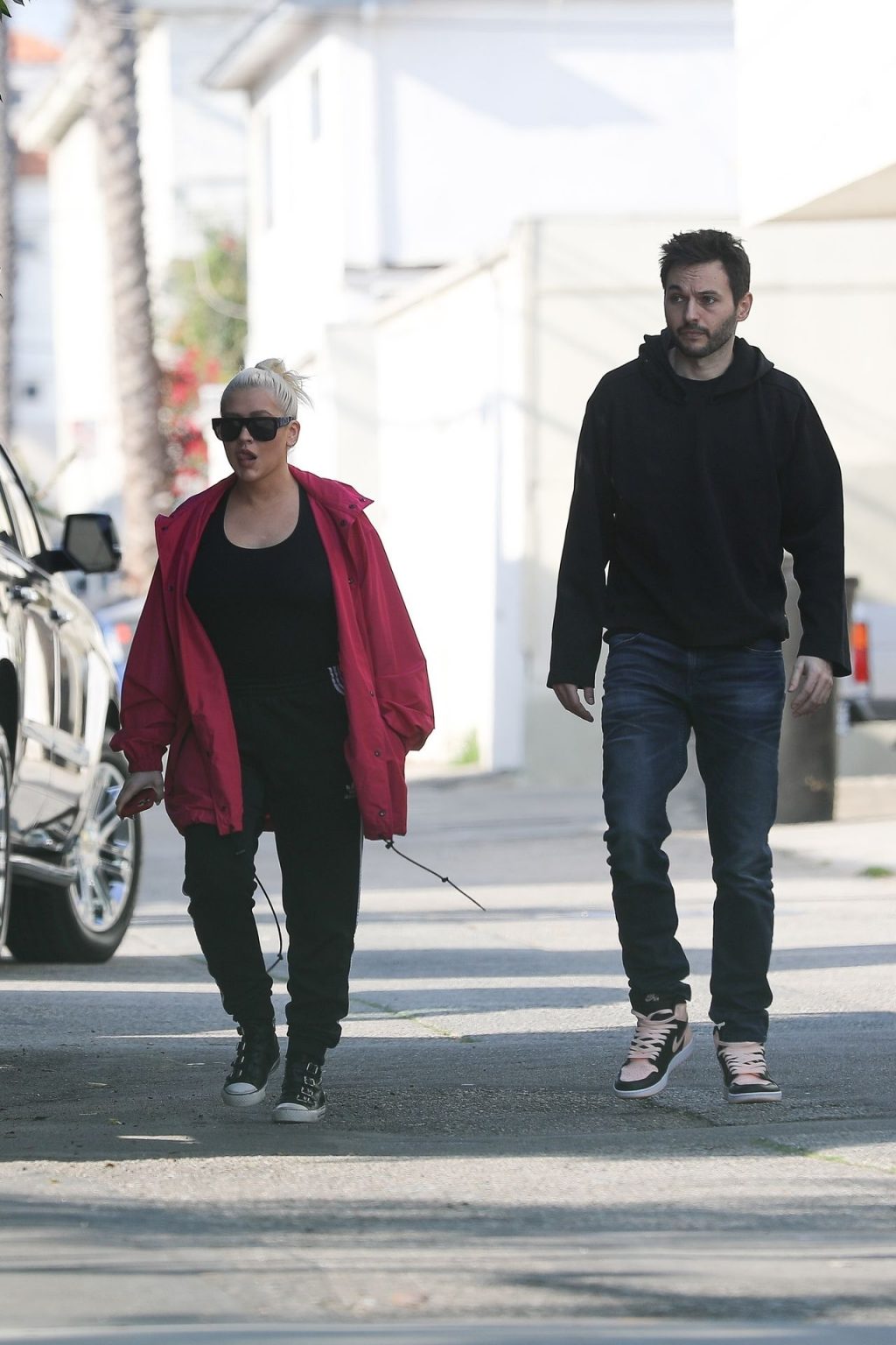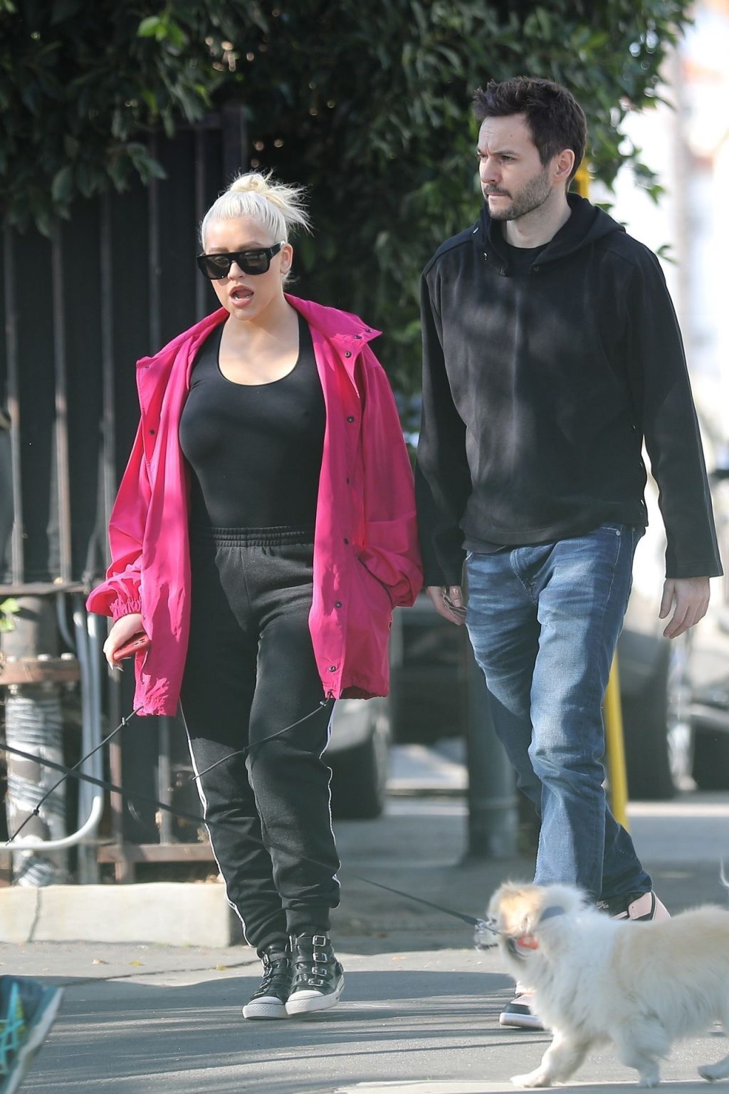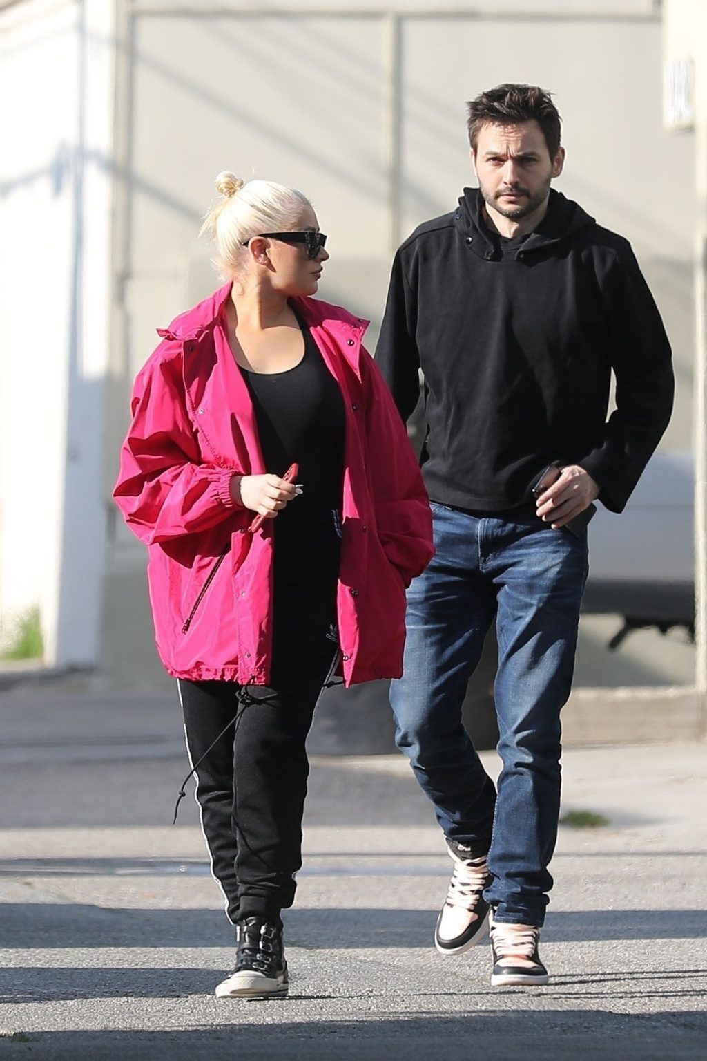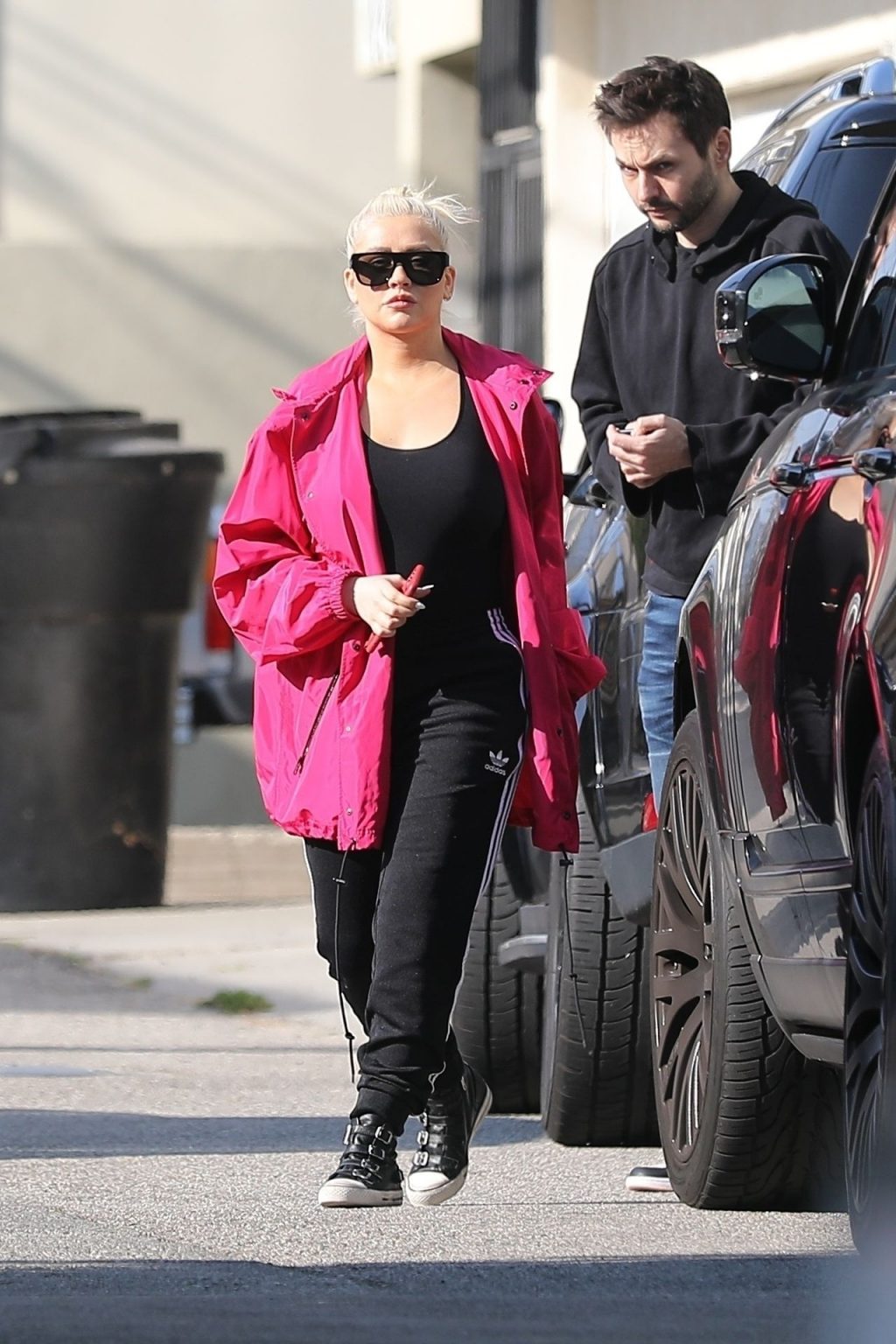 A cantora Christina Aguilera junto com seu parceiro Matthew Rutler chegam à escola de sua filha Summer Rain Rutler para buscá-la – Santa Monica, 14/01/2020. Christina veste um corta-vento Balenciaga rosa choque e óculos YSL. Ela exibe seu corpo em forma sem sutiã, revelando seus seios através de sua blusa preta transparente.